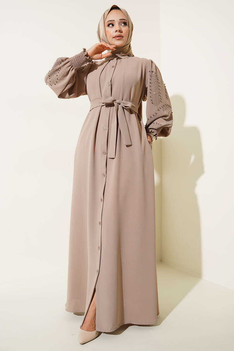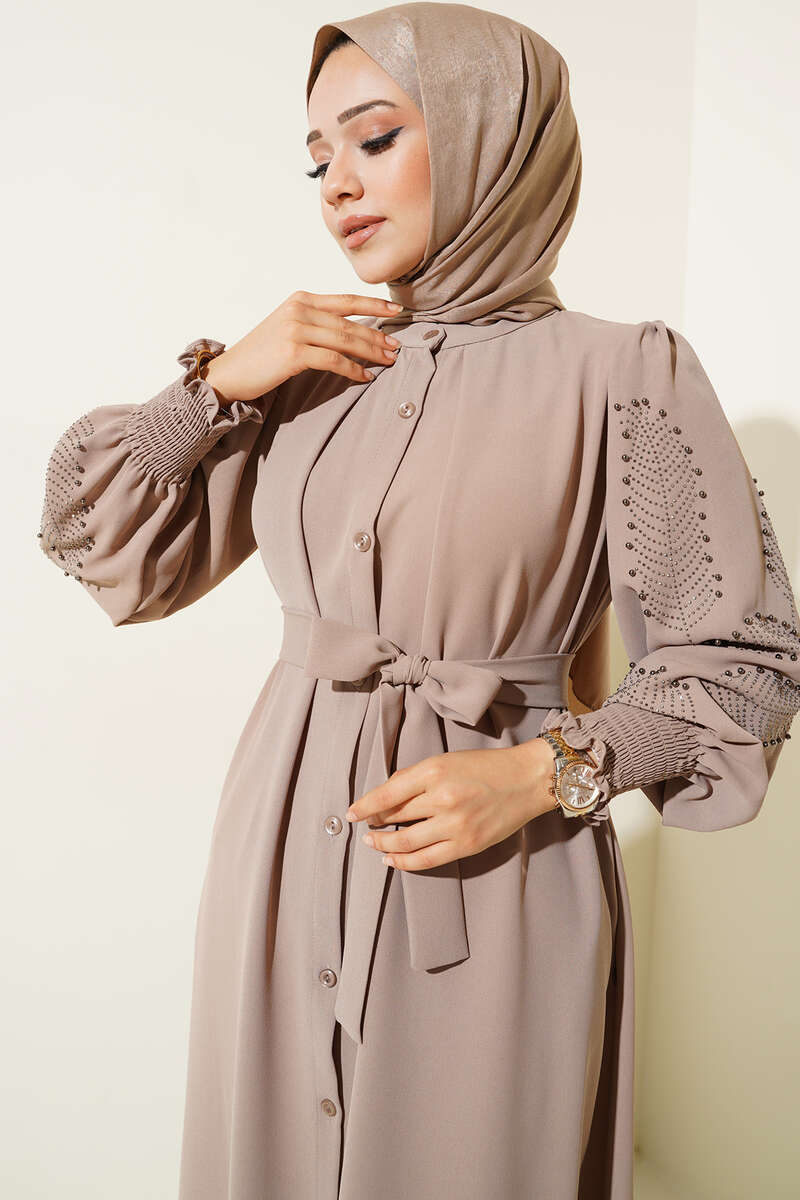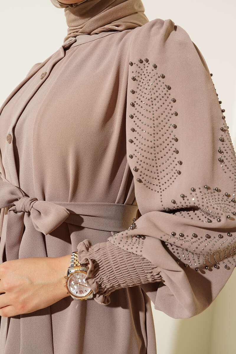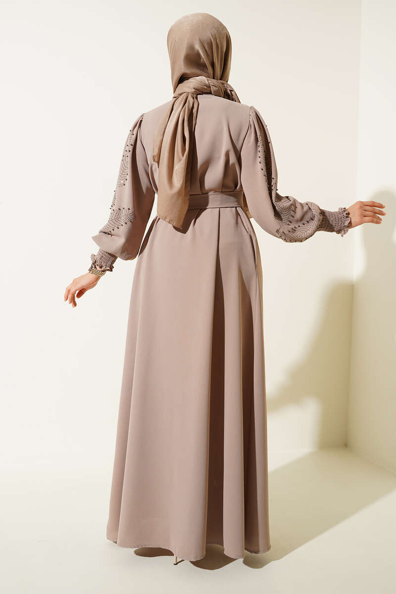 Kolları Taşlı Kuşaklı Elbise Vizon