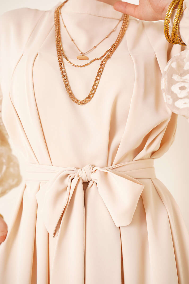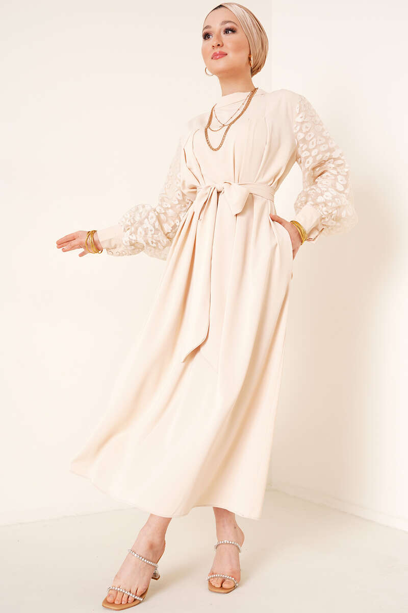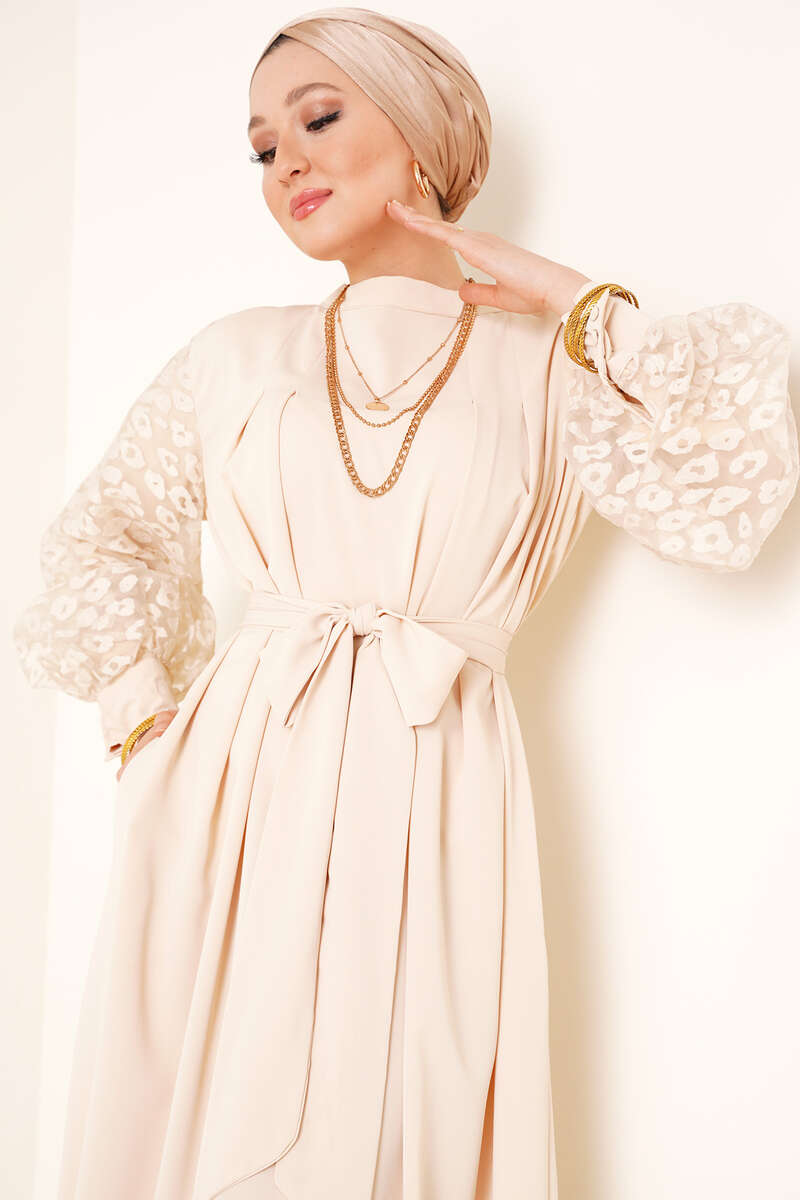 Yeni sezon elbisemizin kolları desenli tüldür. Manşetleri geniş ve üç düğmelidir. Hakim yaka olan elbisemizin göğsü pileli detaylıdır. Beli kuşaklıdır. Ense düğmesi bulunmaktadır.