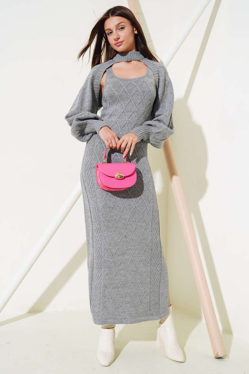 Yakası Yarım Fermuarlı Triko Elbise Kahve