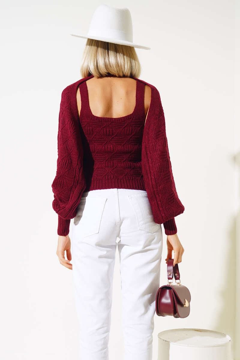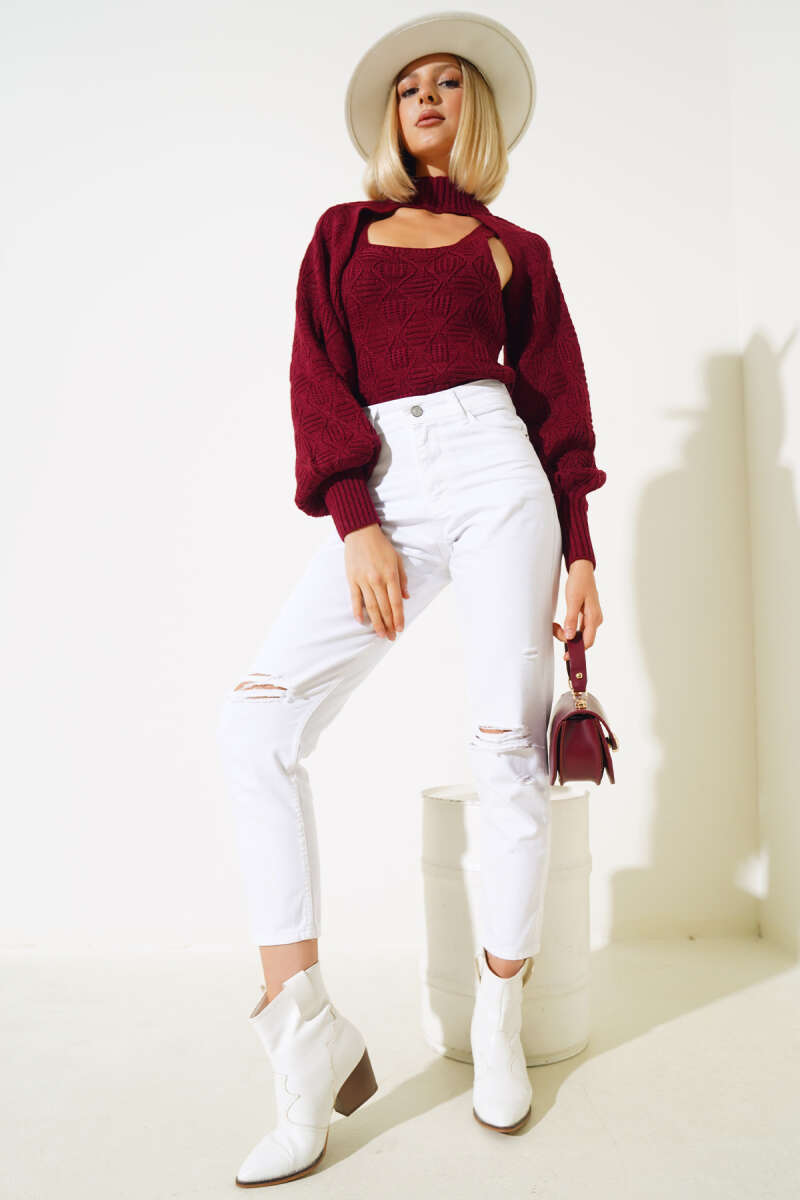 Atkı Detaylı Çizgili Triko İkili Takım Bordo