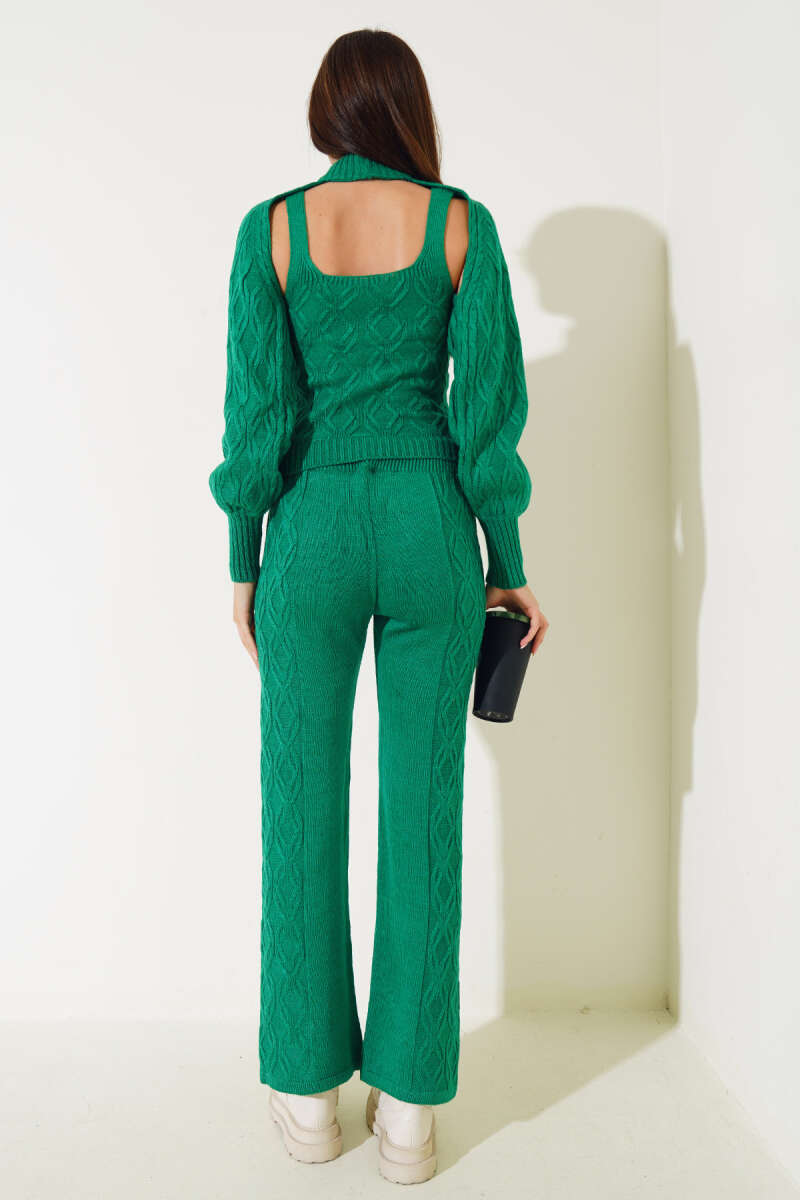 Çizgi Kabartmalı Triko Kazak Yağ Yeşili