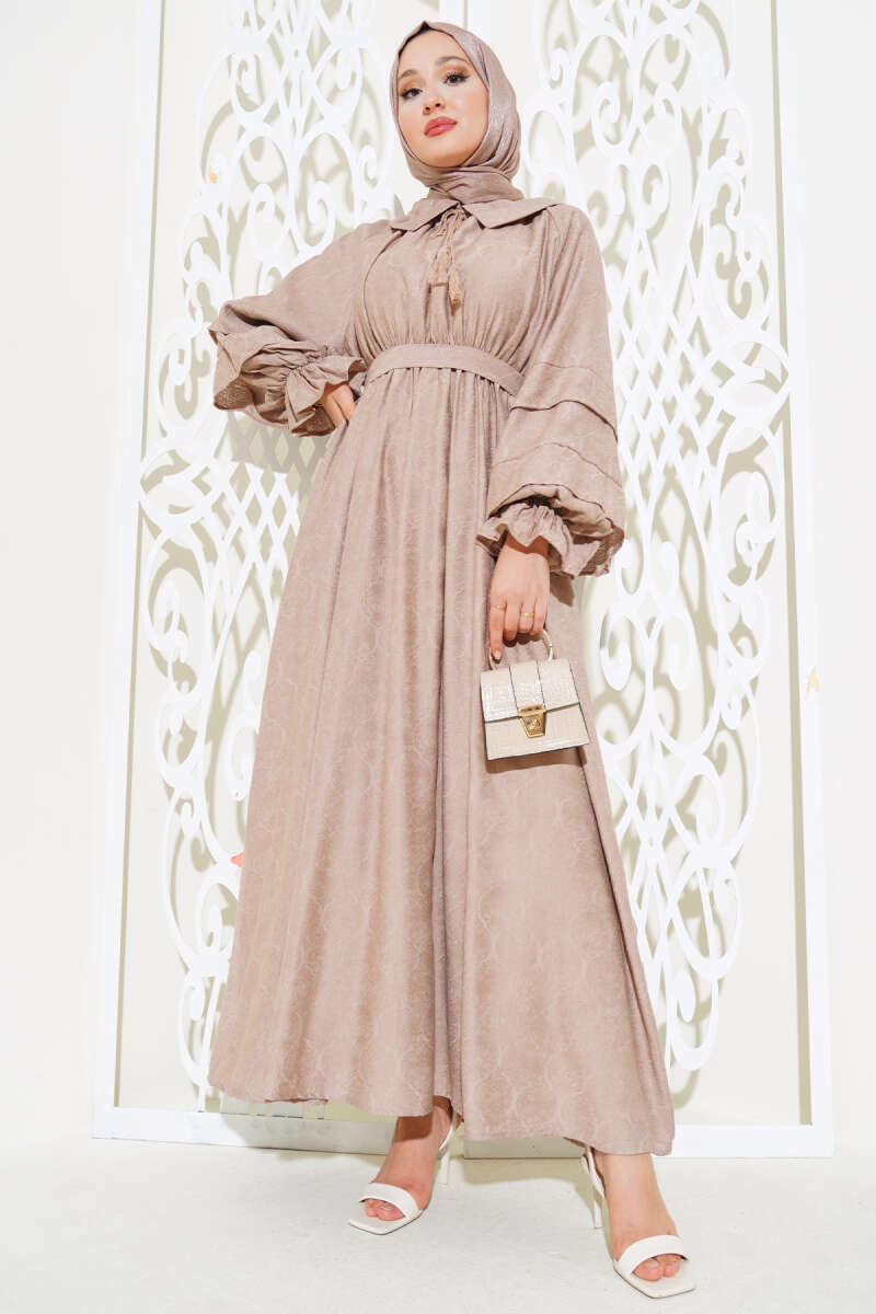 Kolu Katlı Kuşaklı Elbise Ekru