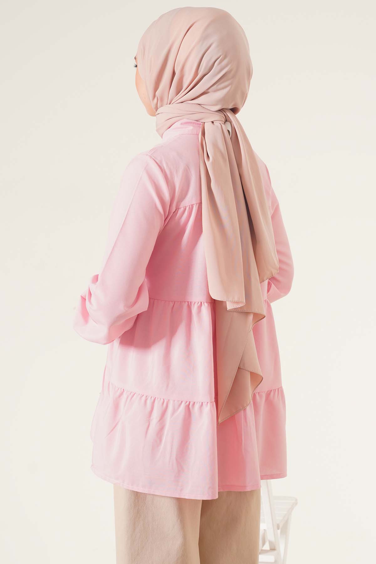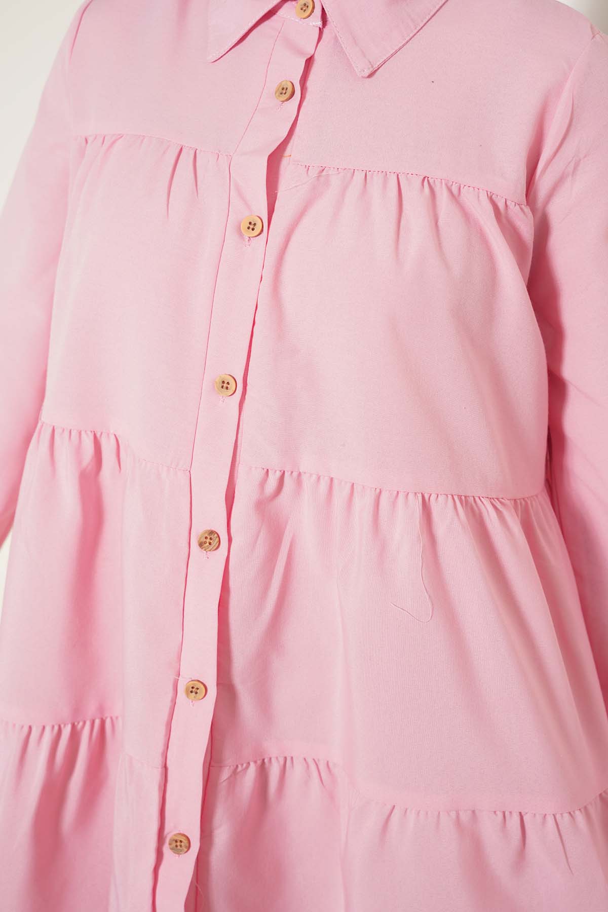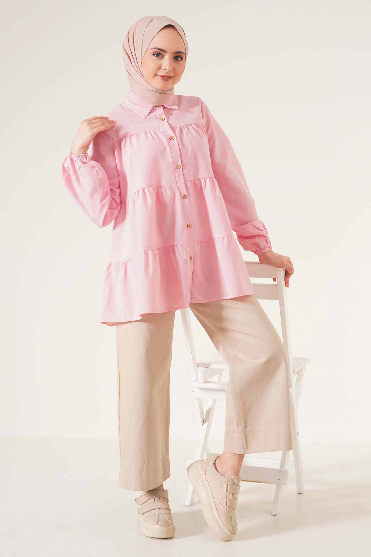 Klasik gömlek tuniğe kat detayları ile şıklık katan ürünümüzün bilekleri lastiklidir. Yakadan eteğe düğmeli olup aktif olarak kullanılabilmektedir.