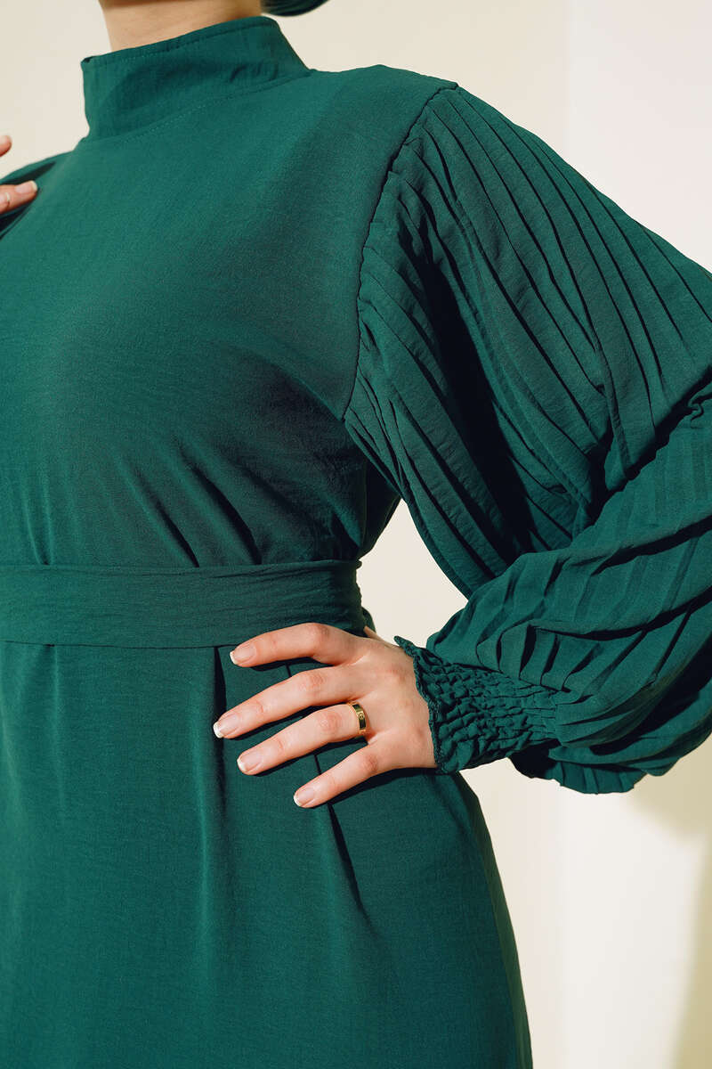 Yeni sezon elbisemiz şık duruşuyla sizlerle beraber. Elbisemiz dik yaka olup, enseden düğmeli modeldir. Astarsızdır. Kolları piliseli elbisemizin, kol bilekleri gipelidir. Kendi kumaşından kuşağı bulunmaktadır. Elbisemiz şık tasarımıyla favoriniz olacak. Renk seçenekleri vardır.