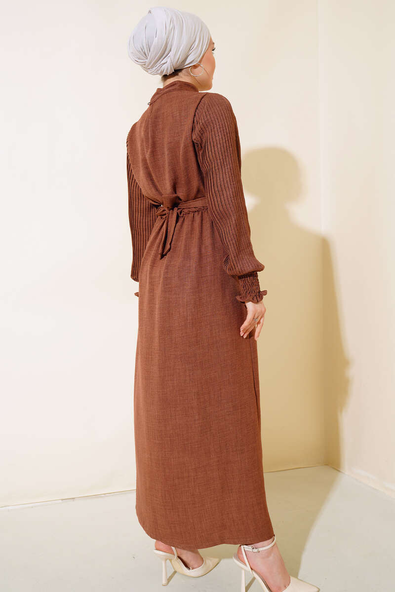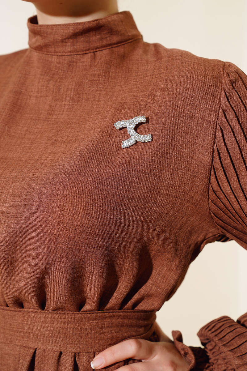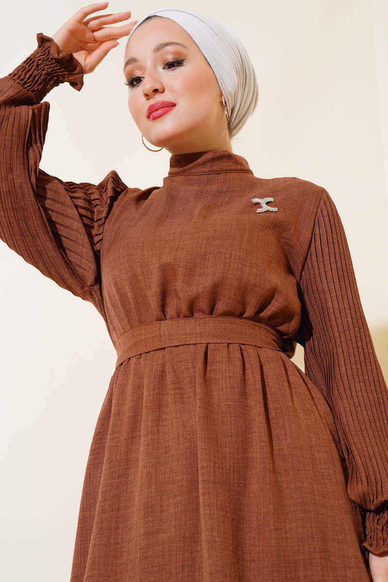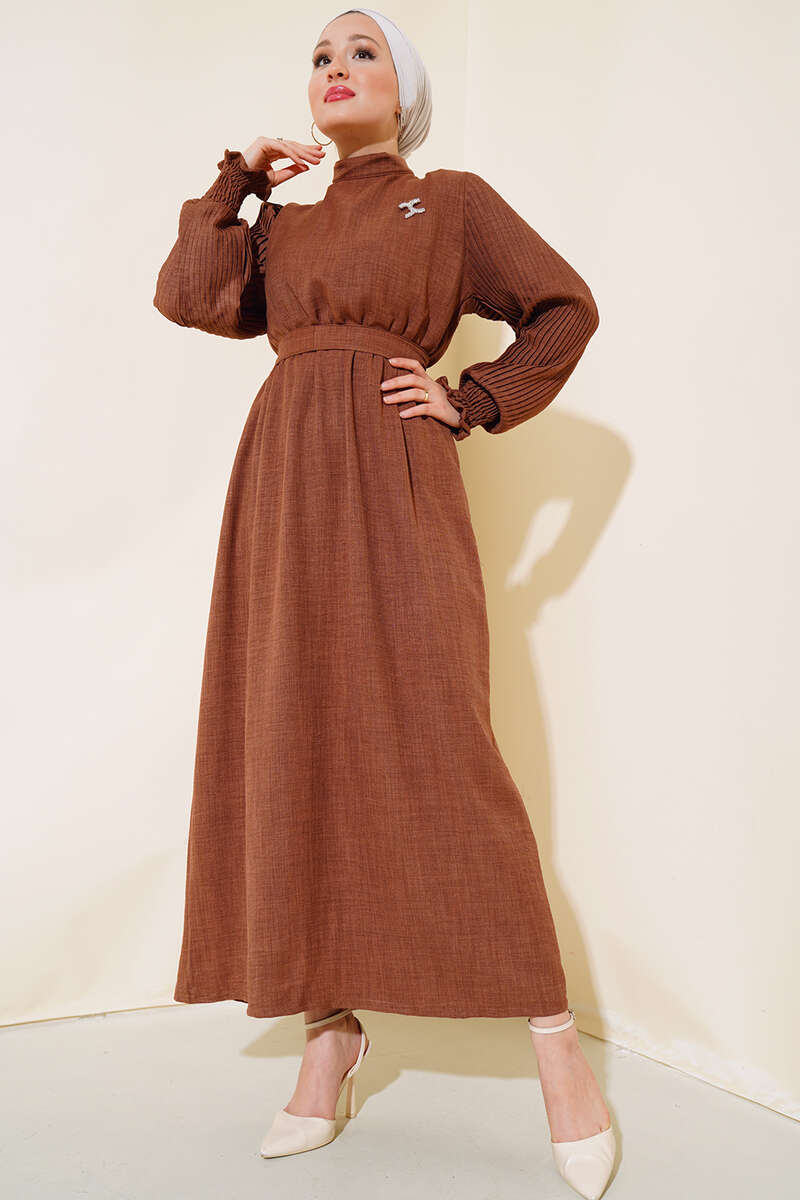 Yeni sezon model elbisemiz dikkat çeken tasarımıyla sizler için geldi. Elbisemizin Kolları piliseli olup, kol bilekleri gipelidir. Elbisemiz dik yakadır. Ense kısmı düğmelidir. Elbisemizin beli lastikli olup, kendi kumaşından kuşağı bulunmaktadır. Broşludur. Renk seçenekleriyle dolabınızda yerini beklemektedir.