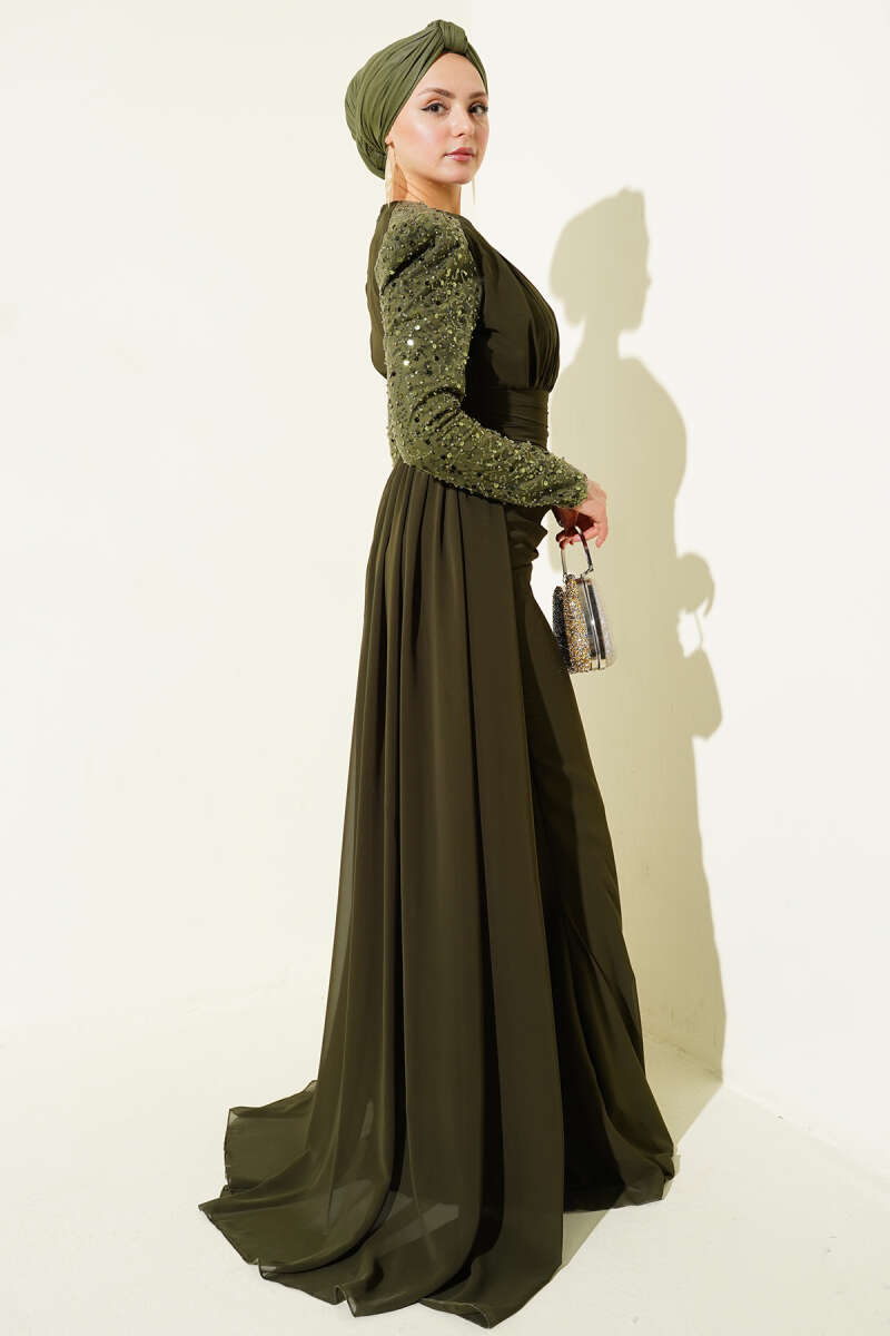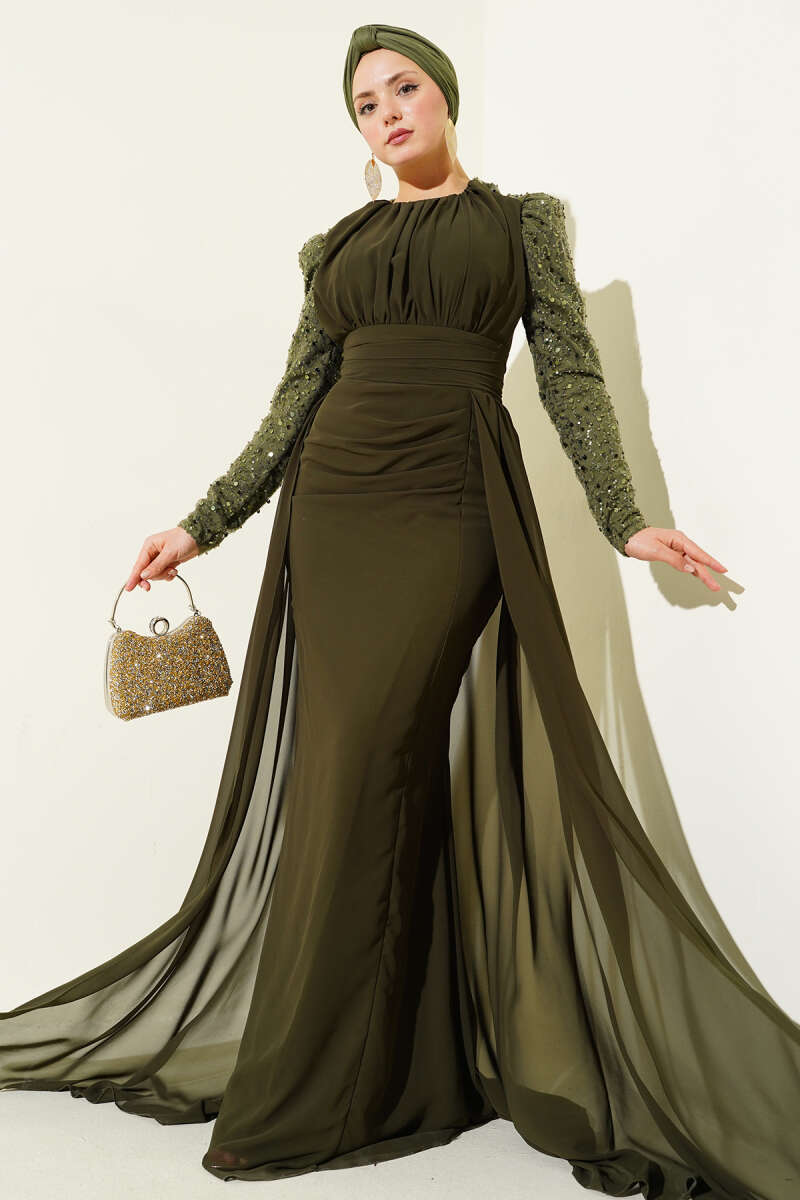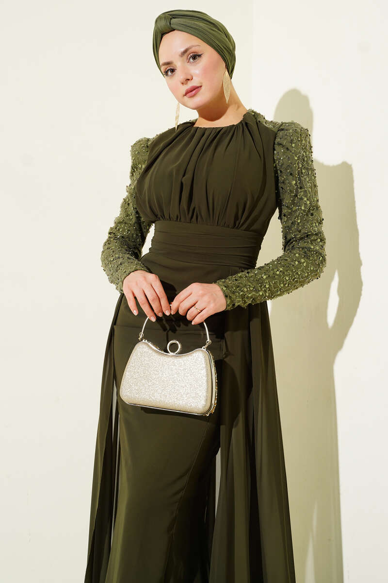 Kolu Pul Detaylı Pelerinli Abiye Elbise Haki