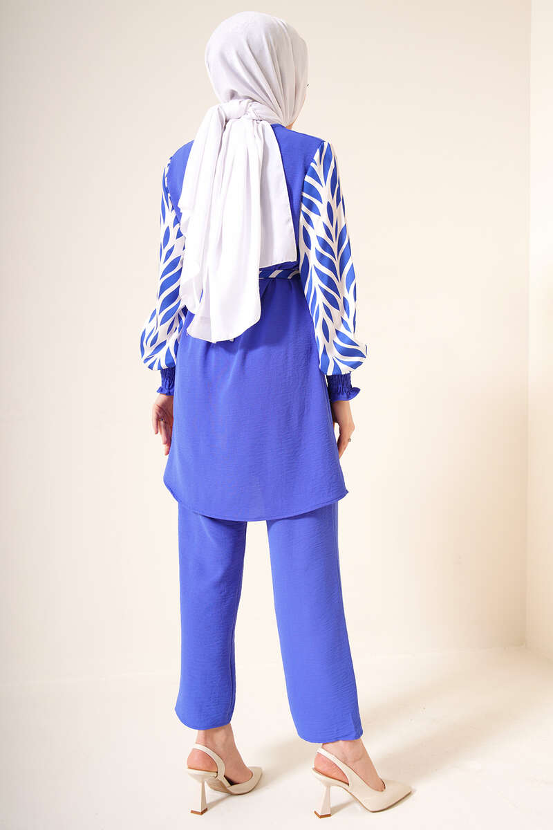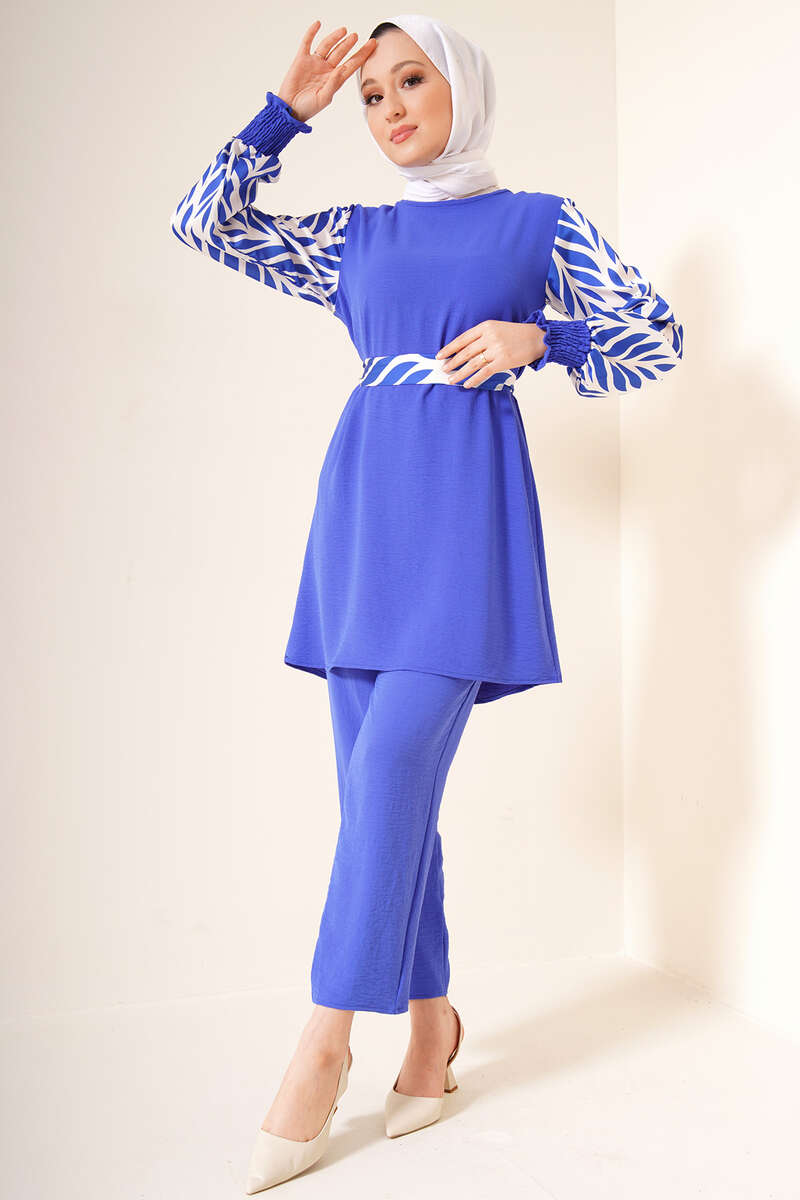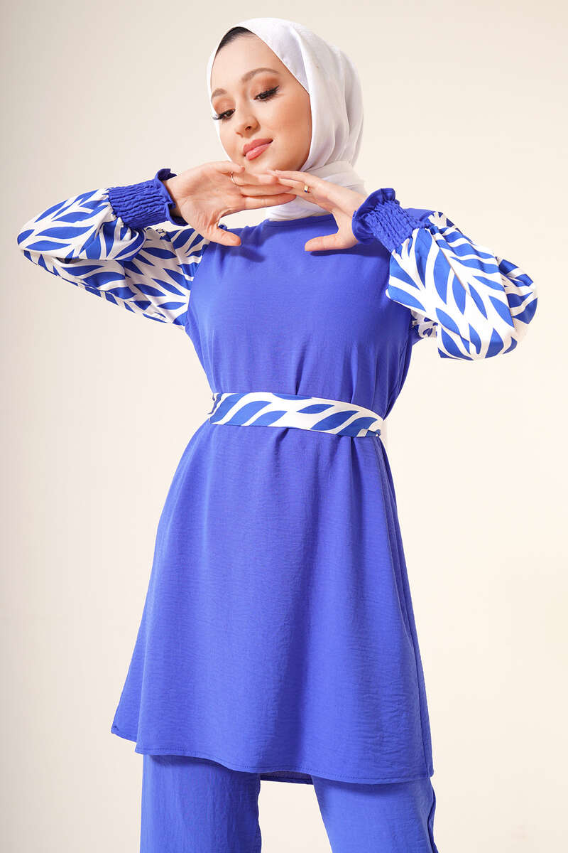 Yeni sezon ikili takım şık görünümüyle sizler için geldi. Takımımız ayrobin kumaştır. Oldukça rahat yapıdadır. Tuniğmizin kolları ve kuşağı desenli satendir. Bilekleri büzgülü lastiklidir. Ensesinde kuş gözü ve düğme bulunmaktadır. Pantolon beli lastikli cepsiz modeldir. Takımımızı her ortamda rahatlıkla giyebilirsiniz. Farklı renk seçenekleri mevcuttur.