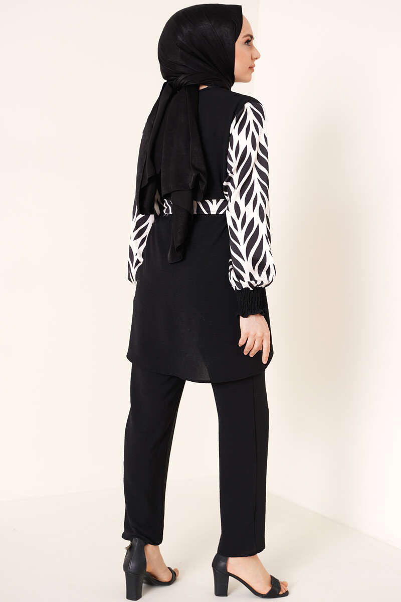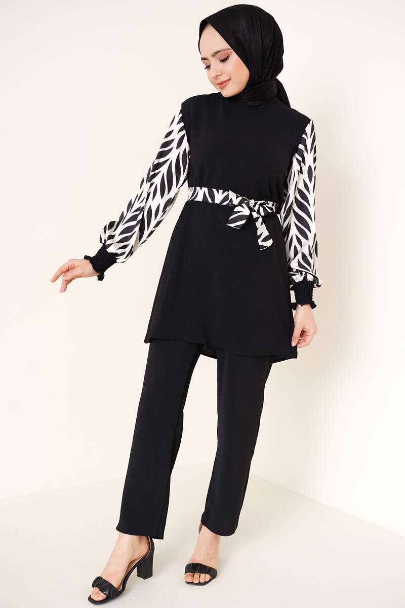 Yeni sezon ikili takım şık görünümüyle sizler için geldi. Takımımız ayrobin kumaştır. Oldukça rahat yapıdadır. Tuniğmizin kolları ve kuşağı desenli satendir. Bilekleri büzgülü lastiklidir. Ensesinde kuş gözü ve düğme bulunmaktadır. Pantolon beli lastikli cepsiz modeldir. Takımımızı her ortamda rahatlıkla giyebilirsiniz. Farklı renk seçenekleri mevcuttur.