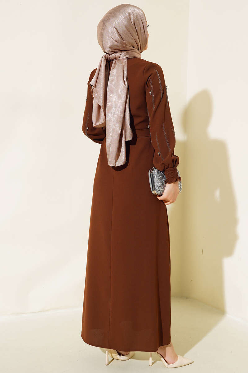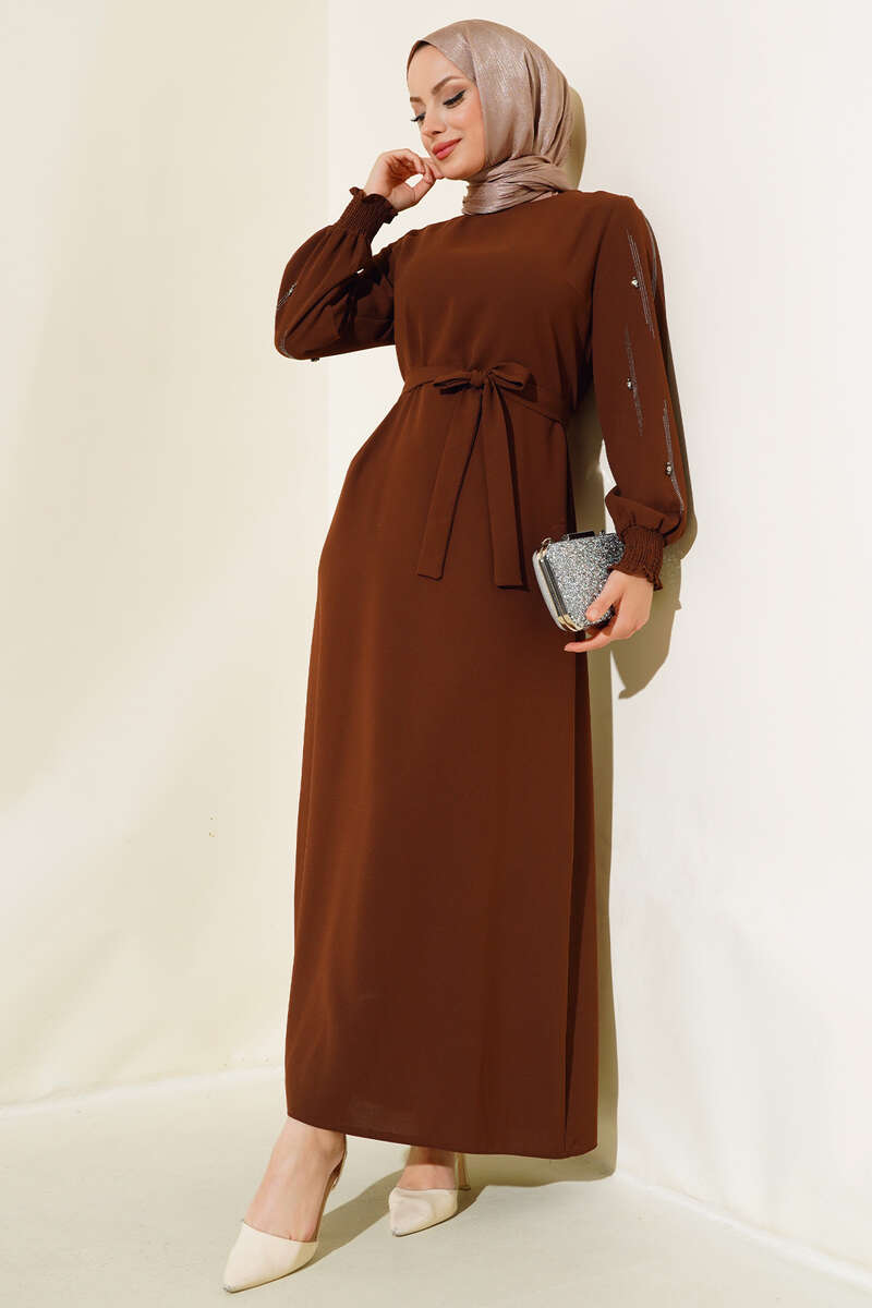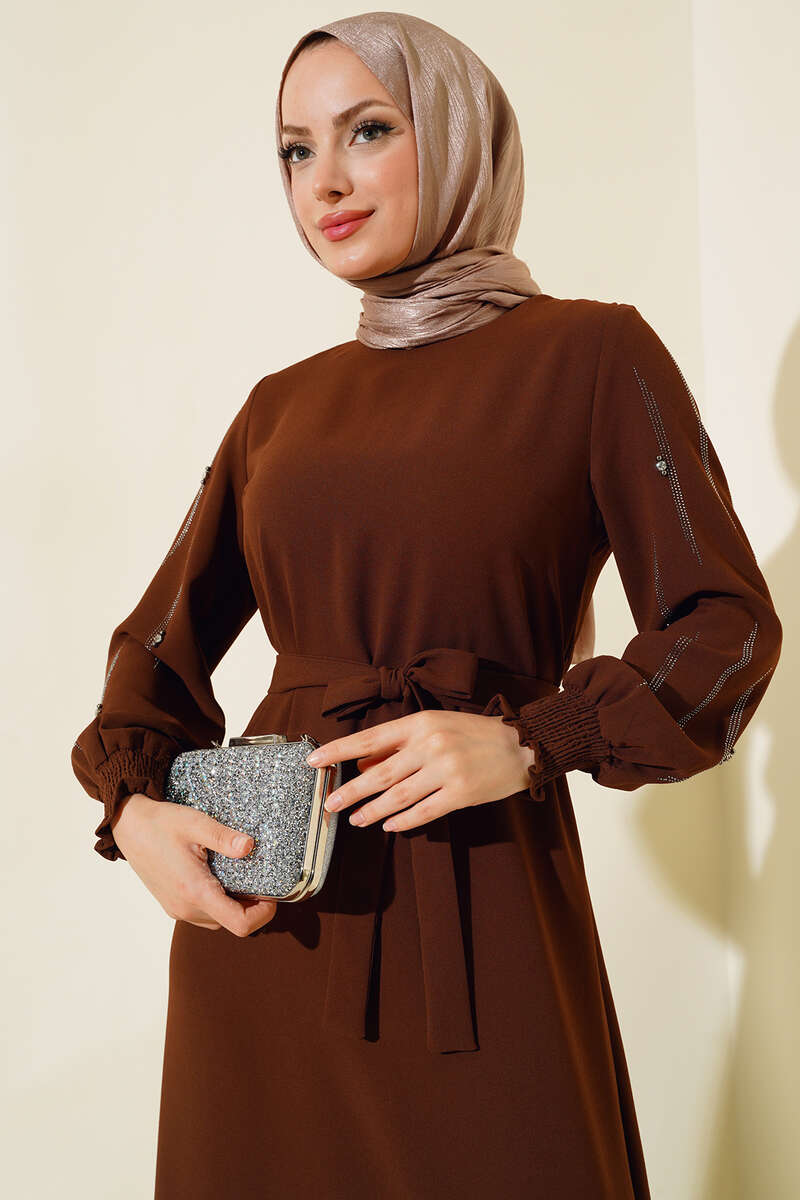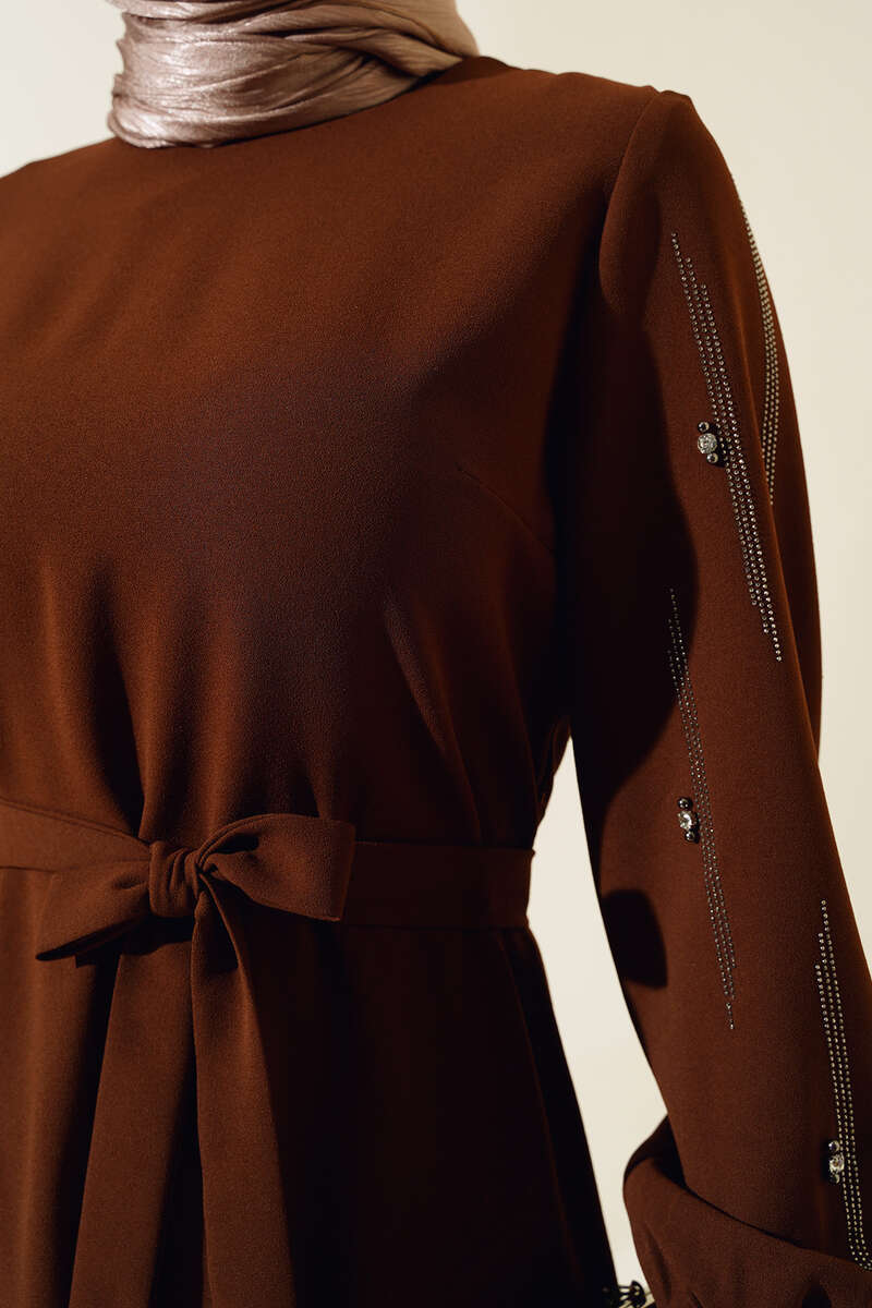 Kolu Taş Süslemeli Kuşaklı Elbise Kahve