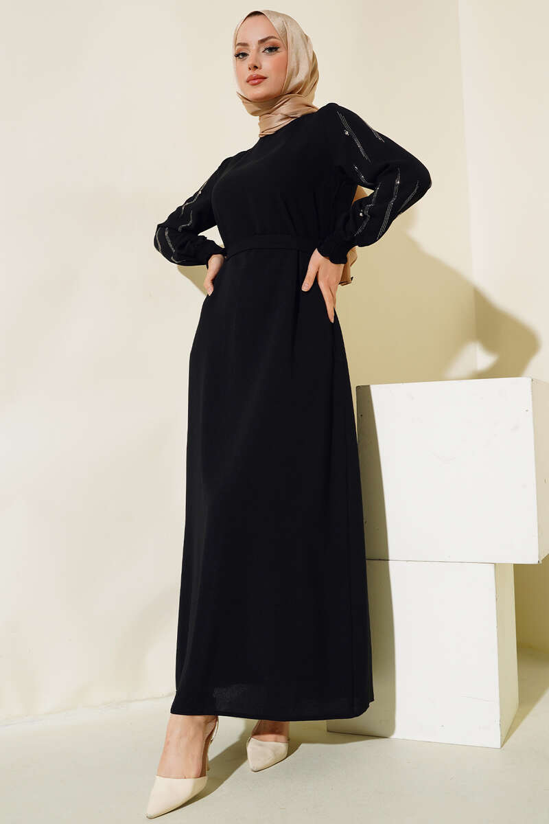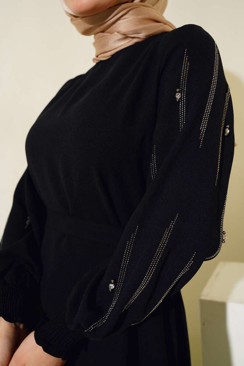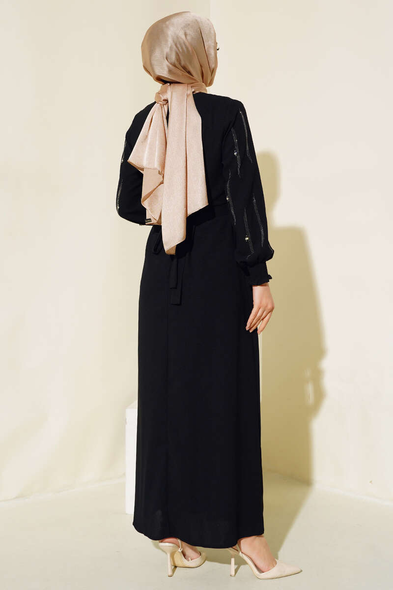 Yeni sezon elbisemiz sizlerle beraber. Elbisemizin kolu taşlarla süslenmiştir. Sırtı fermuarlıdır. Kol bilekleri gipelidir. Elbisemizin iki adet kemer köprüsü olup, kendi kumaşından kuşağı vardır. Astarsızdır. Şık ve zarif tasarımıyla özel günlerinizde ışıldamanızı sağlayacak. Renk seçenekleri mevcuttur.
