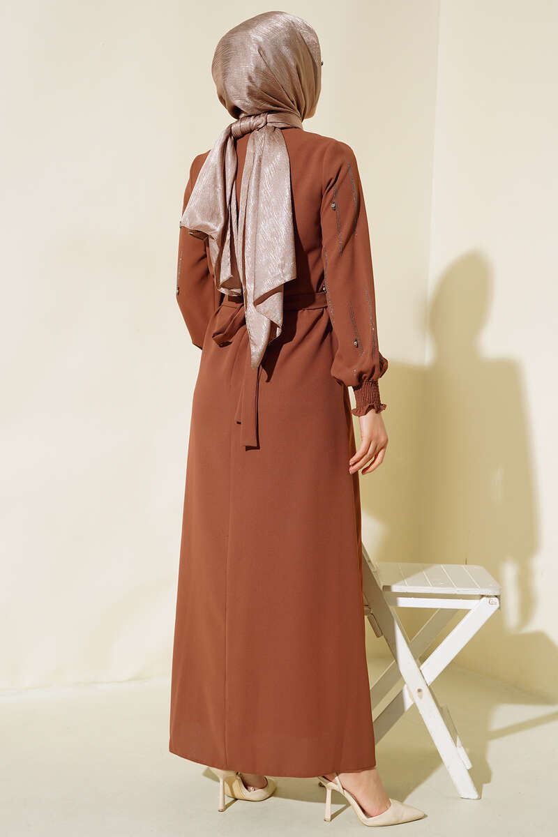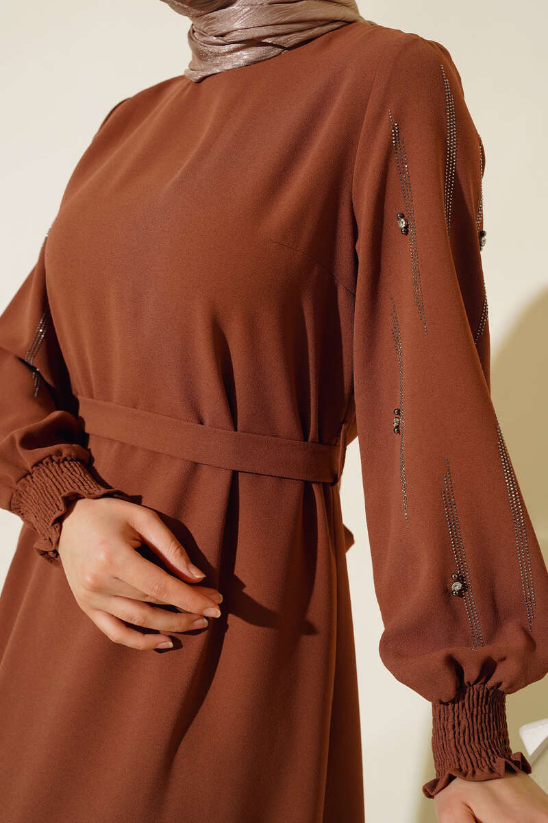 Yeni sezon elbisemiz sizlerle beraber. Elbisemizin kolu taşlarla süslenmiştir. Sırtı fermuarlıdır. Kol bilekleri gipelidir. Elbisemizin iki adet kemer köprüsü olup, kendi kumaşından kuşağı vardır. Astarsızdır. Şık ve zarif tasarımıyla özel günlerinizde ışıldamanızı sağlayacak. Renk seçenekleri mevcuttur.