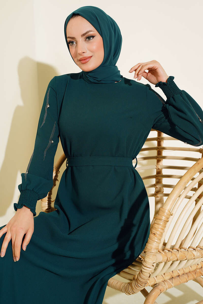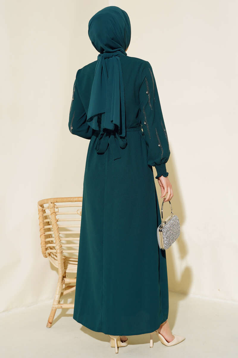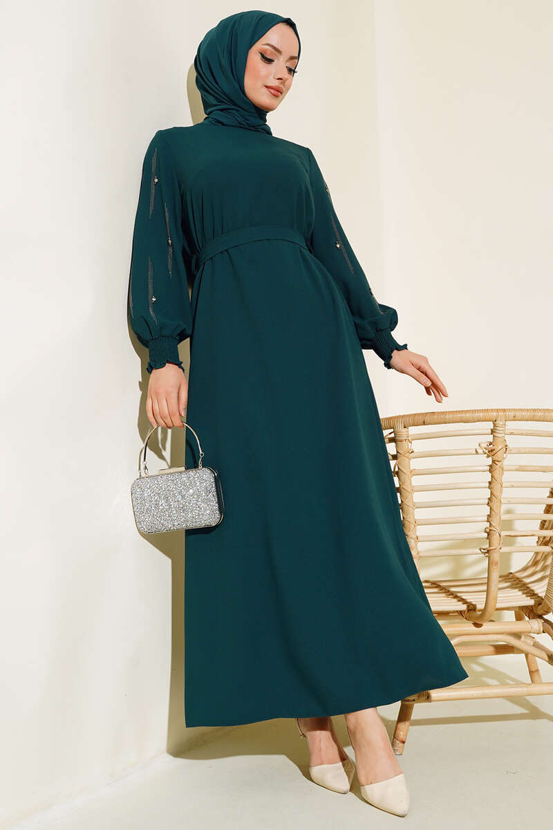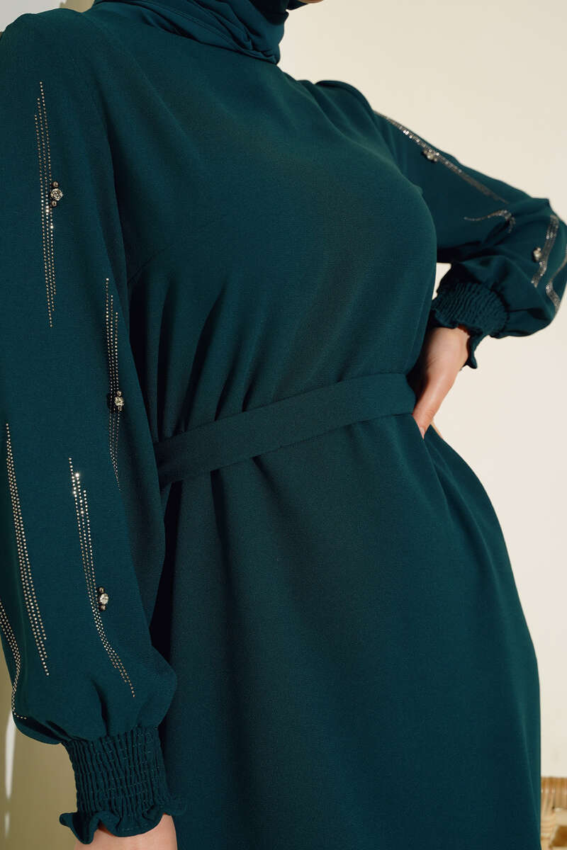 Kolu Taş Süslemeli Kuşaklı Elbise Zümrüt Yeşili