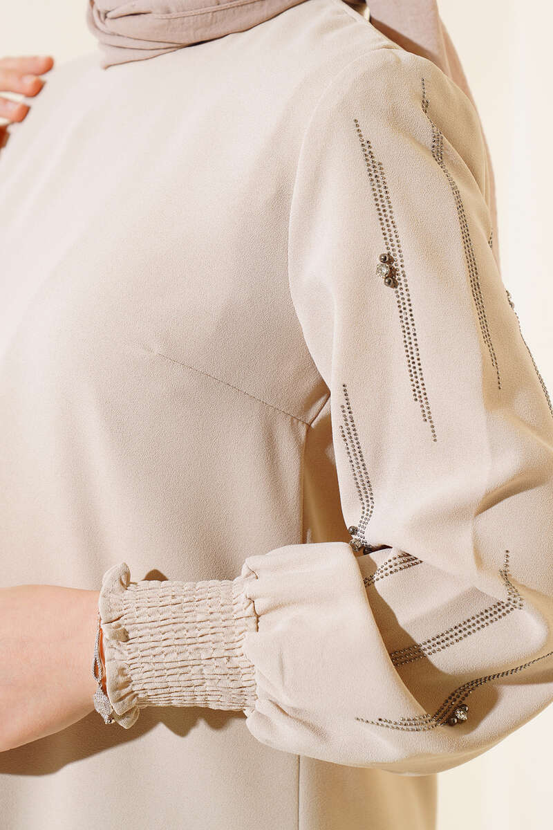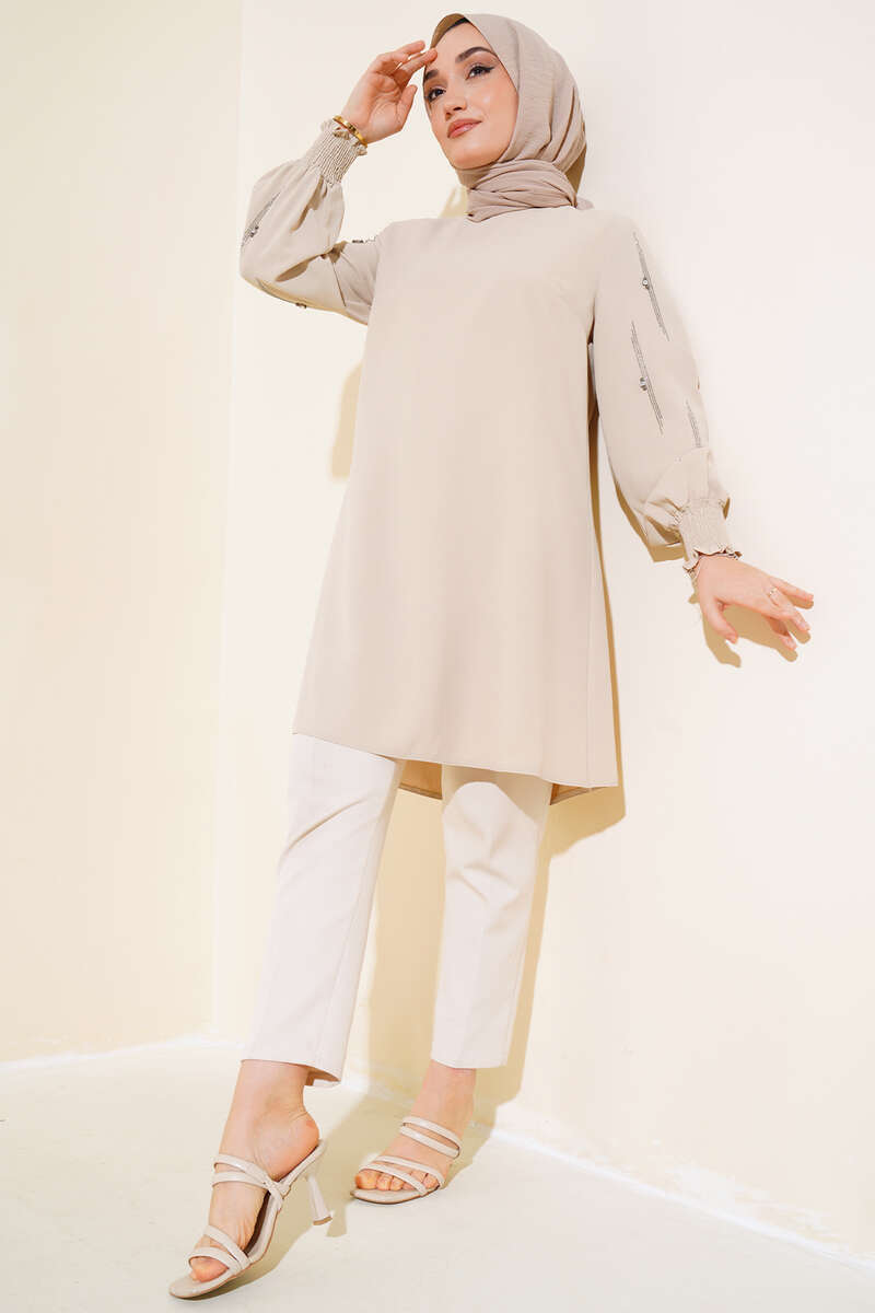 Yeni sezon tunik modelimiz sizlerle beraber. Tuniğimizin kolları taş süslemelidir. Kol bilekleri gipelidir. Tuniğimizin sırtı fermuarlıdır. Şık ve modern tunik modelimiz özel günlerinizin favori parçası olacaktır. Renk seçenekleri mevcuttur.