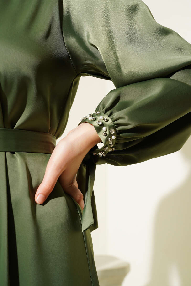 İp Kuşaklı Kare Ajurlu Triko Elbise Zümrüt