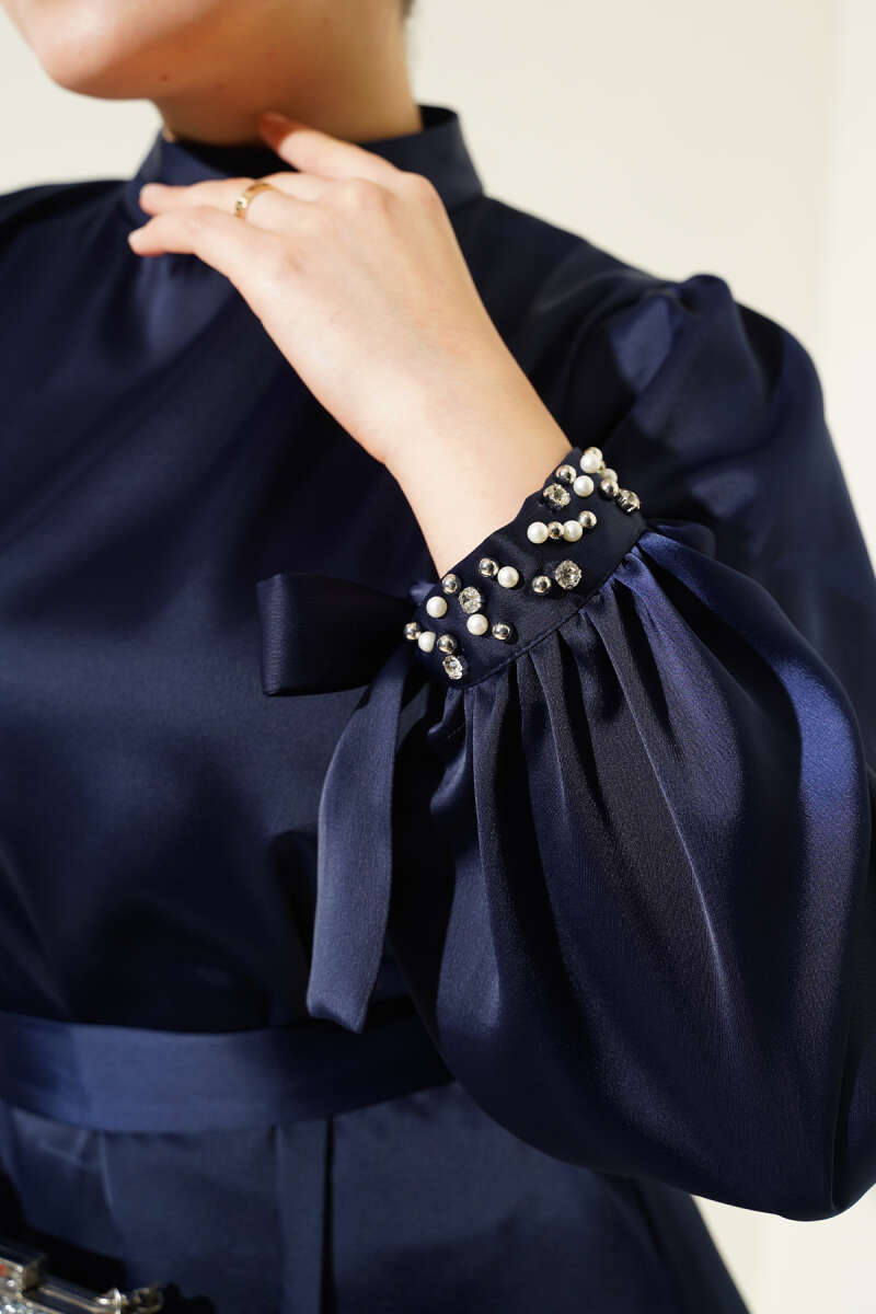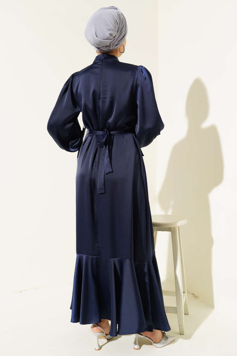 Kolu Taşlı Bağlamalı Saten Abiye Elbise Lacivert