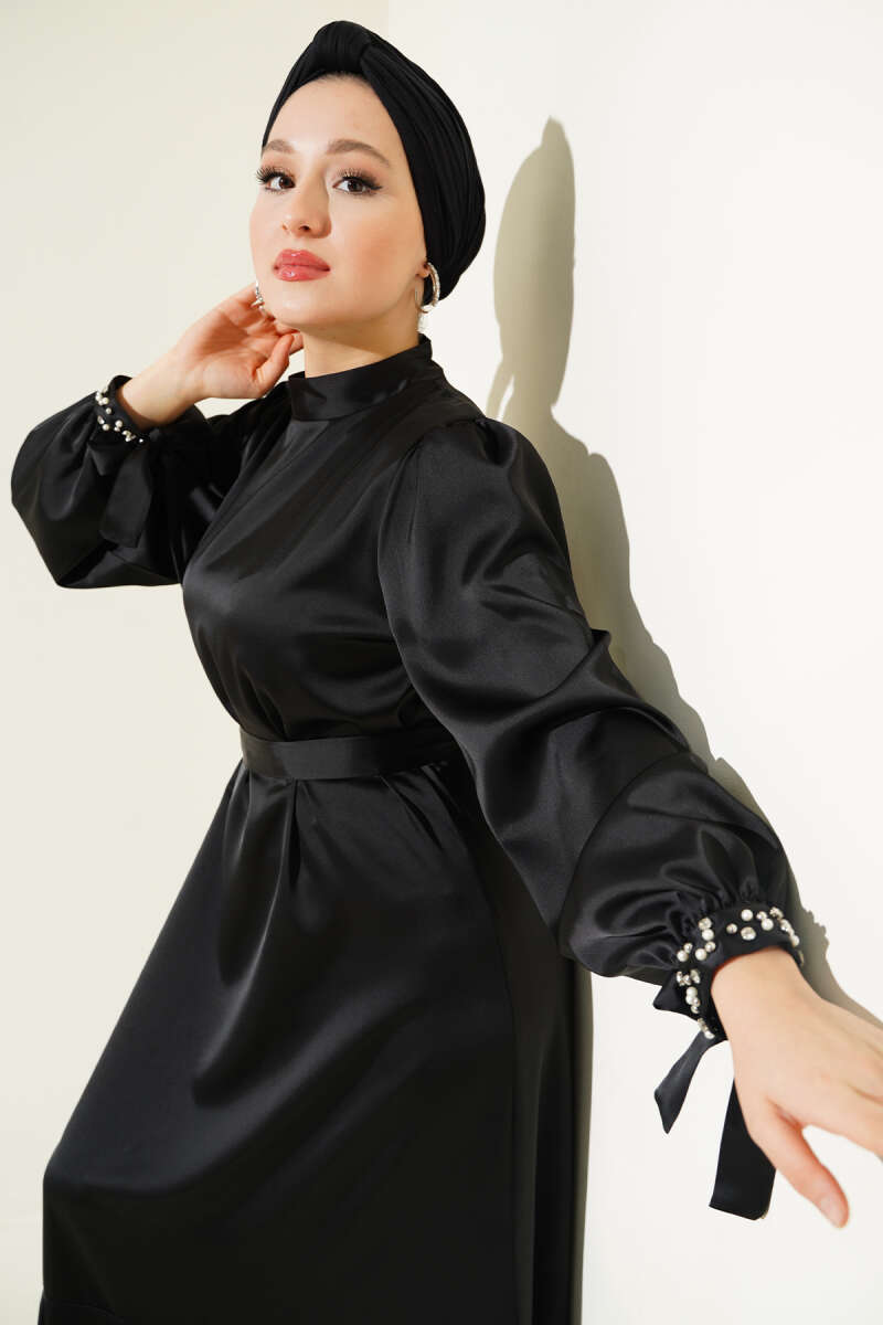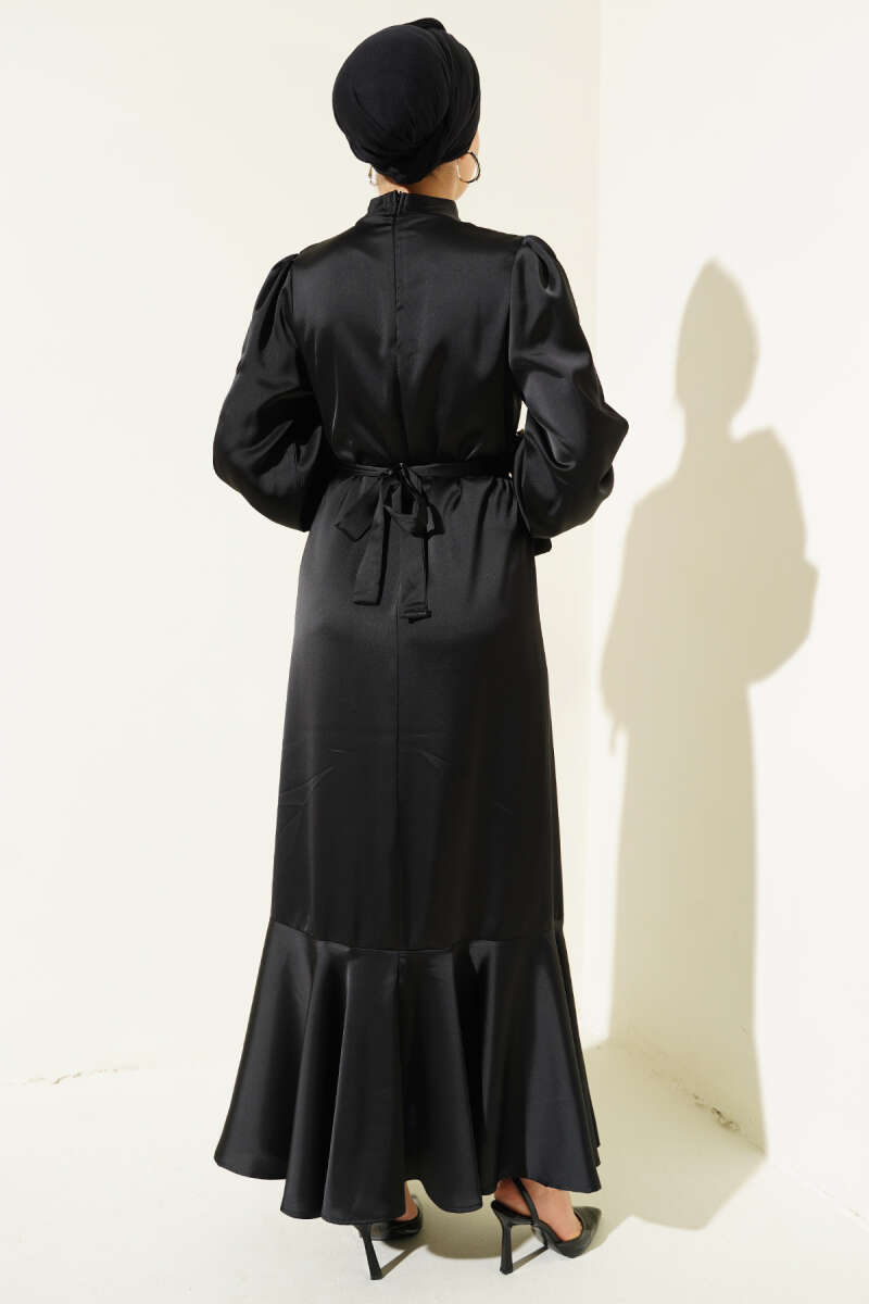 Bilek Bağlamalı Katlı Elbise Siyah