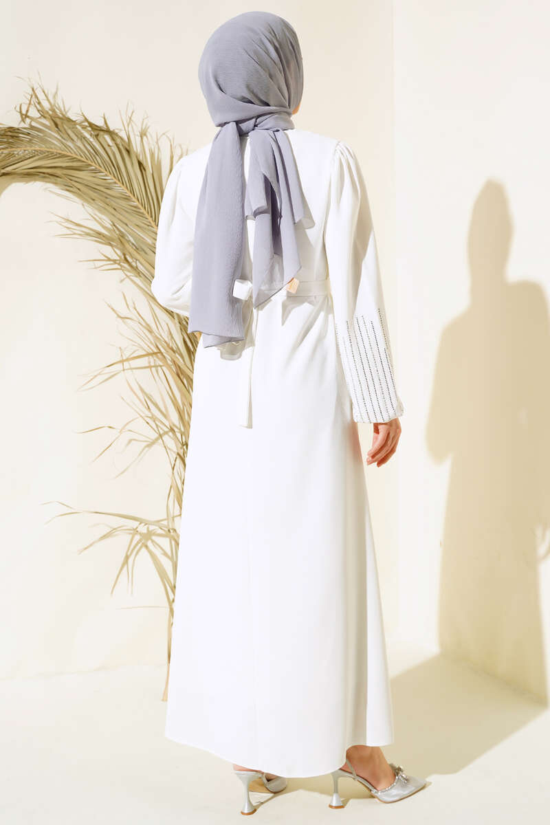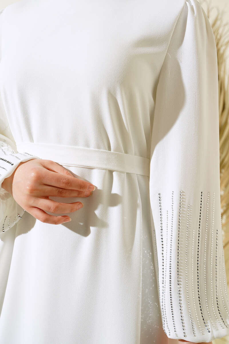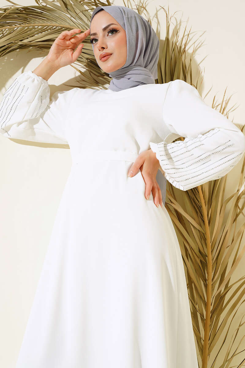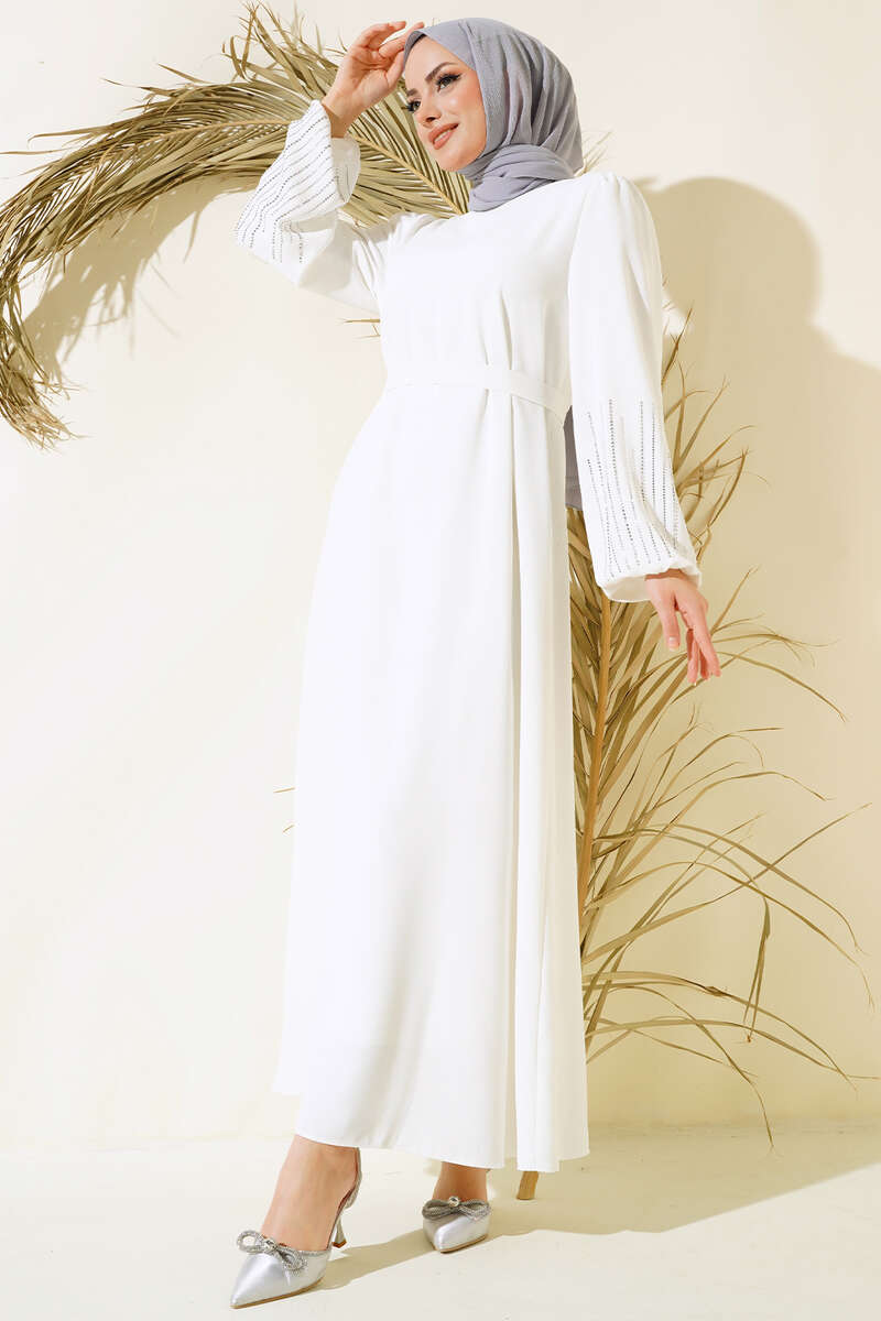 Yeni sezon elbisemiz sizler için geldi. Elbisemizin kolu taşlarla süslenmiştir. Oval yakadır. Sırtı fermuarlı olup, kolay kullanım sağlanmıştır. Elbisemizin kendi kumaşından kuşağı vardır. Astarsızdır. Kloş modeldir. Elbisemiz şık ve zarif tasarımıyla sizleri beklemektedir. Renk seçenekleri mevcuttur.