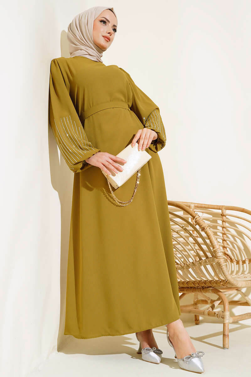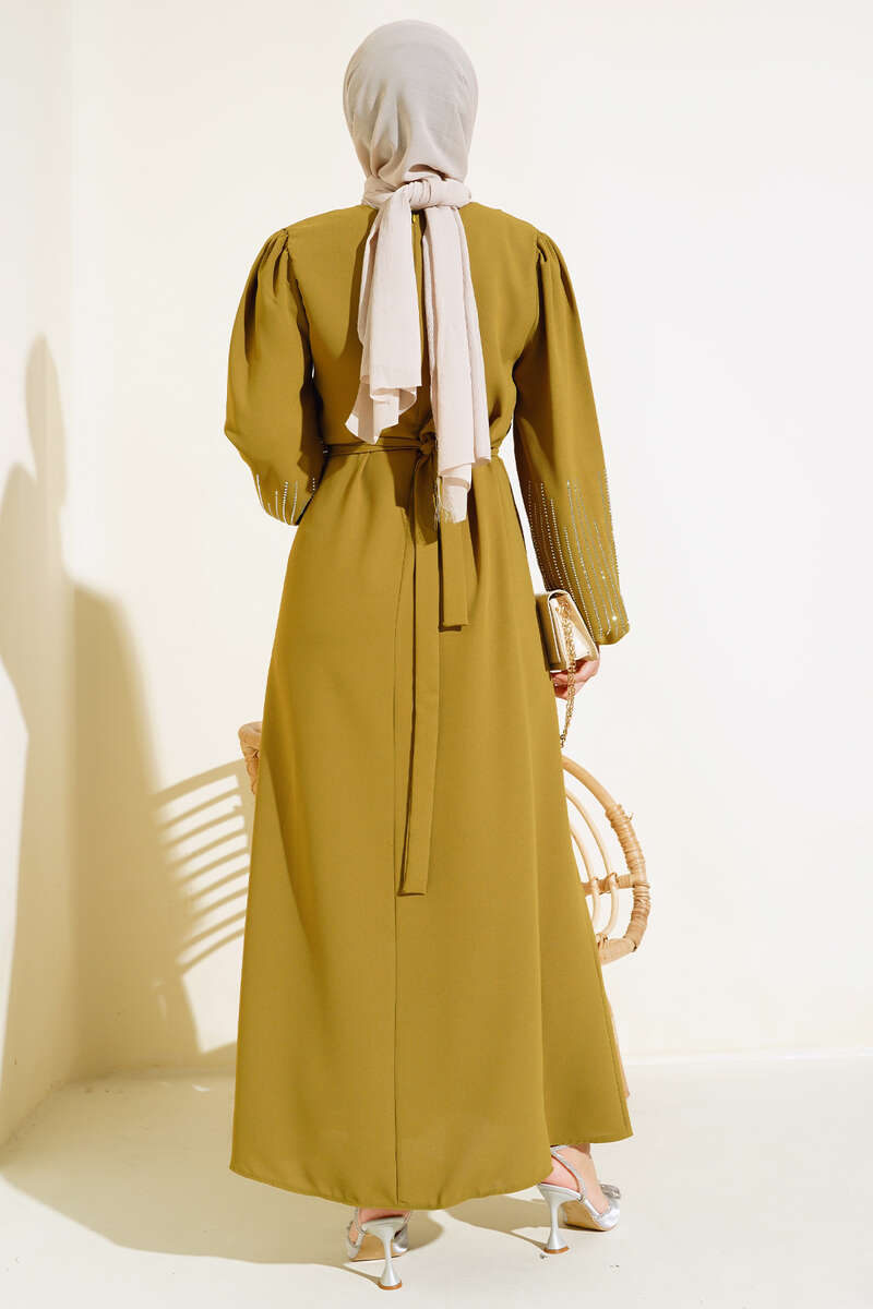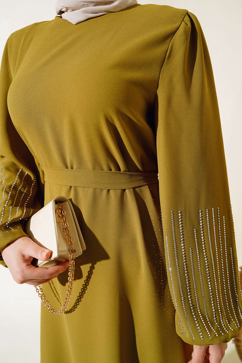 Kolu Taşlı Kuşaklı Elbise Yağ Yeşili