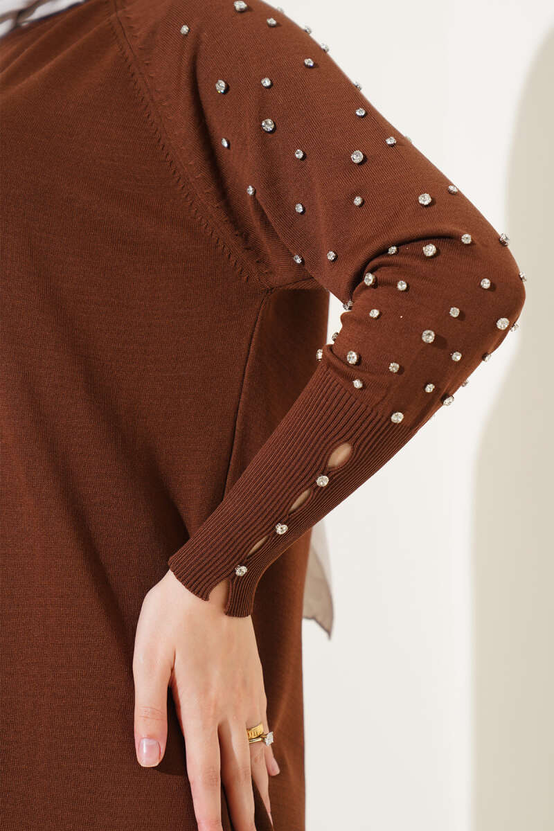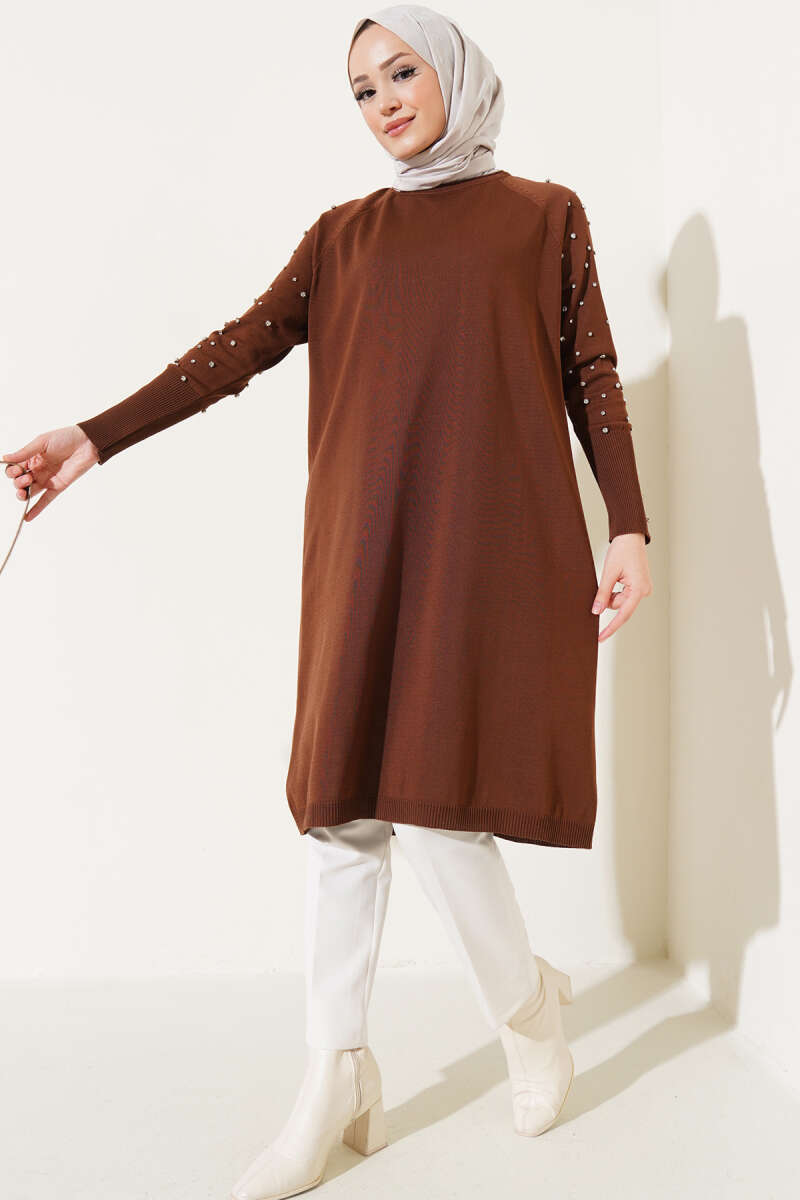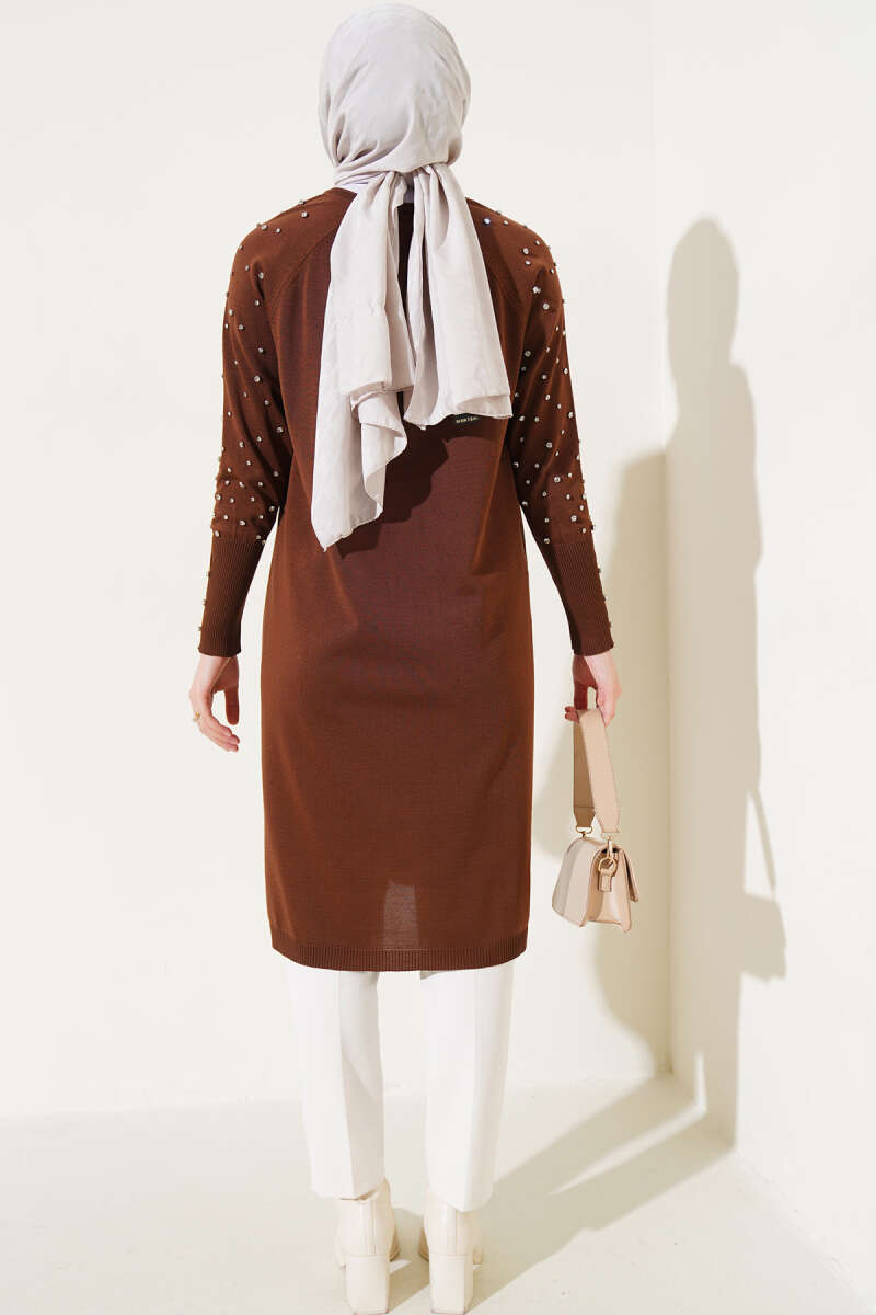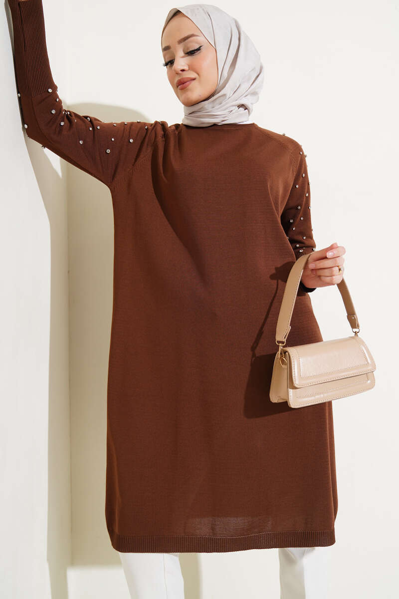 Yatay Çizgi Detaylı Basic Triko Tunik Kahve