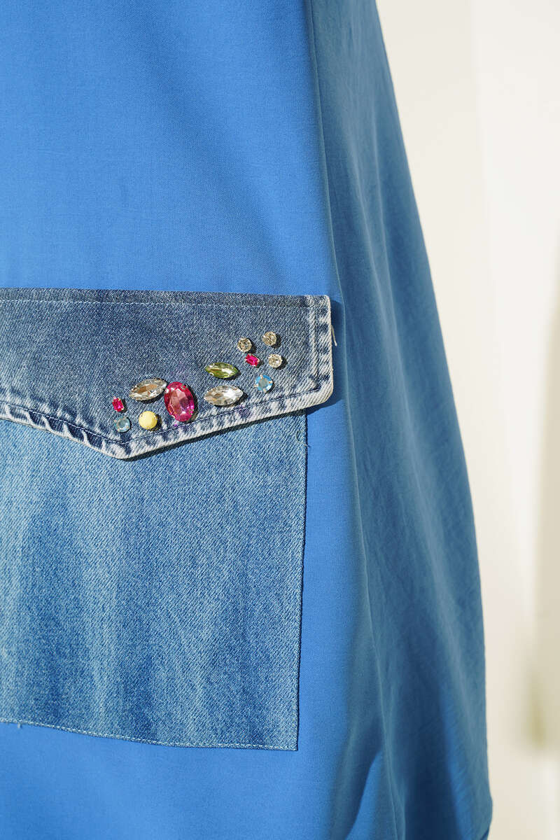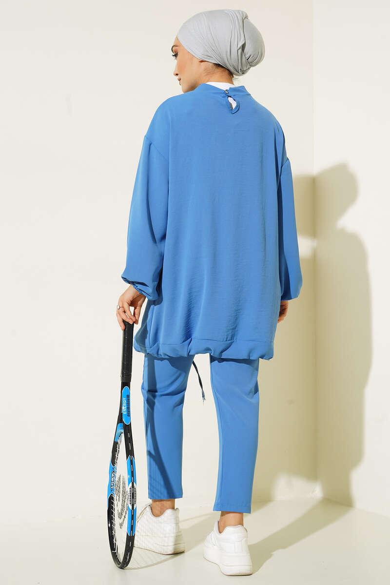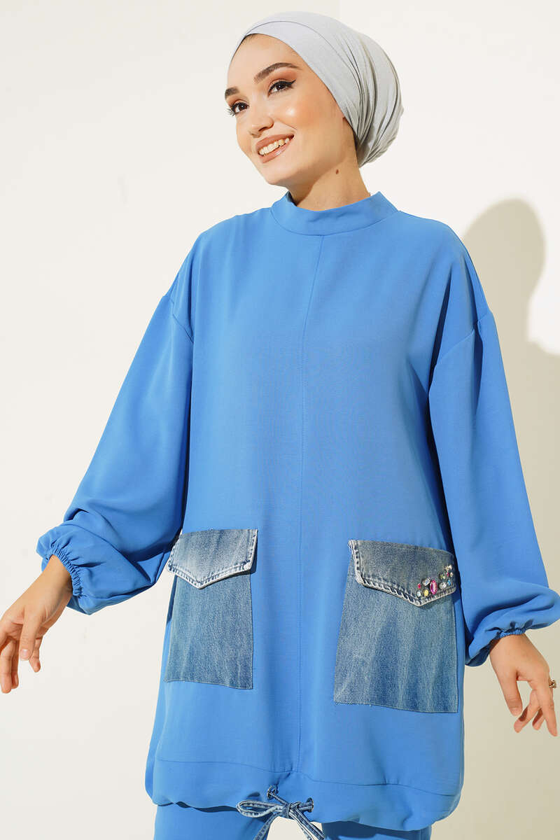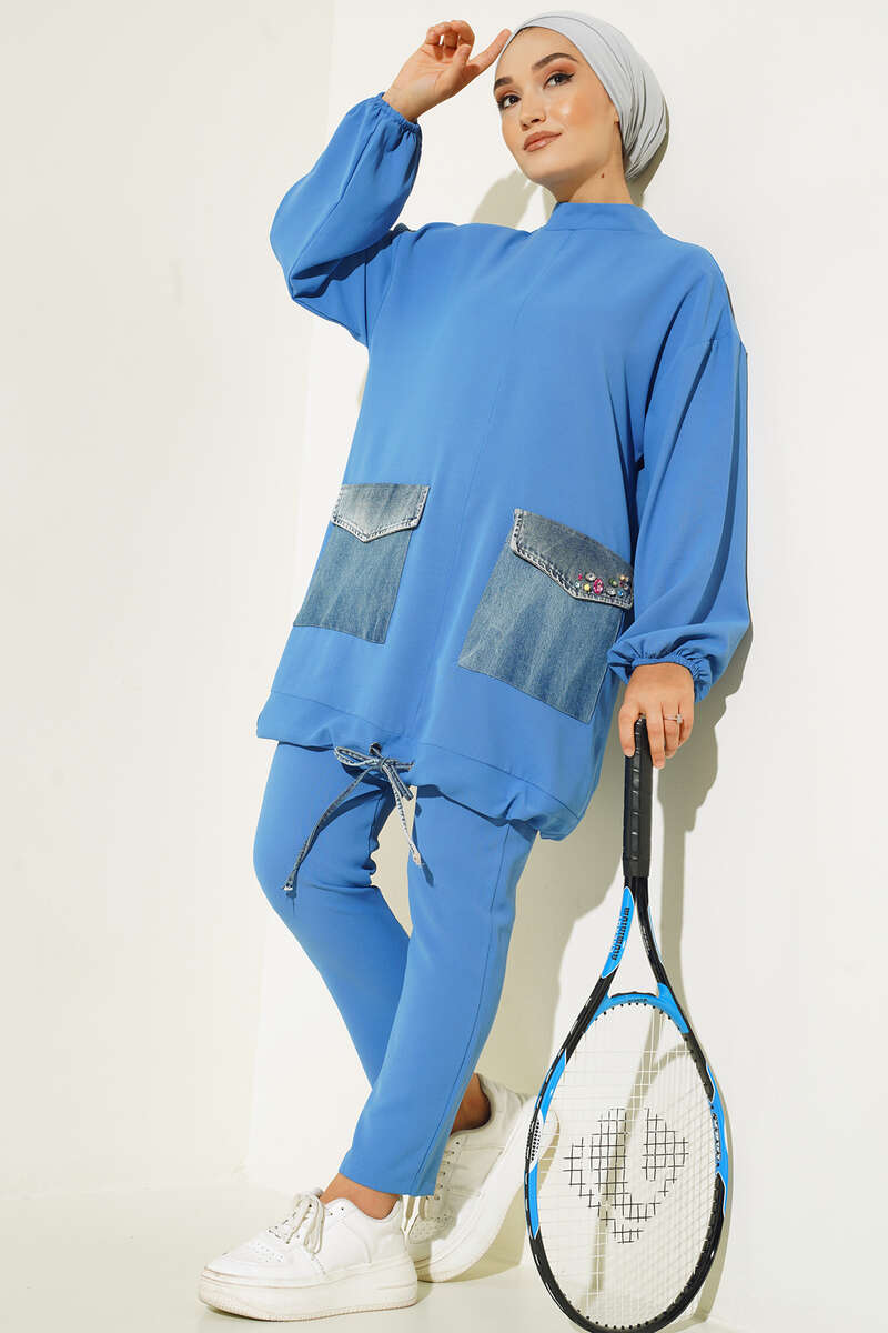 Yeni sezon ikili takımımız sportif bir kombin yapmanıza olanak sağlayacaktır. İkili takımımızn tuniği detaylarla süslenmiştir. Kot cepleri parlak renkli taşlıdır. Etek ucu kot bağalam iplidir. Bilekleri lastikli olan tuniğimiz ense düğmelidir. İkli takımımızın pantolonu bel lastiklidir.