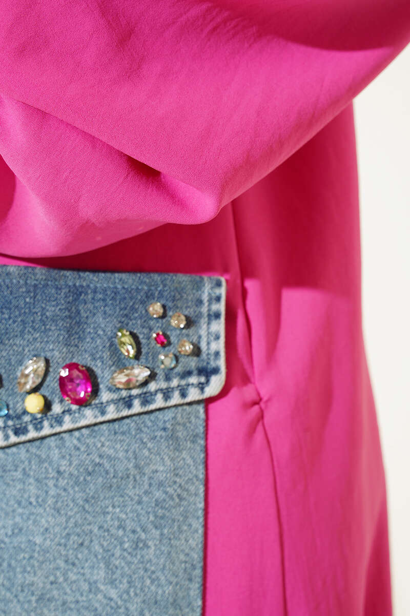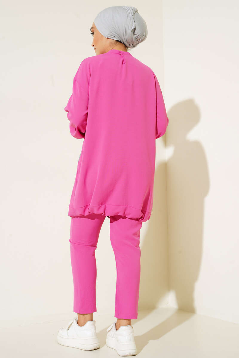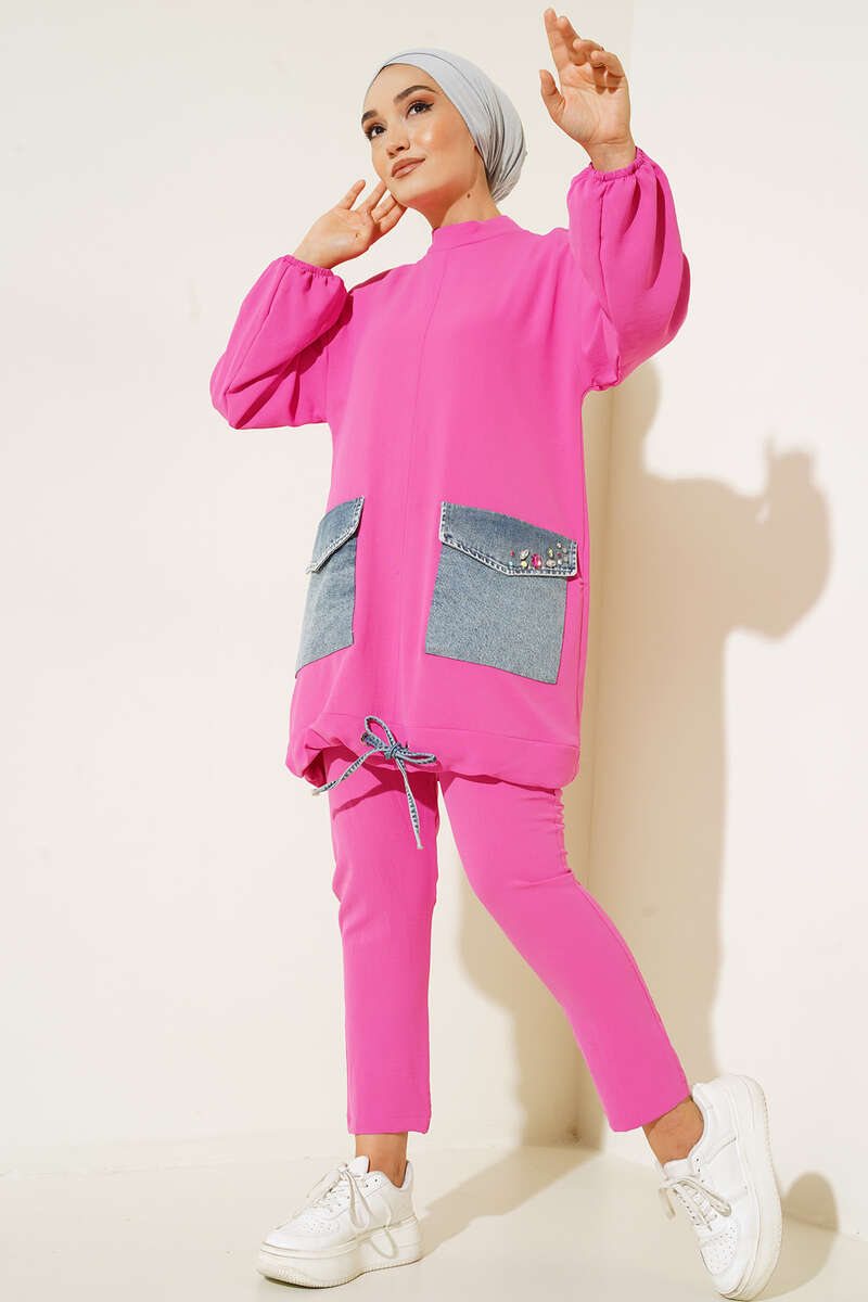 Yeni sezon ikili takımımız sportif bir kombin yapmanıza olanak sağlayacaktır. İkili takımımızn tuniği detaylarla süslenmiştir. Kot cepleri parlak renkli taşlıdır. Etek ucu kot bağalam iplidir. Bilekleri lastikli olan tuniğimiz ense düğmelidir. İkli takımımızın pantolonu bel lastiklidir.