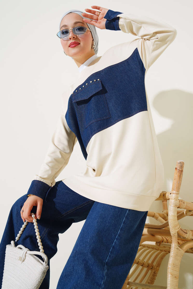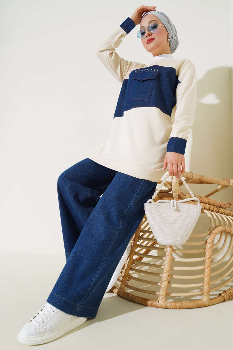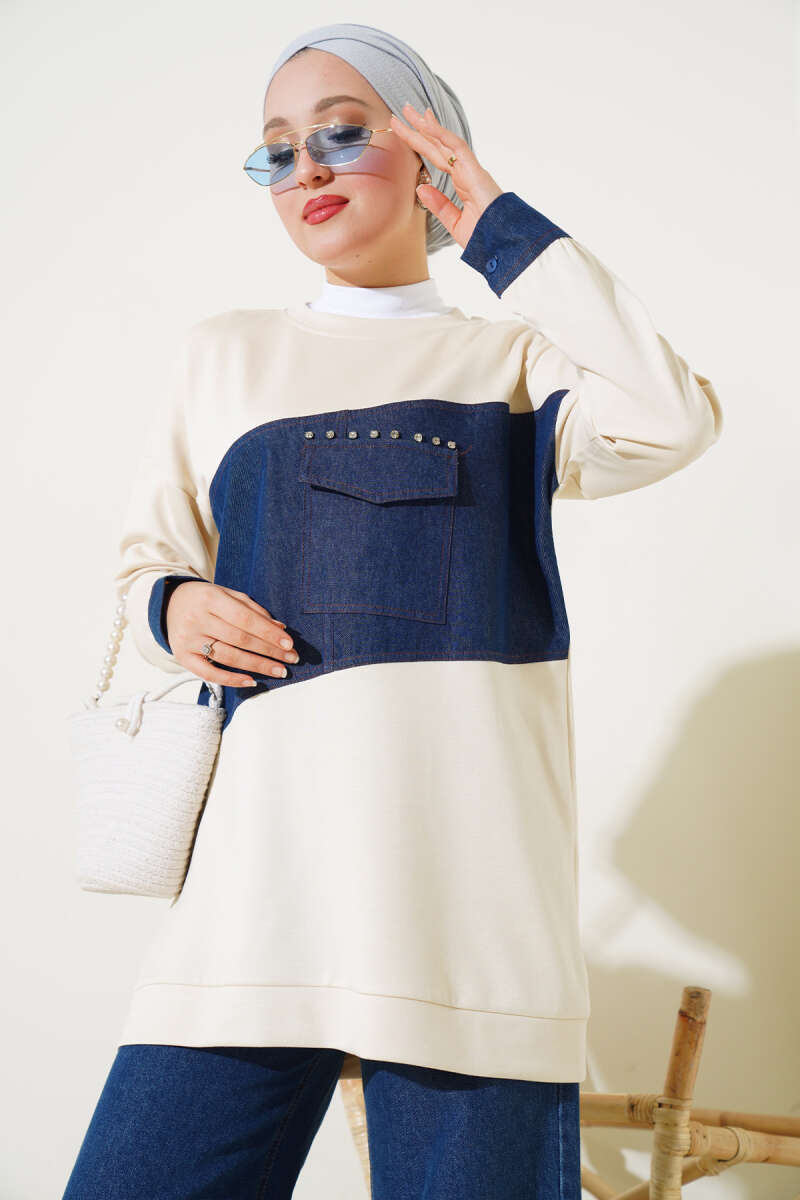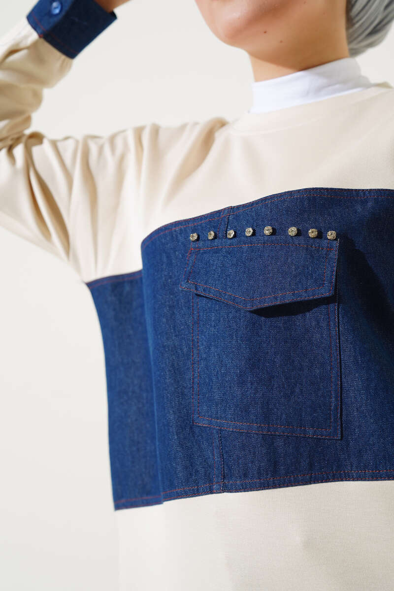 Kot Cep Detaylı Taşlı Tunik Bej