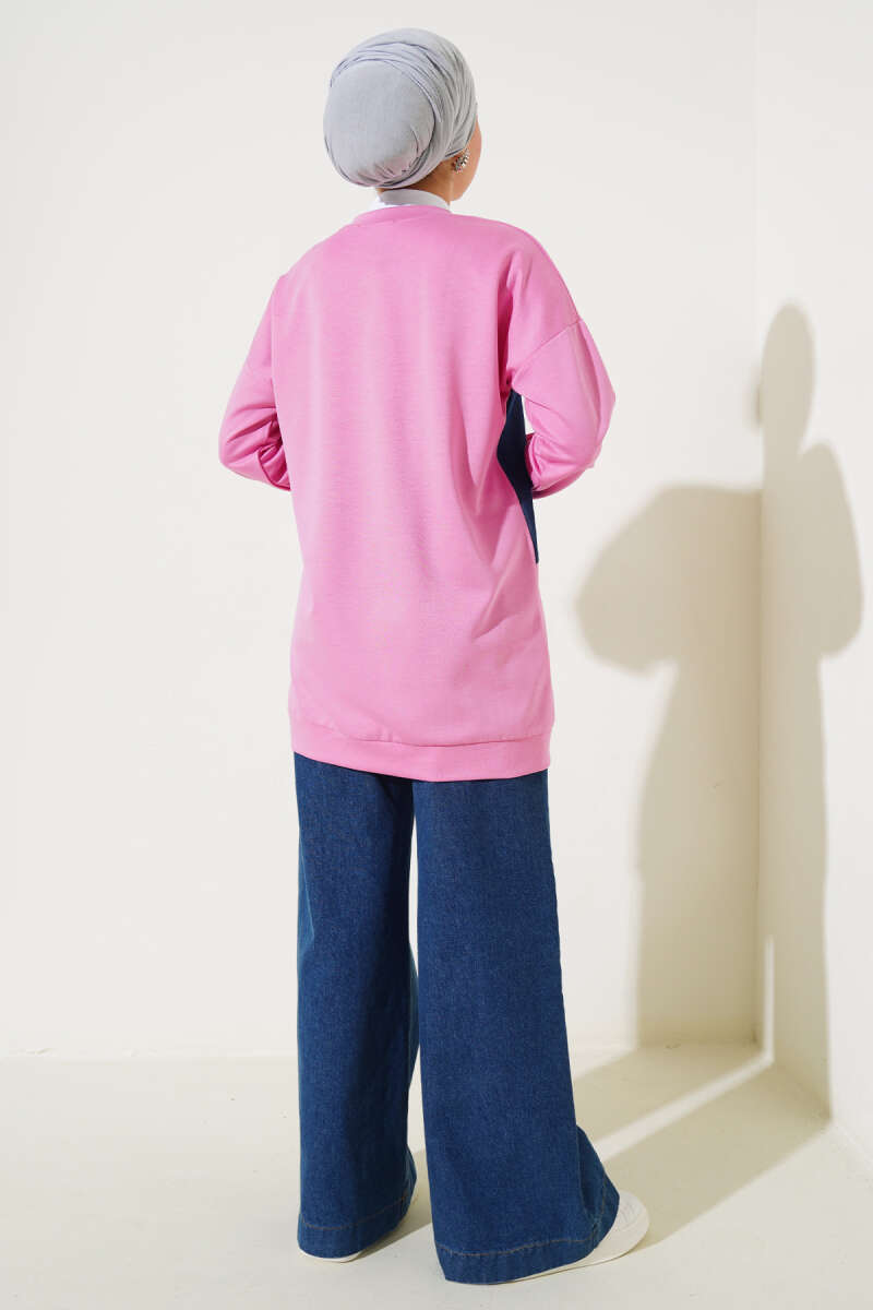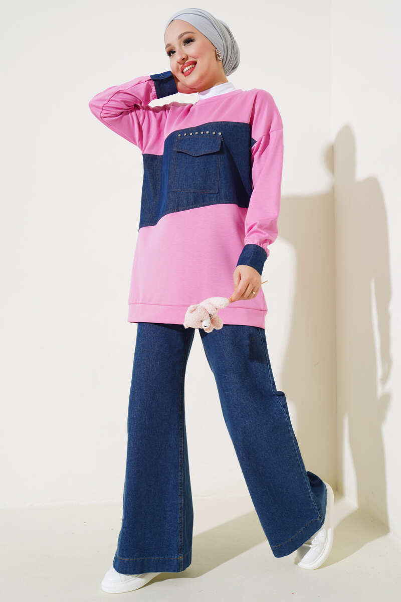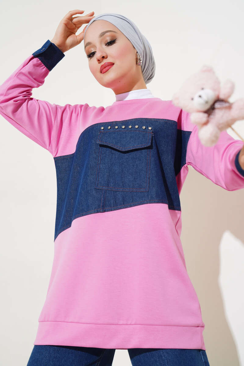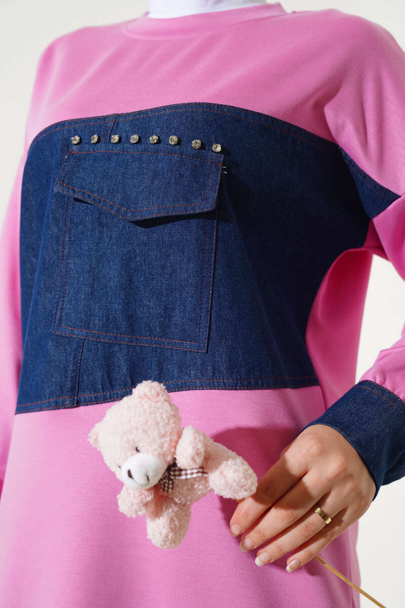Kot Cep Detaylı Taşlı Tunik Pembe