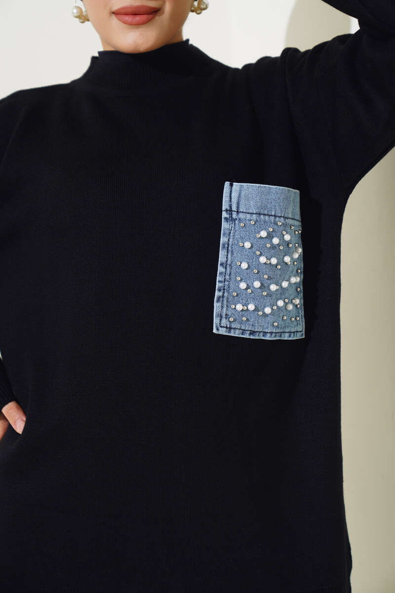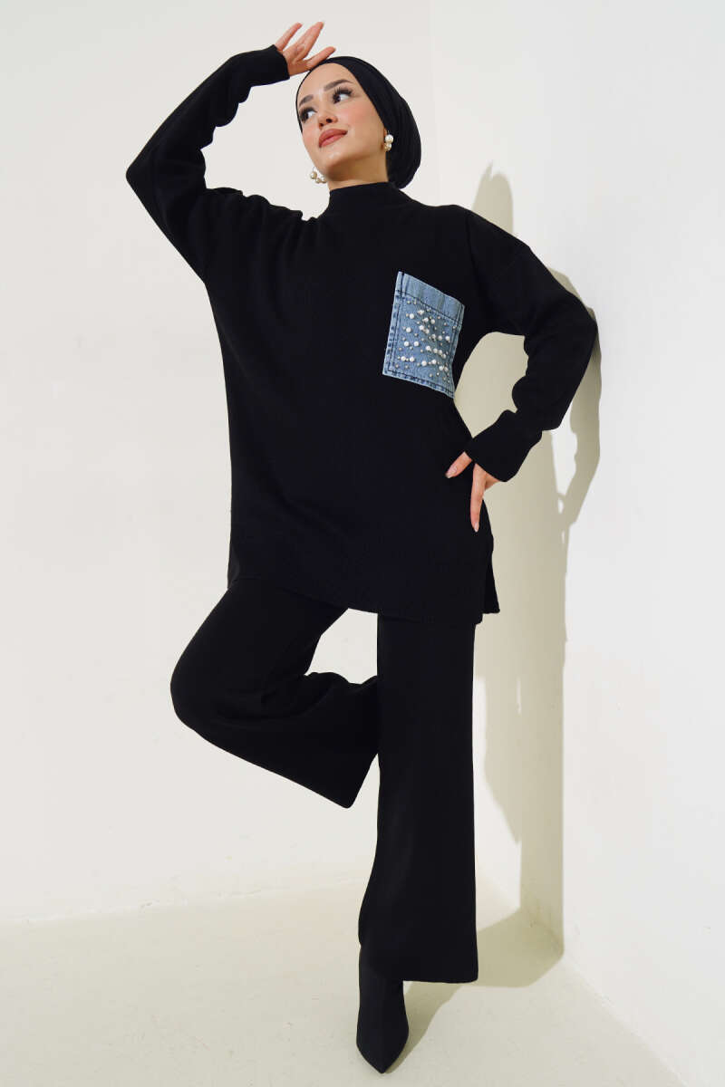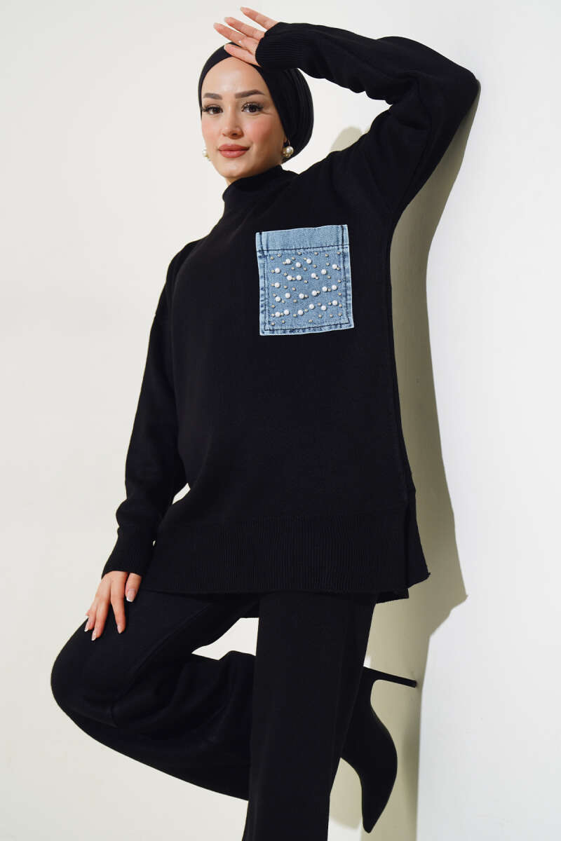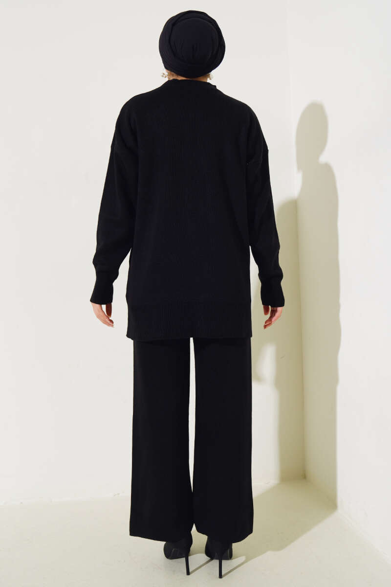 Balon Kol Balıkçı Yaka Triko İkili Takım Siyah