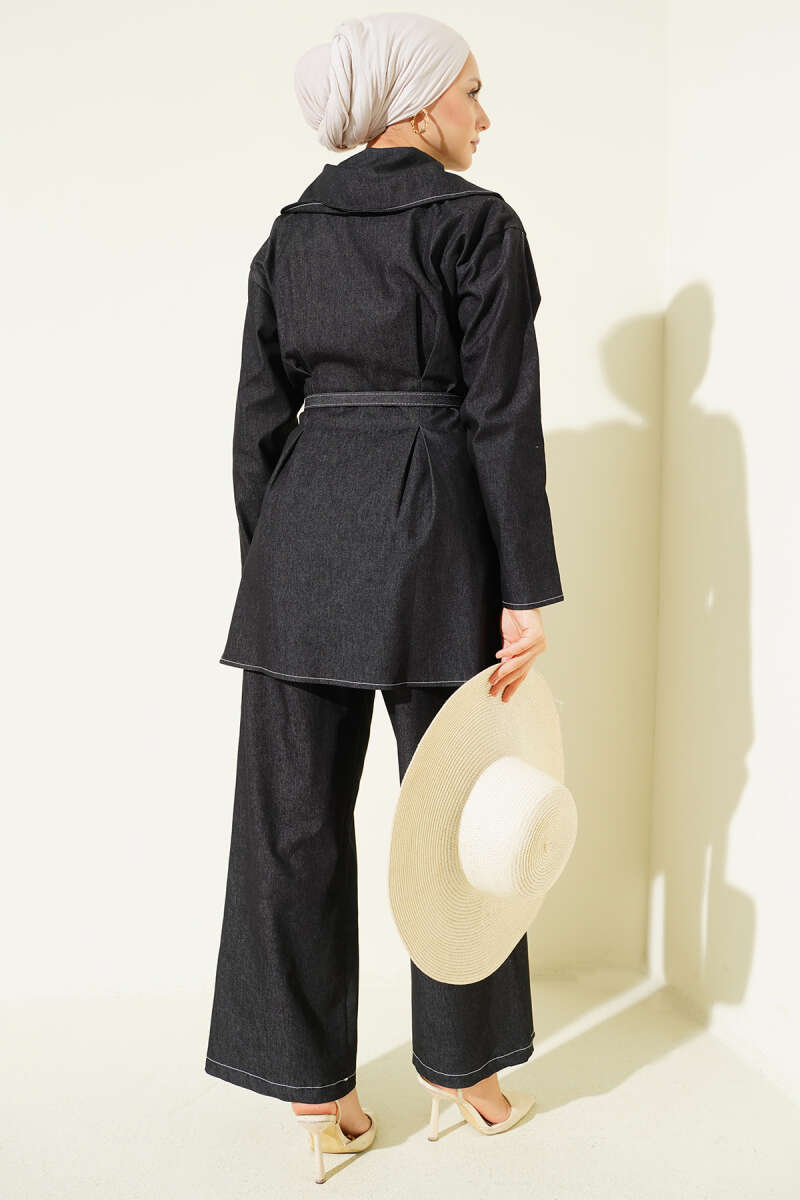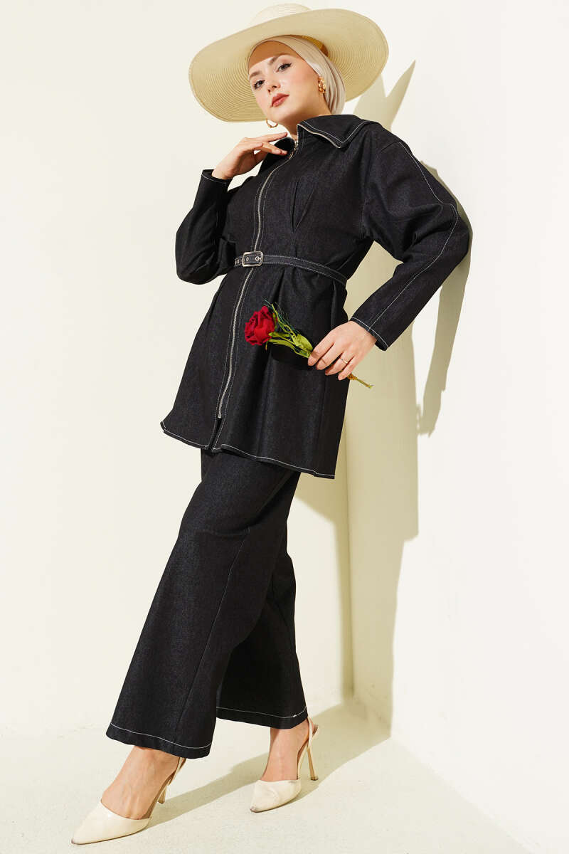 Kapüşonlu Çift Cepli Fermuarlı Kot İkili Takım Lacivert