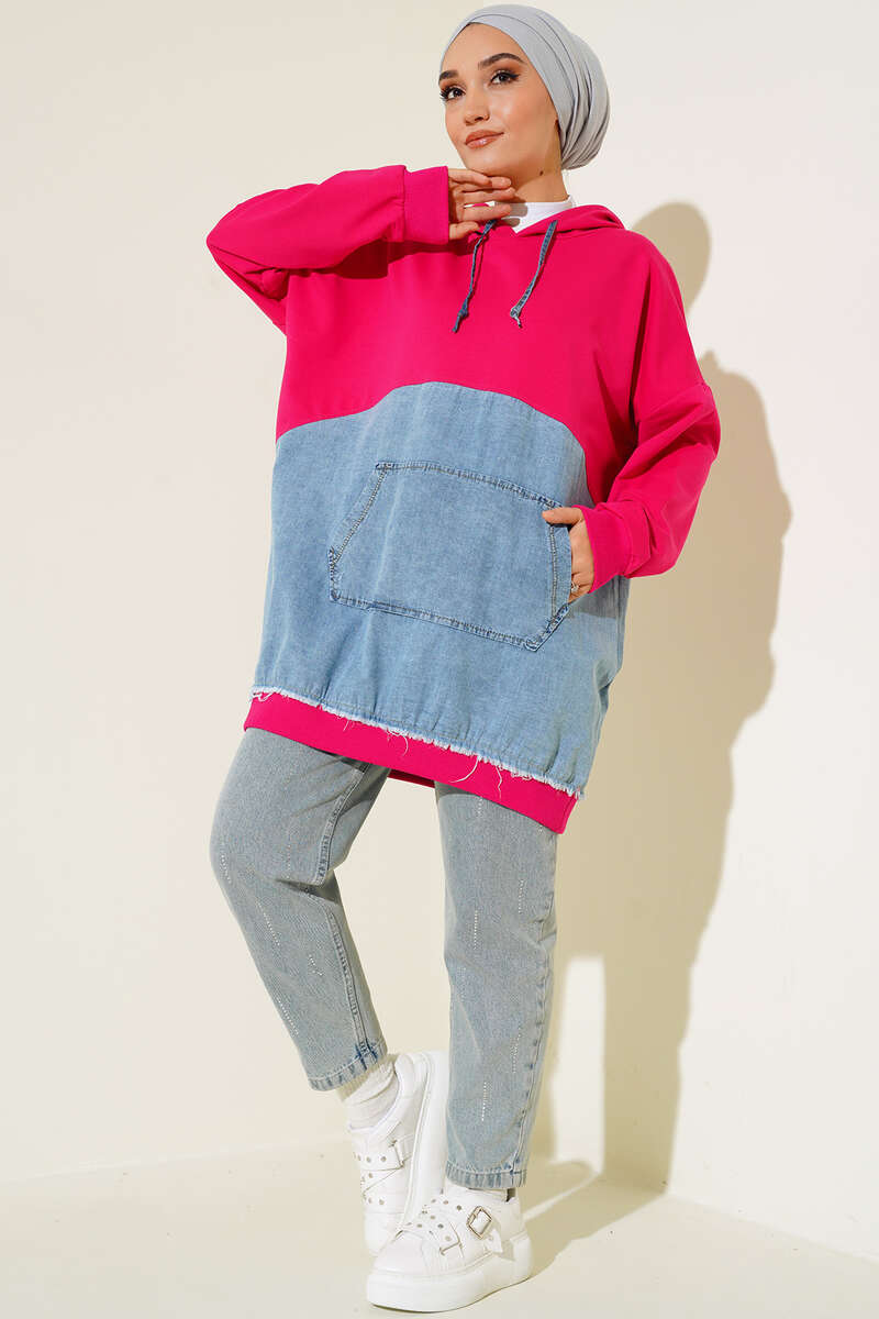 Yeni sezon kot garnili tuniğimiz kapüşonludur. Kapüşonu ip bağlamalı olan tuniğimiz düşük omuz salaş modeldir. Oversize yapısı tuniğimize sportif bir görünüm kazandırmıştır. Önü kanguru ceplidir.