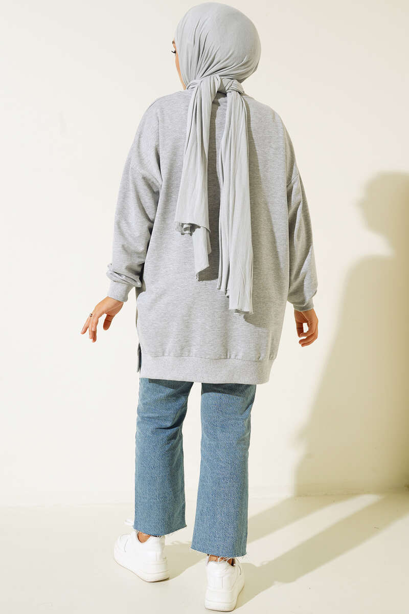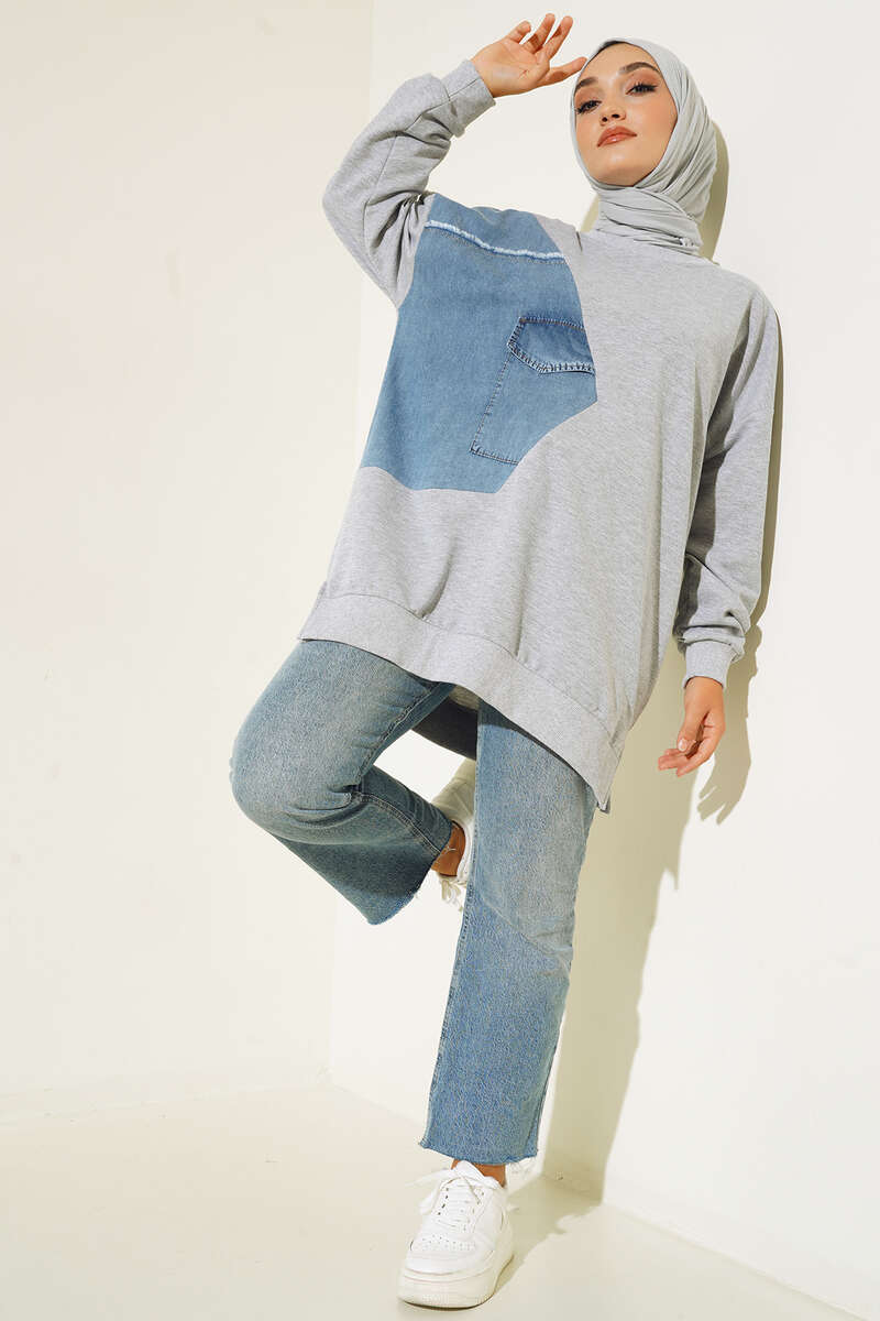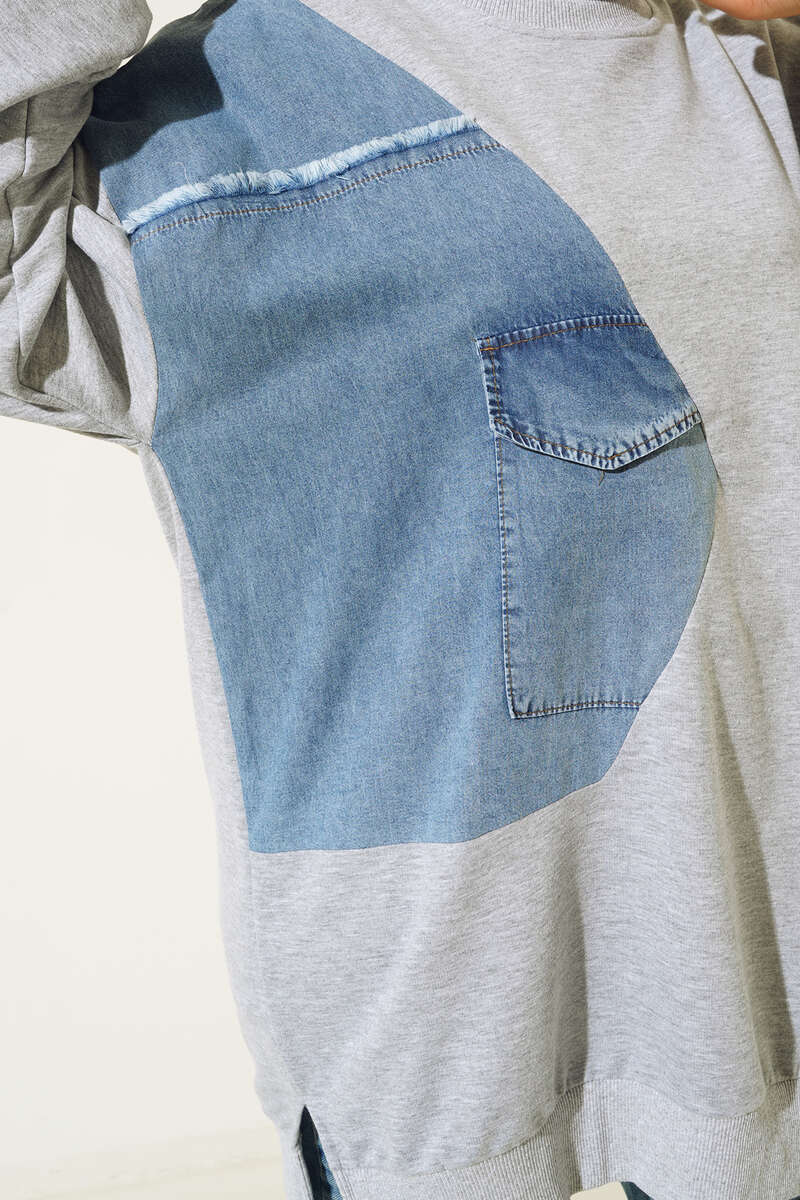 Yeni sezon tuniğimiz kot garnilidir. Üzerinde bulunan kapaklı cep detayı tuniğimize harekte kazandırmıştır. Düşük omuz model olan tuniğimiz bisiklet yakadır. Etek uçların yırtmaçlı oaln tuniğimizin bilkeleri ve yakası ribanalıdır.