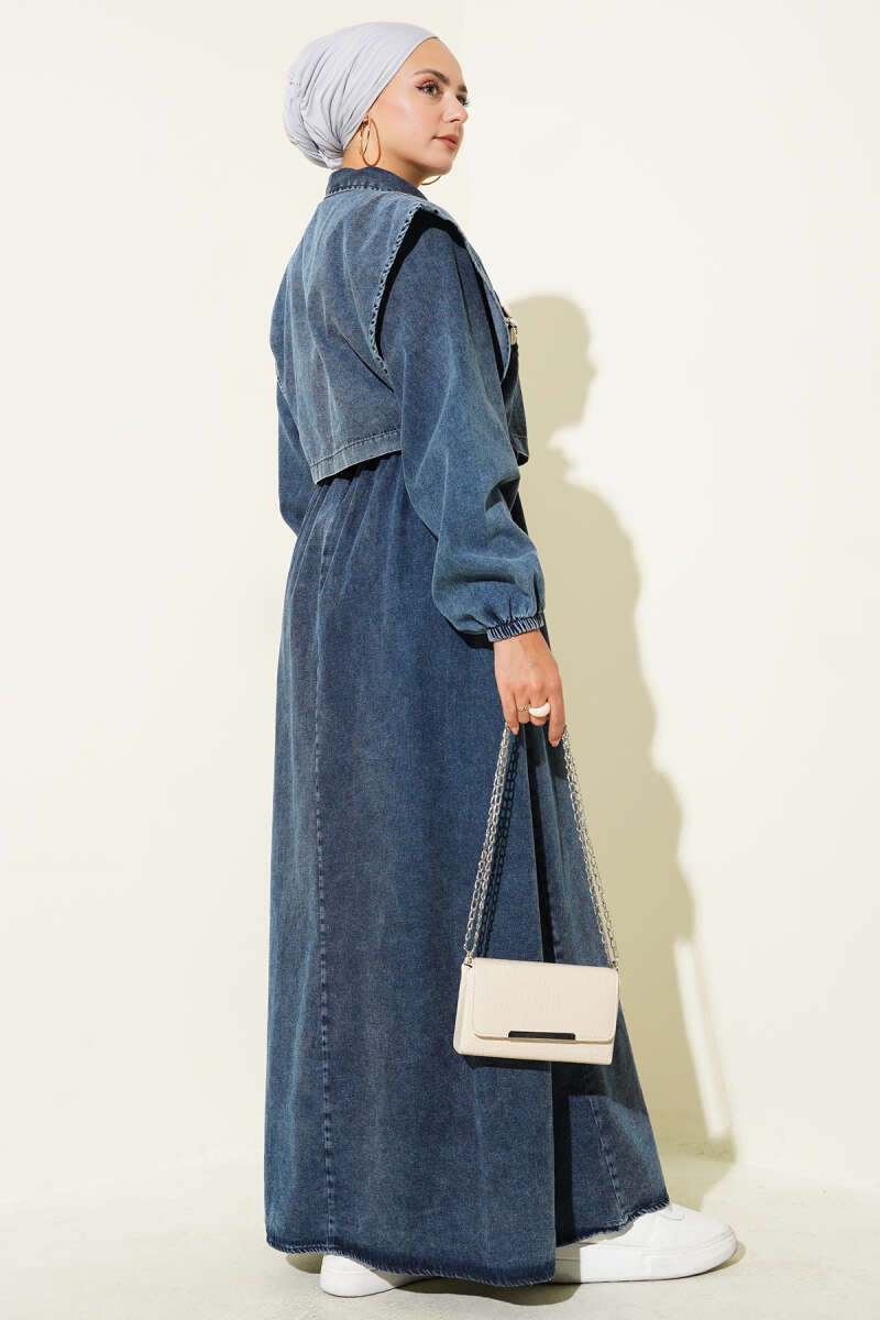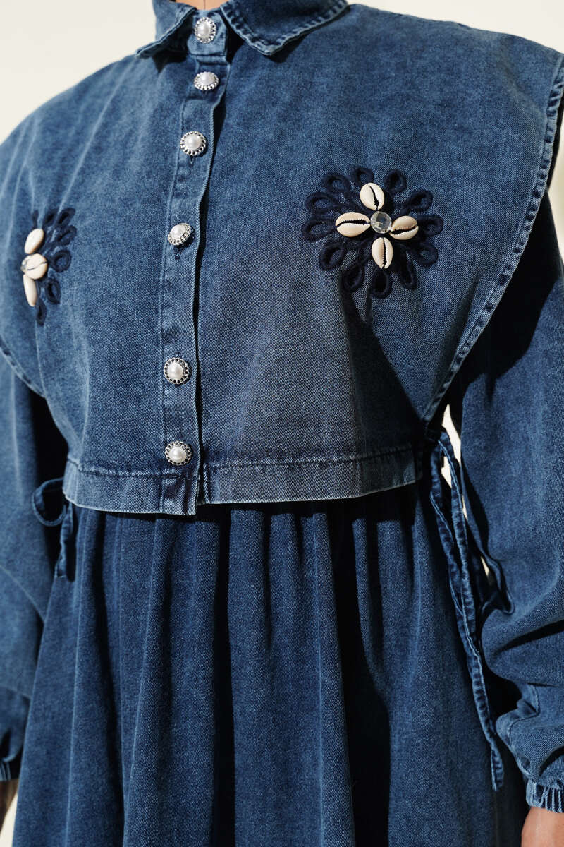 Yarım Yaka Fermuarlı Cepli Kot Elbise Mavi