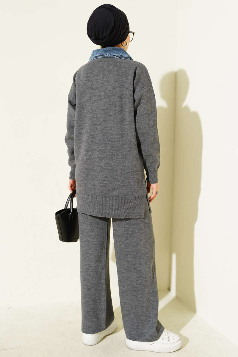 Fırfırlı İncili Etekli Triko İkili Takım Kahve