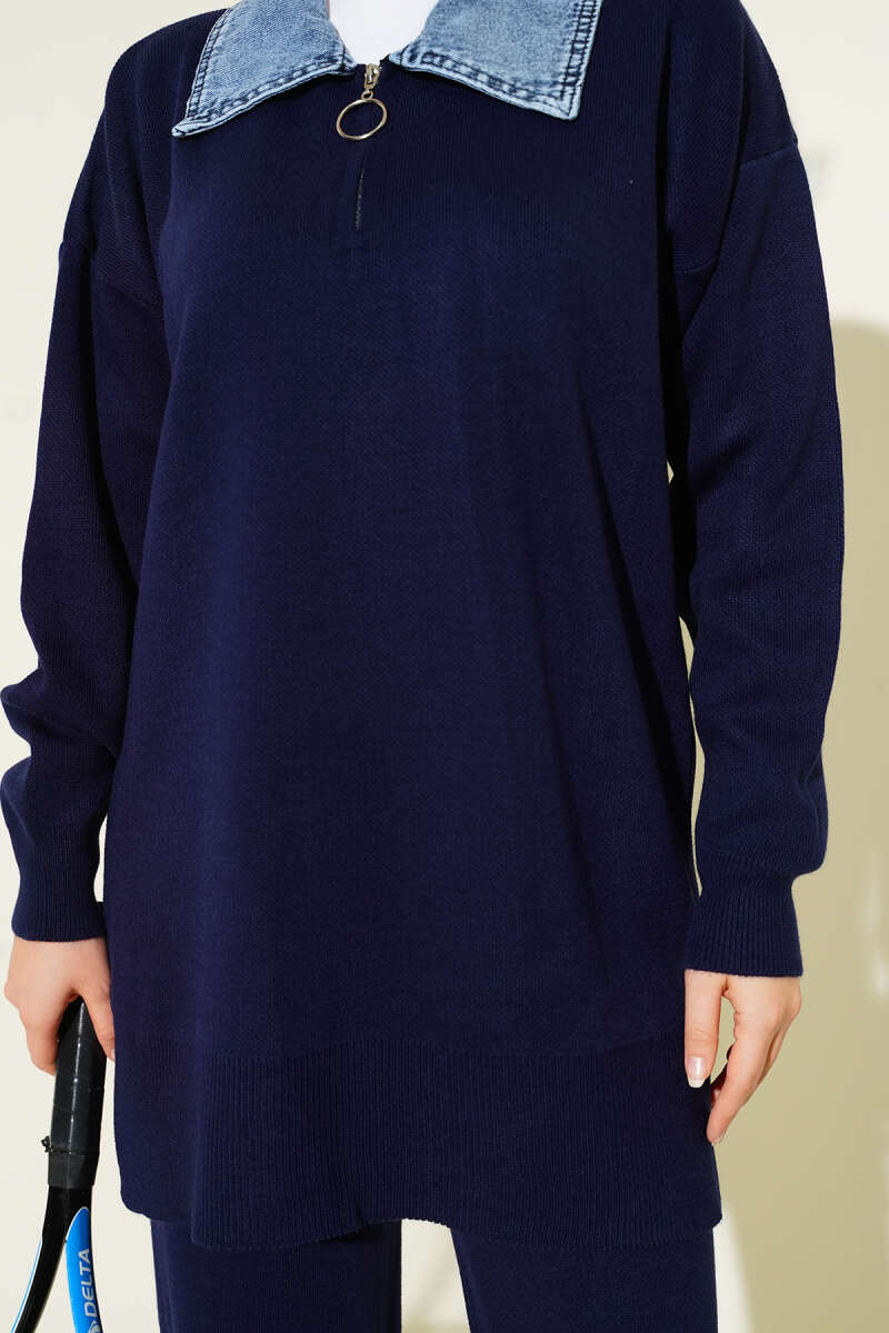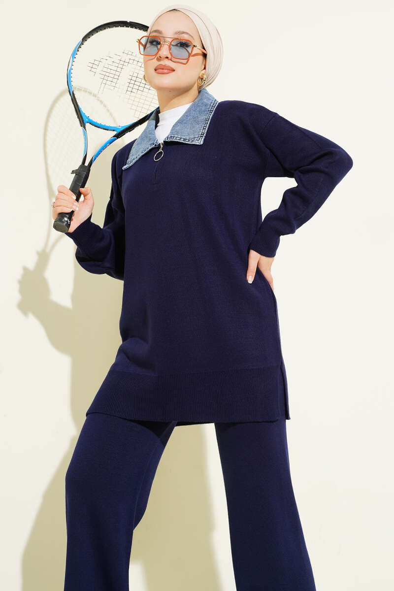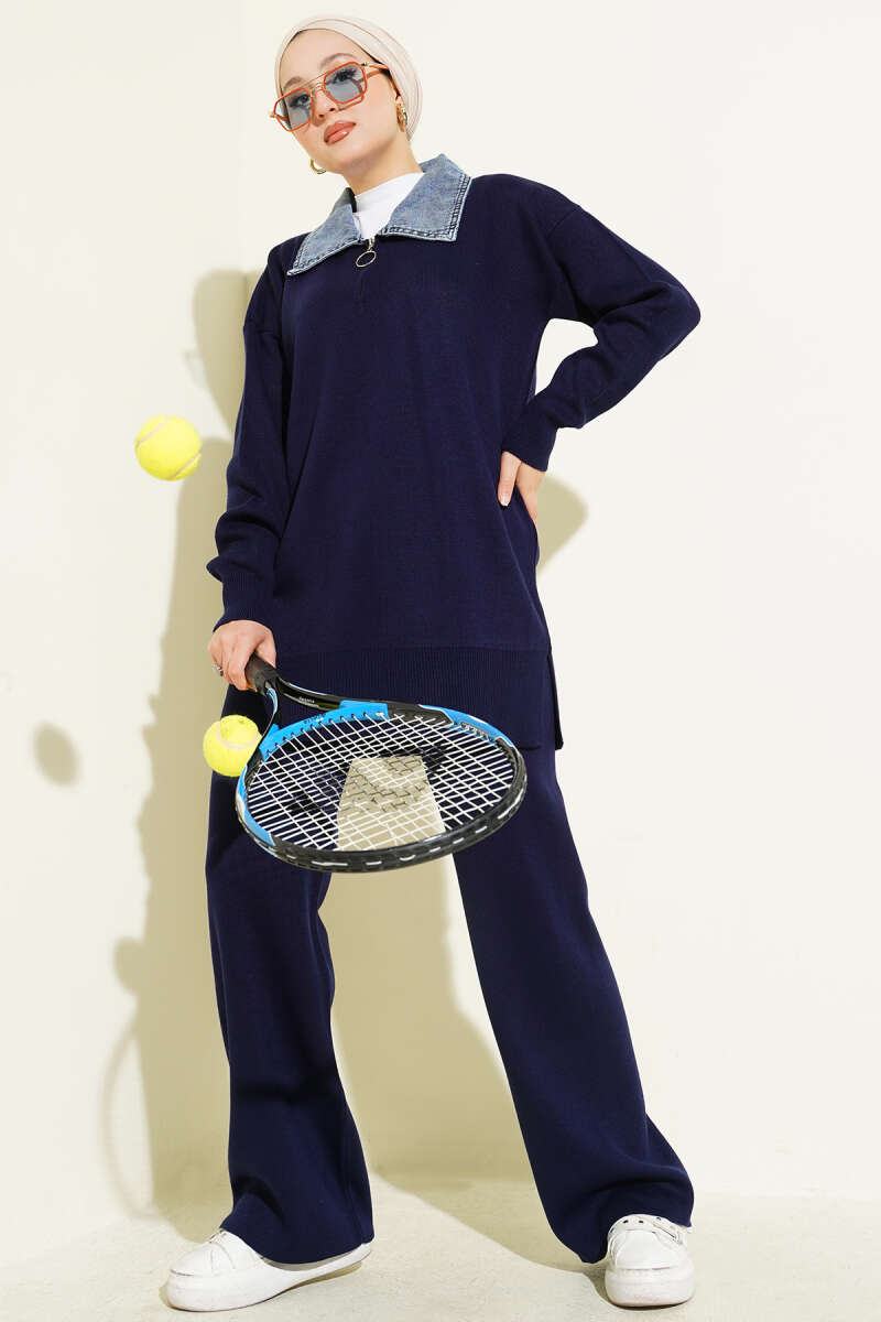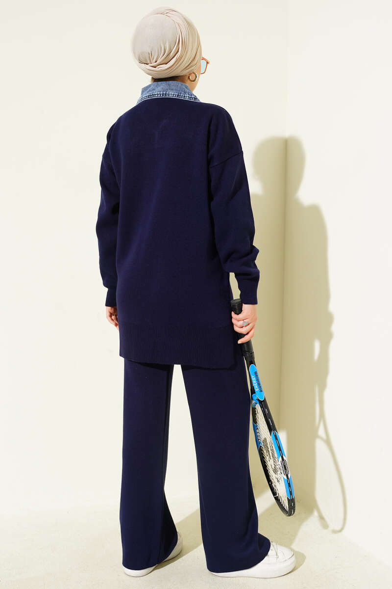 Kabartma Şeritli Taşlı Triko İkili Takım Lacivert