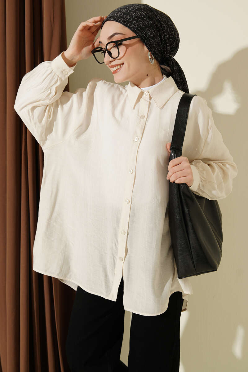 Gold Düğmeli Omuz Pileli Gömlek Ekru