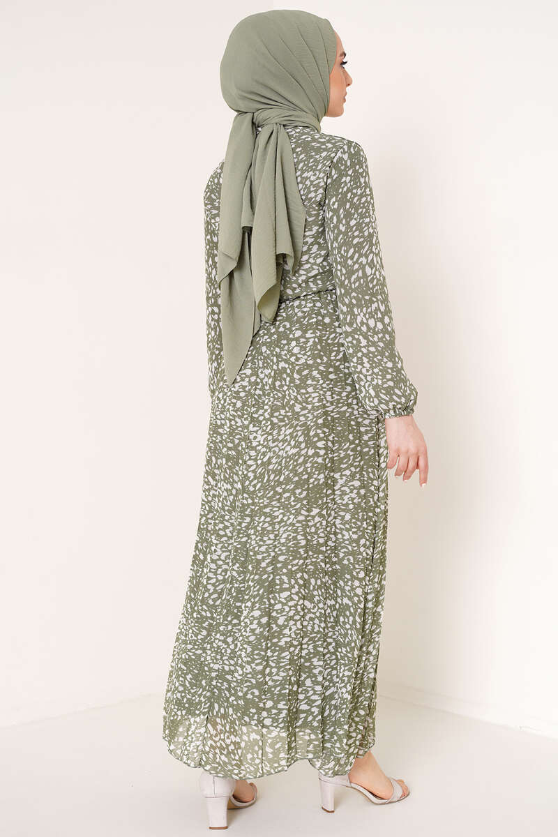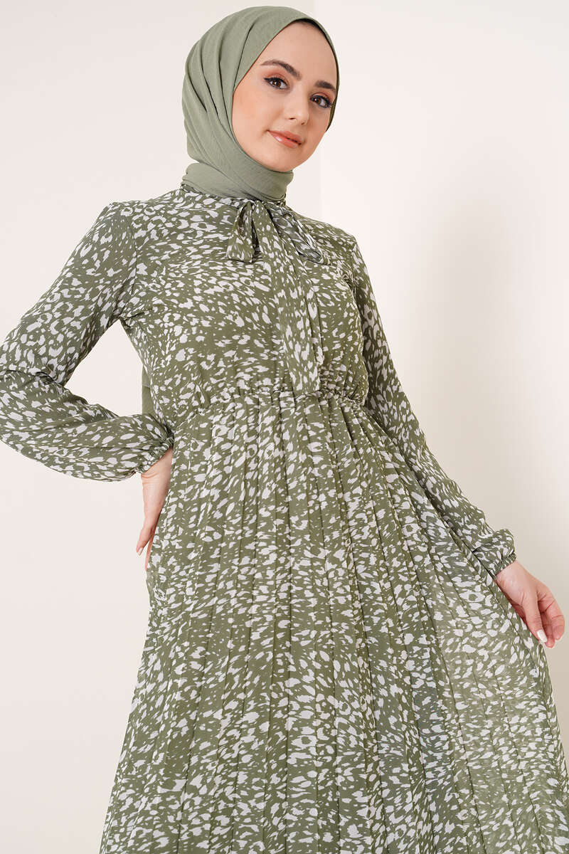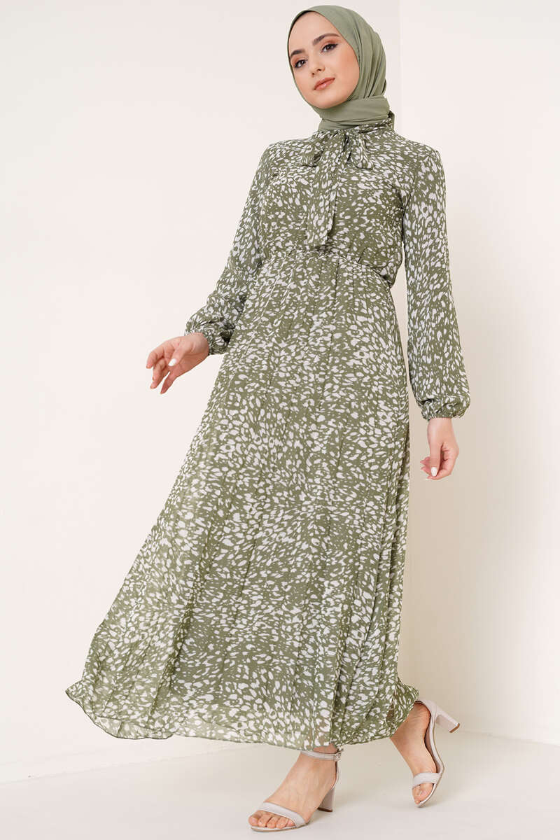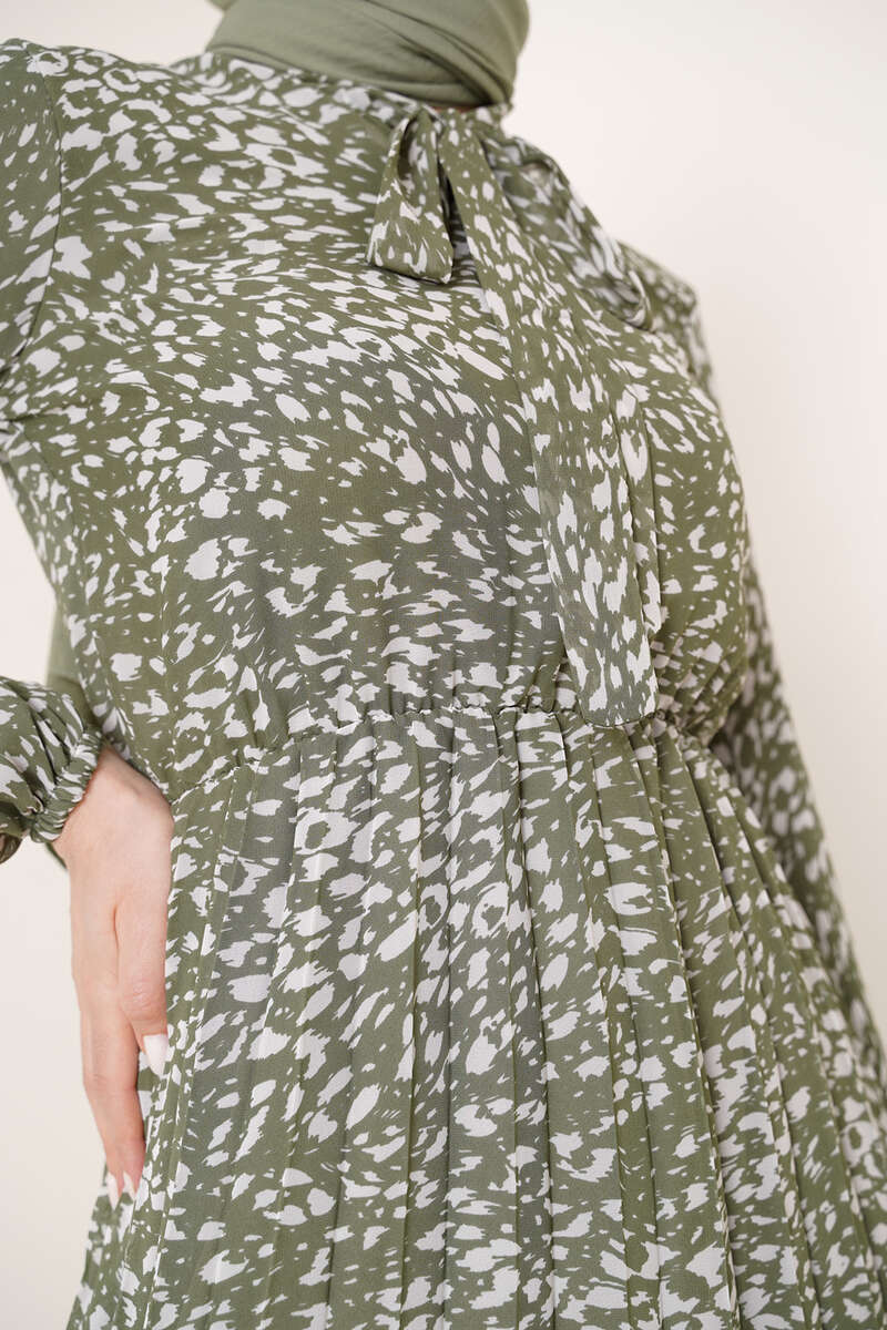 Kravatlı Desenli Şifon Elbise Çağla Yeşili