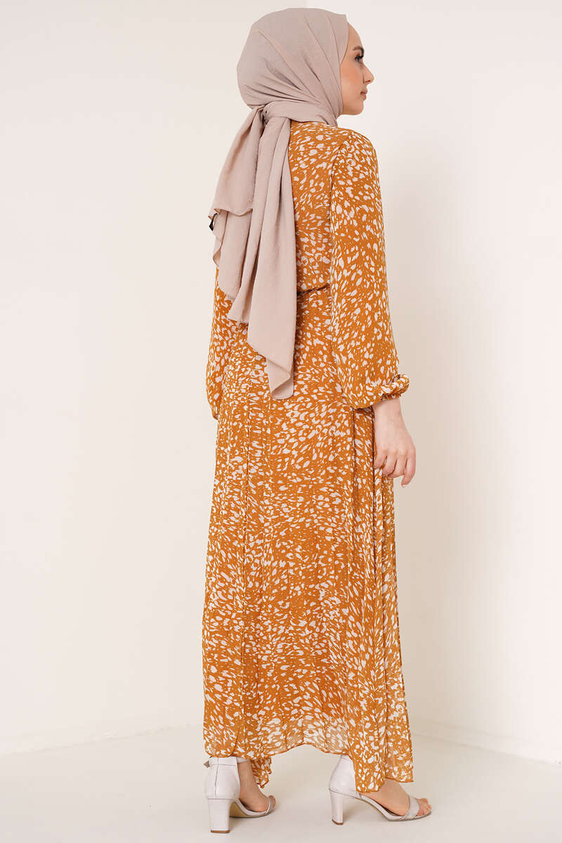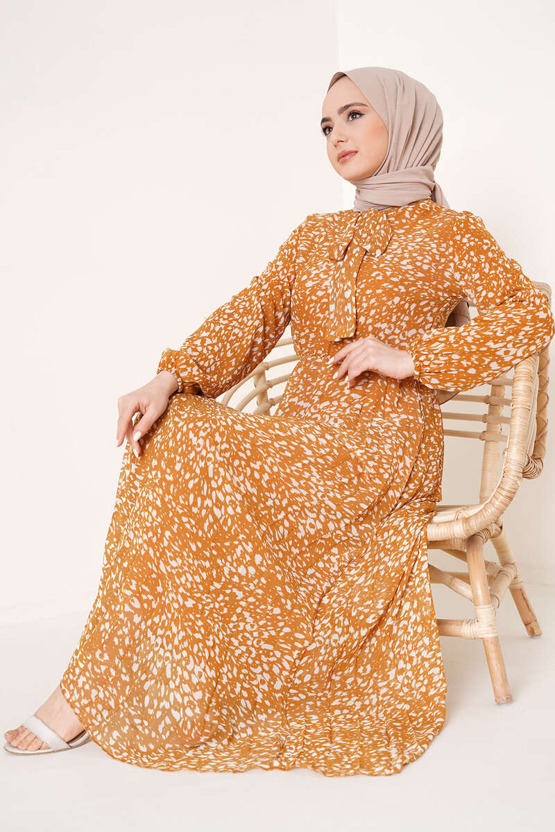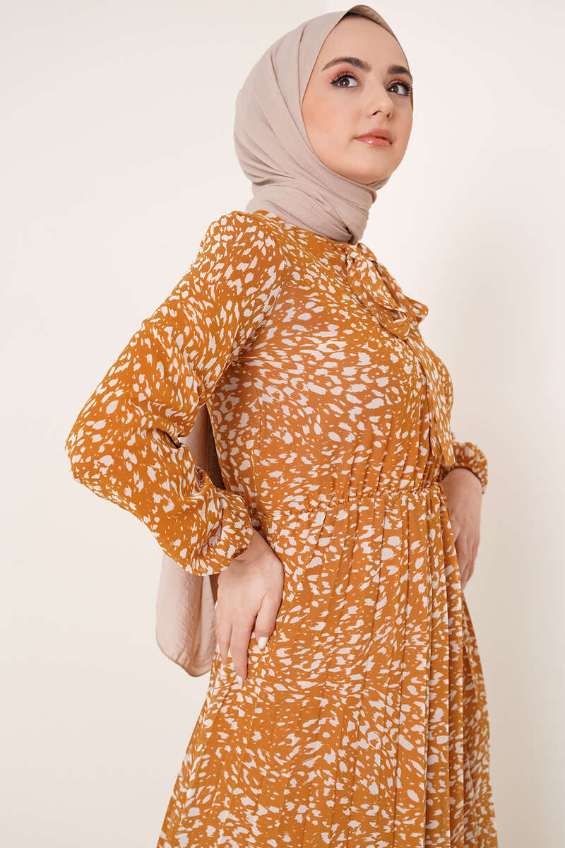 Kravatlı Desenli Şifon Elbise Hardal