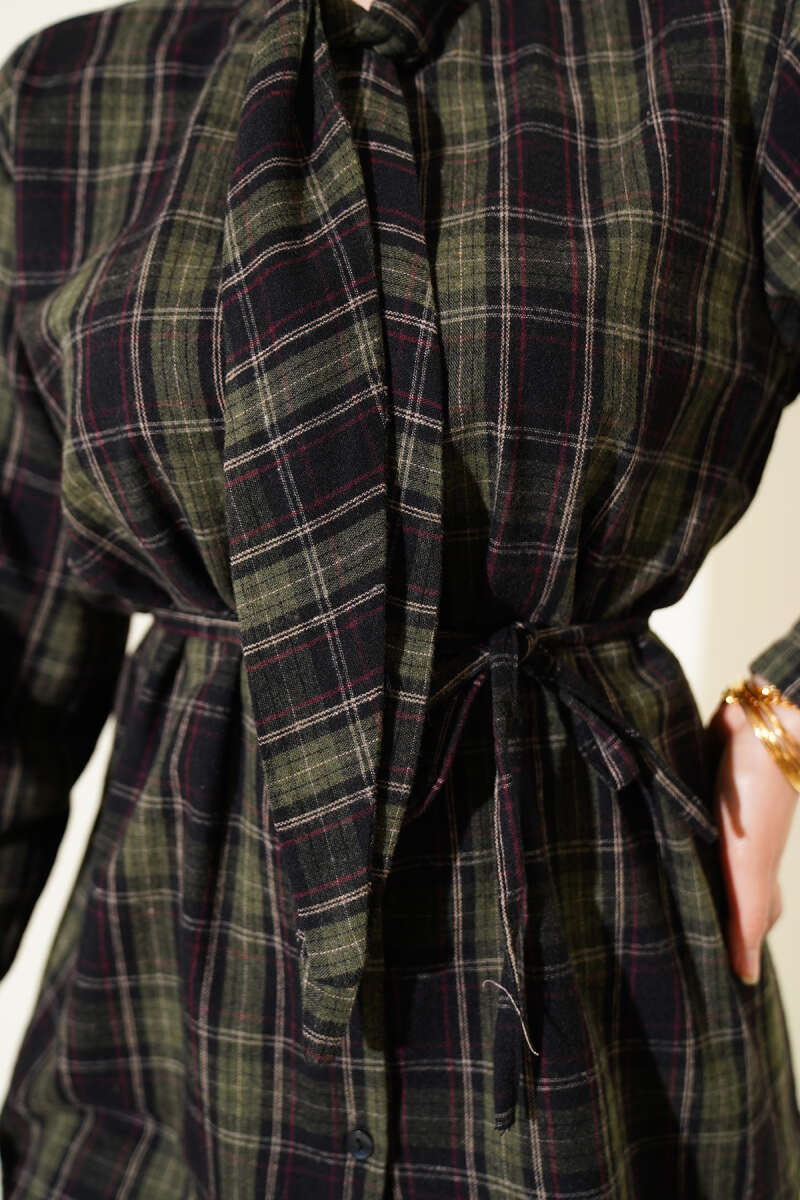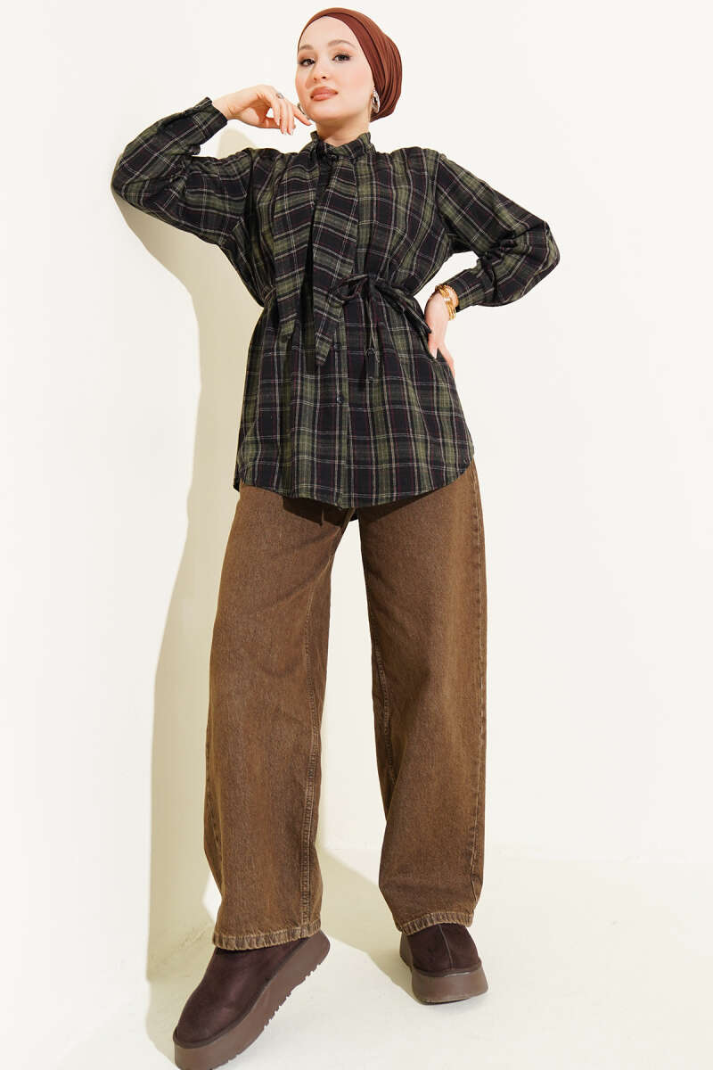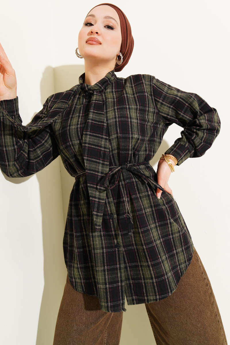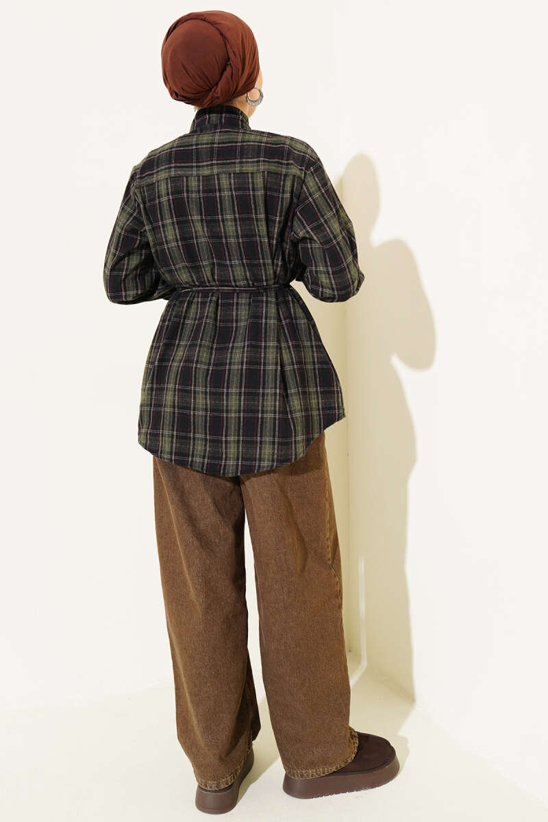 Şal Detaylı Ekoseli Gömlek Haki
