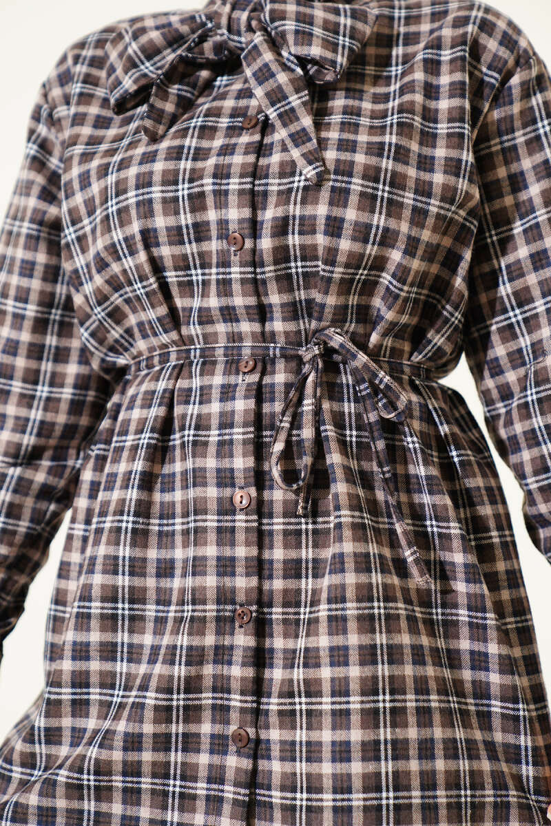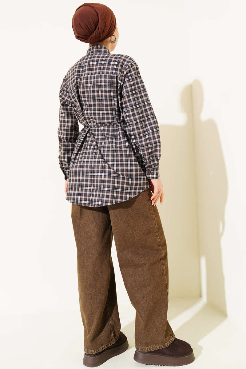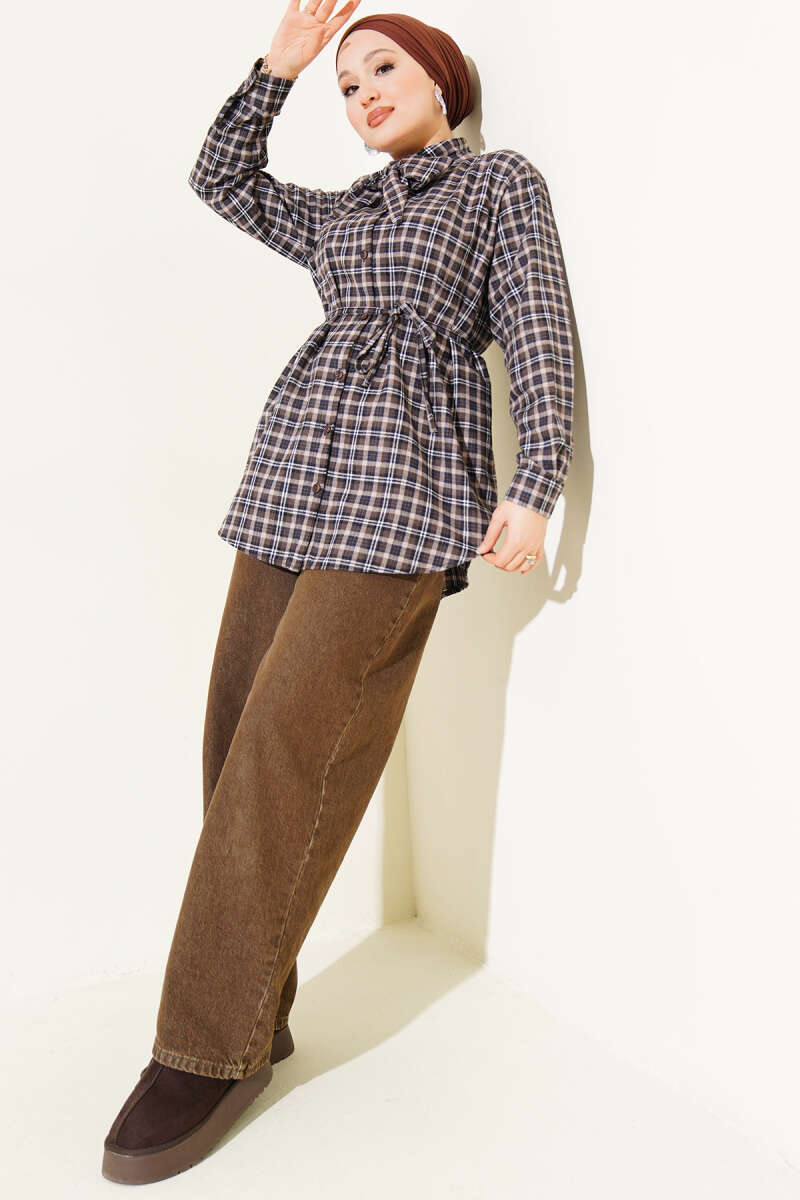 Ekose Desen Taşlı Gömlek Toprak