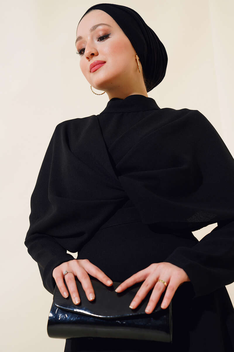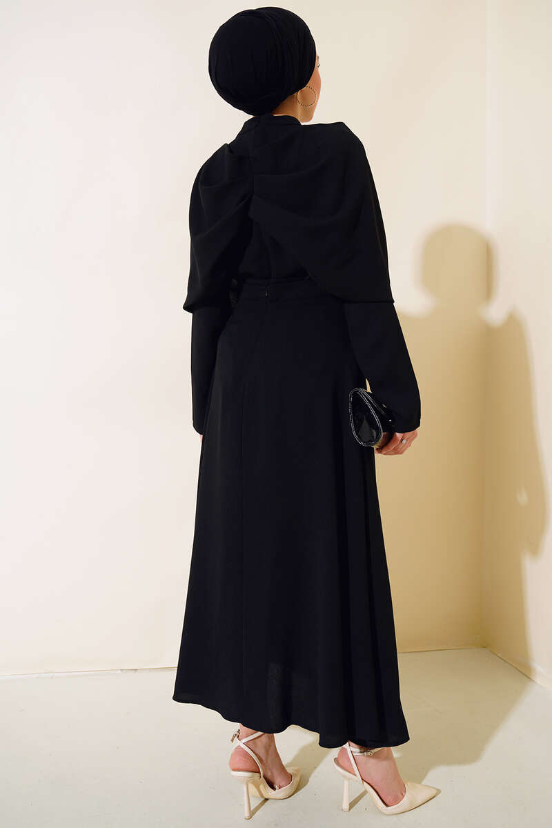 Yeni sezon ikili etekli takım modelimiz sizlerle beraber. Tuniğimiz omuz şalı görünümlüdür. Dik yaka olup sırtında fermuar vardır. Eteğimiz kloş model olup, belinde fermuar bulunmaktadır. Etekli ikili takımımız hem şık hem modern görüntüsüyle özel günlerinizin favorisi olacaktır.