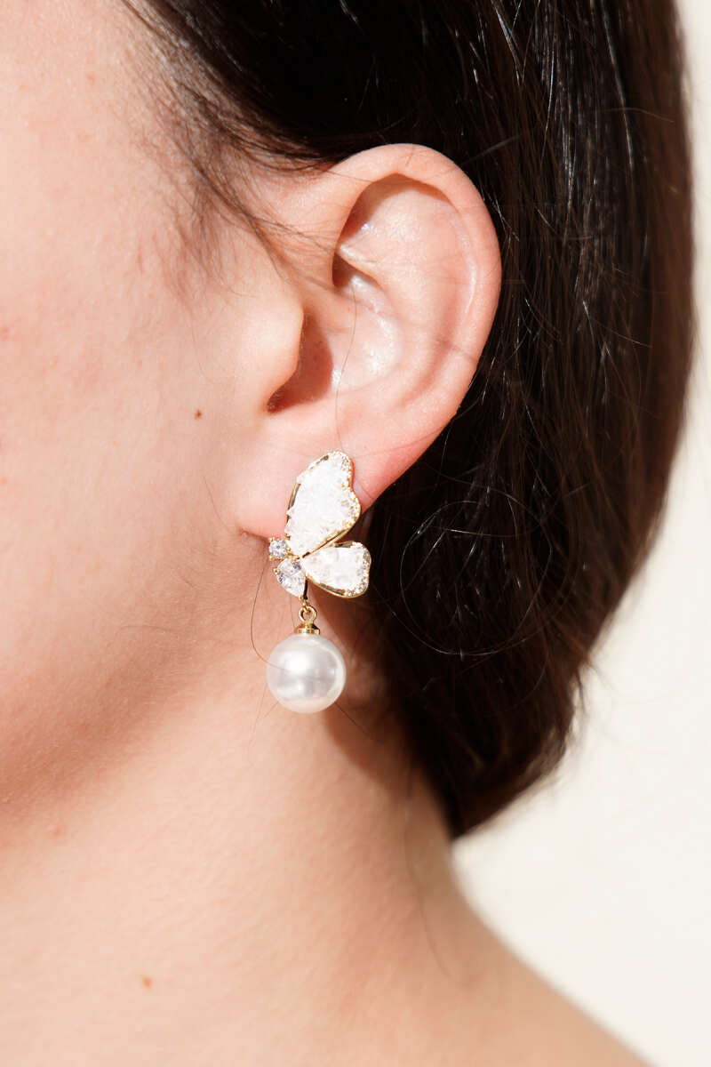 Kristal Kelebek Kanadı ve İnci Sallantılı Küpe Gold
