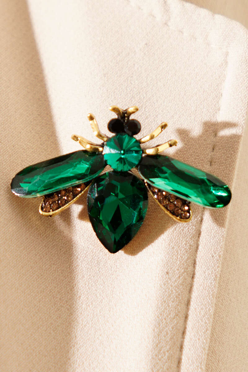 Kristal Taşlı Arı Figürlü Gold Broş Zümrüt