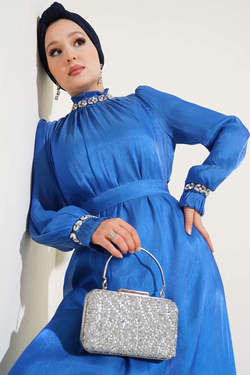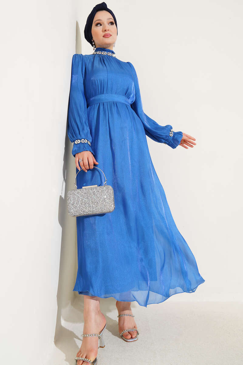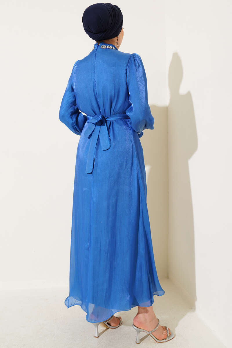 Bilek Bağlamalı Kuşaklı Abiye Elbise Lacivert