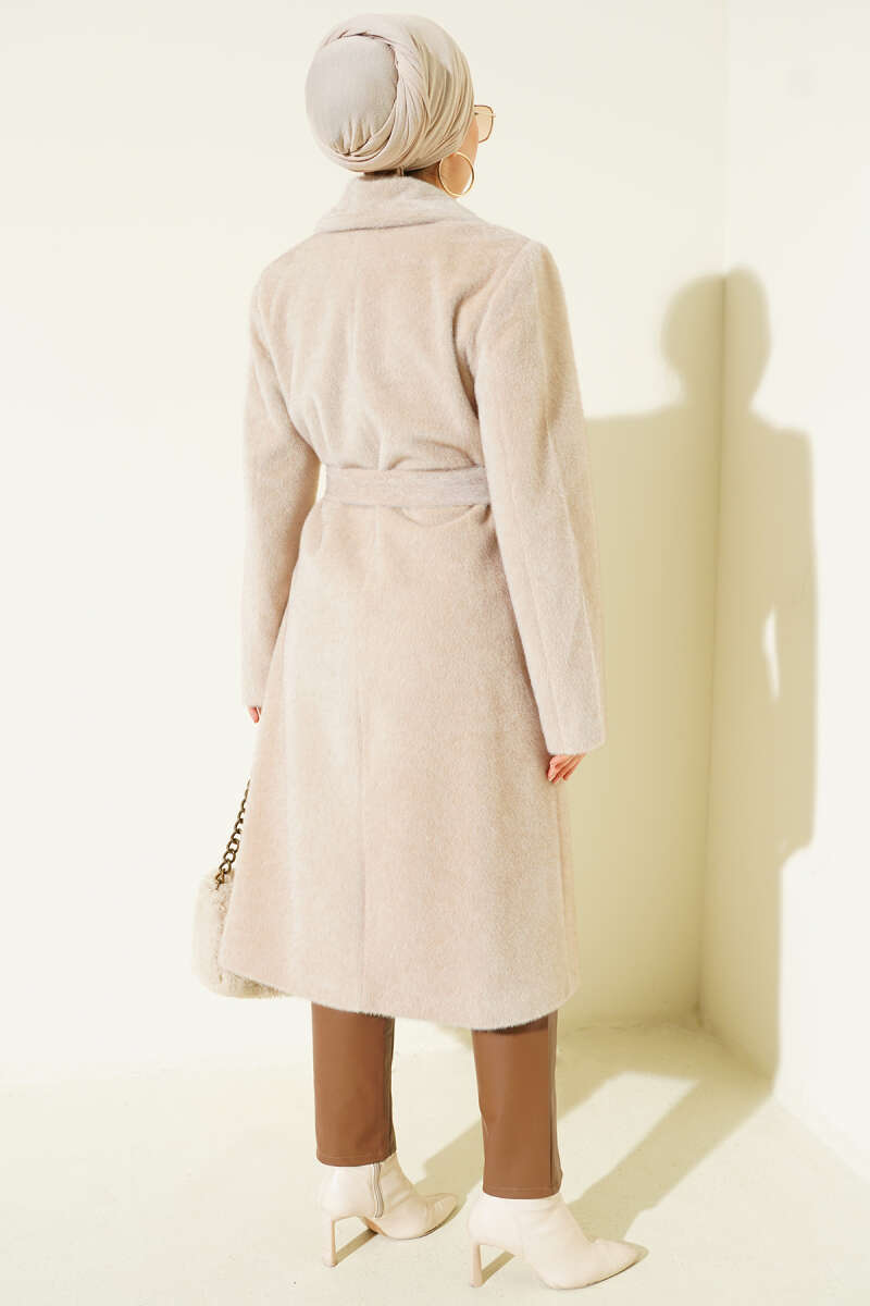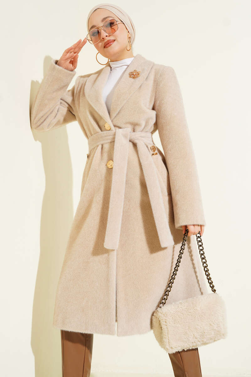 Gold Broşlu Cepli Kaşe Kaban Bej