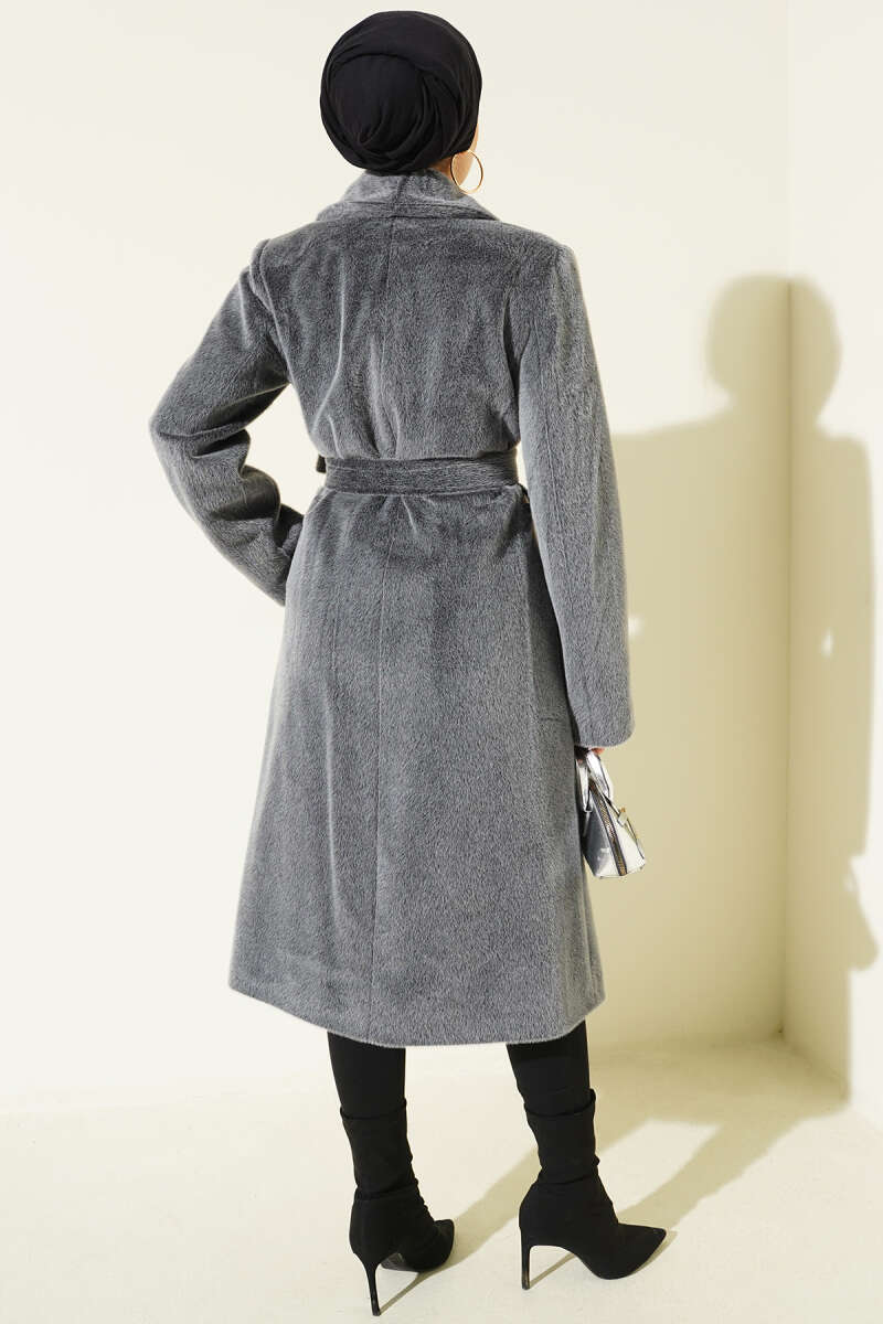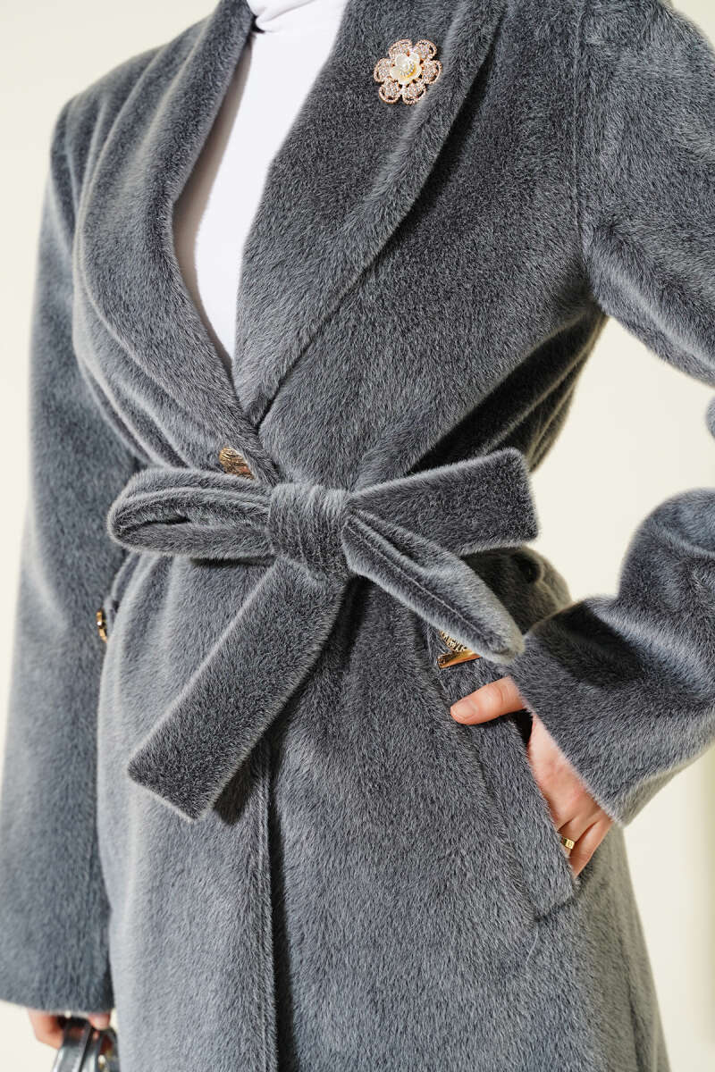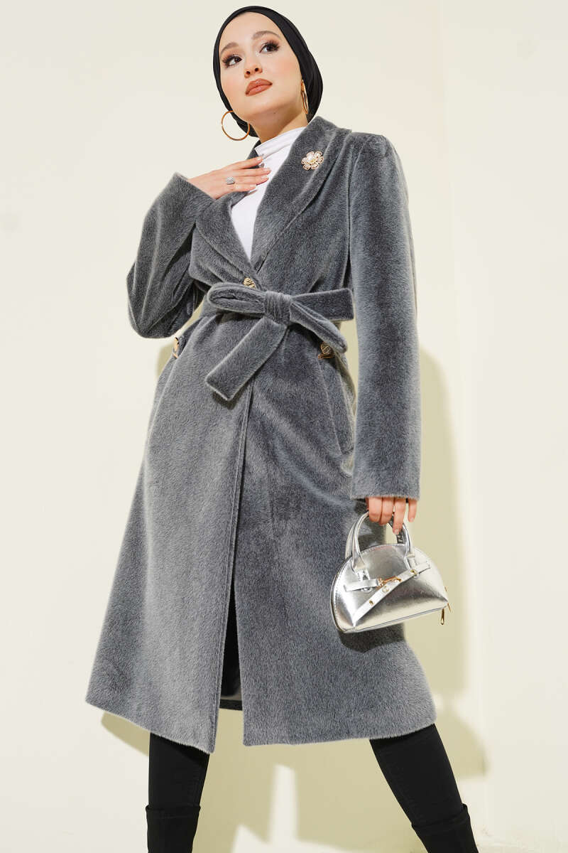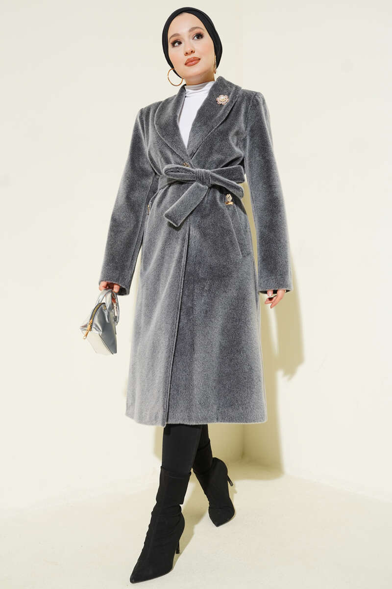 Gold Broşlu Cepli Kaşe Kaban Gri