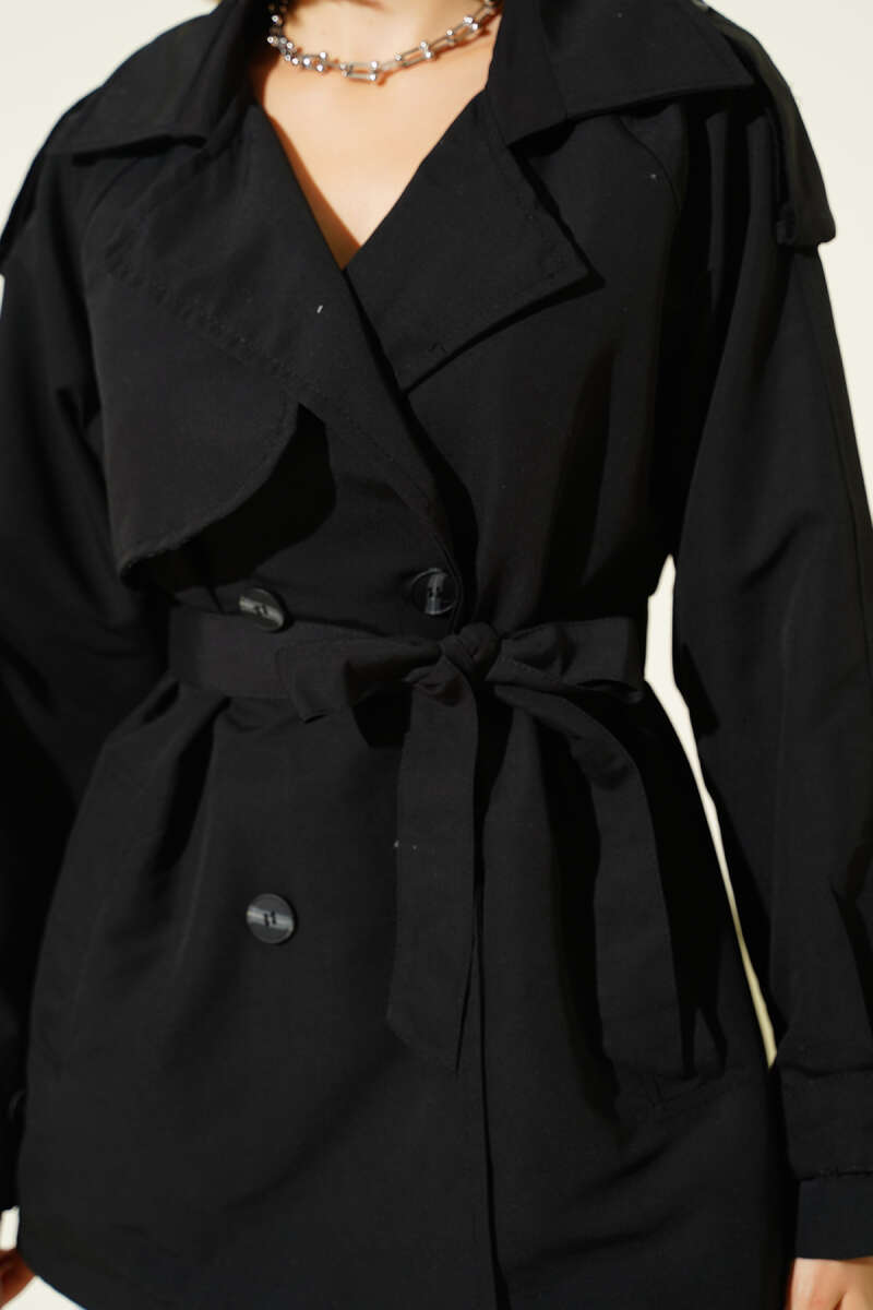 Kruvaze Yaka Kapitone Kuşaklı Mont Siyah