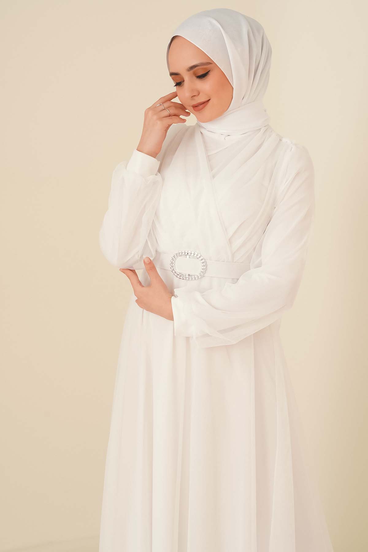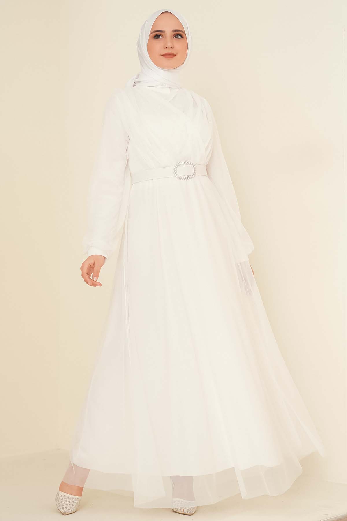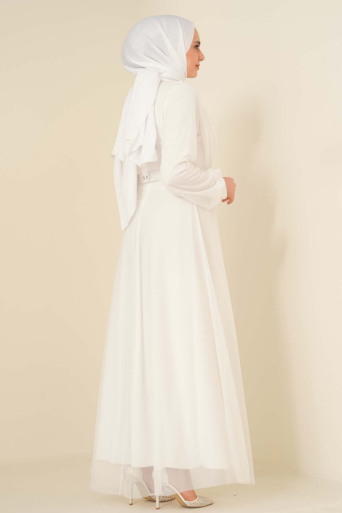 Kruvaze Tül Kemerli Elbise Beyaz