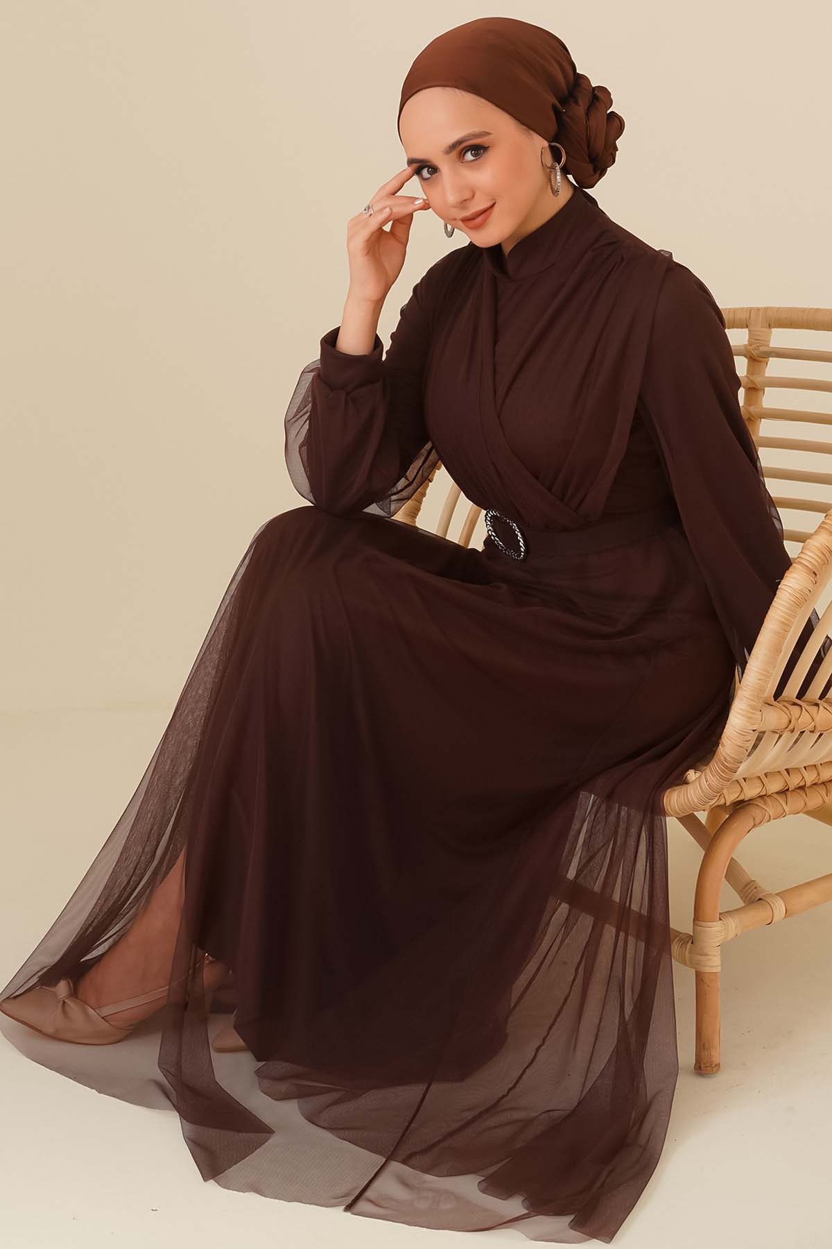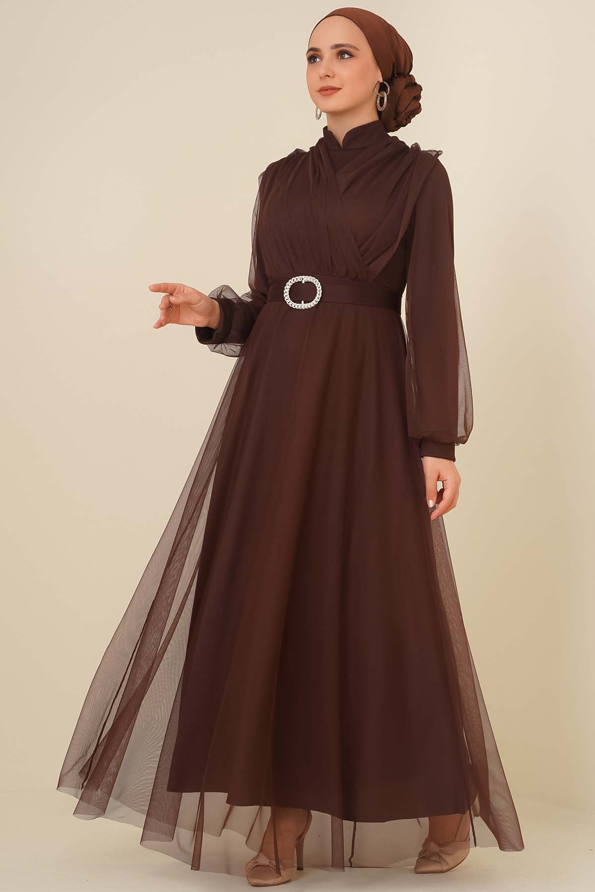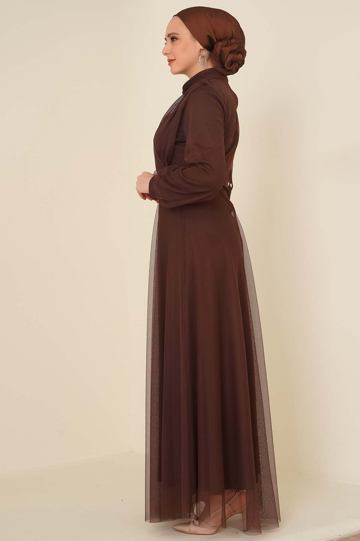 Kruvaze Tül Kemerli Elbise Kahve