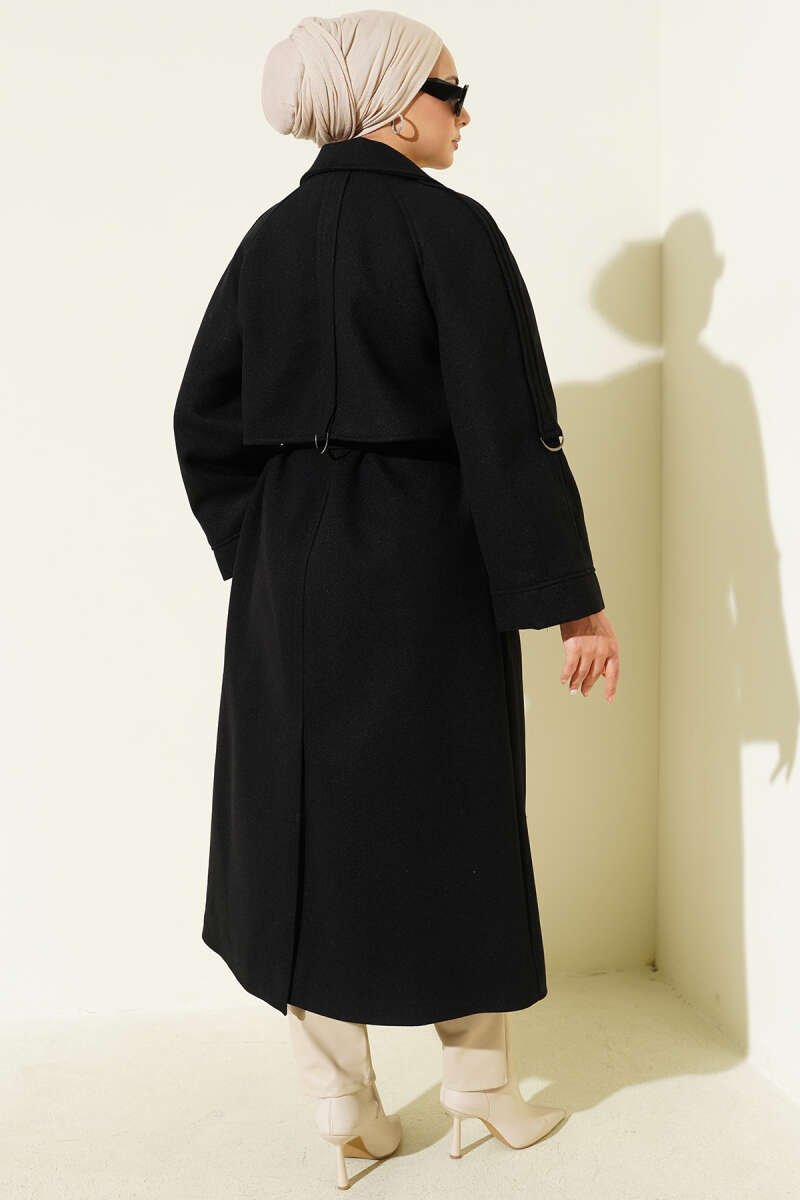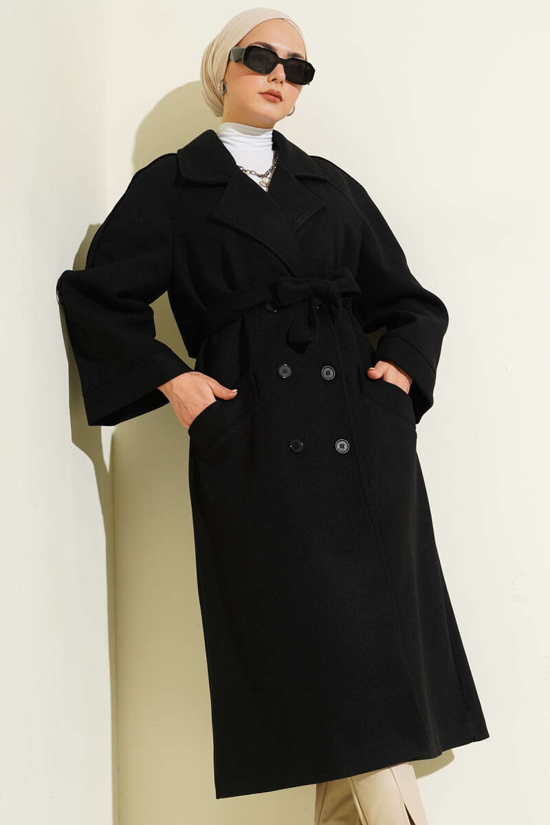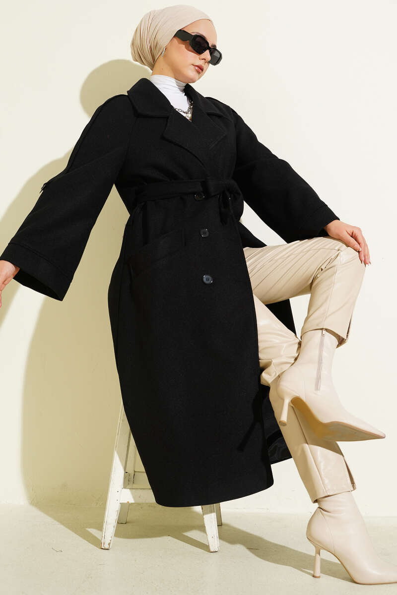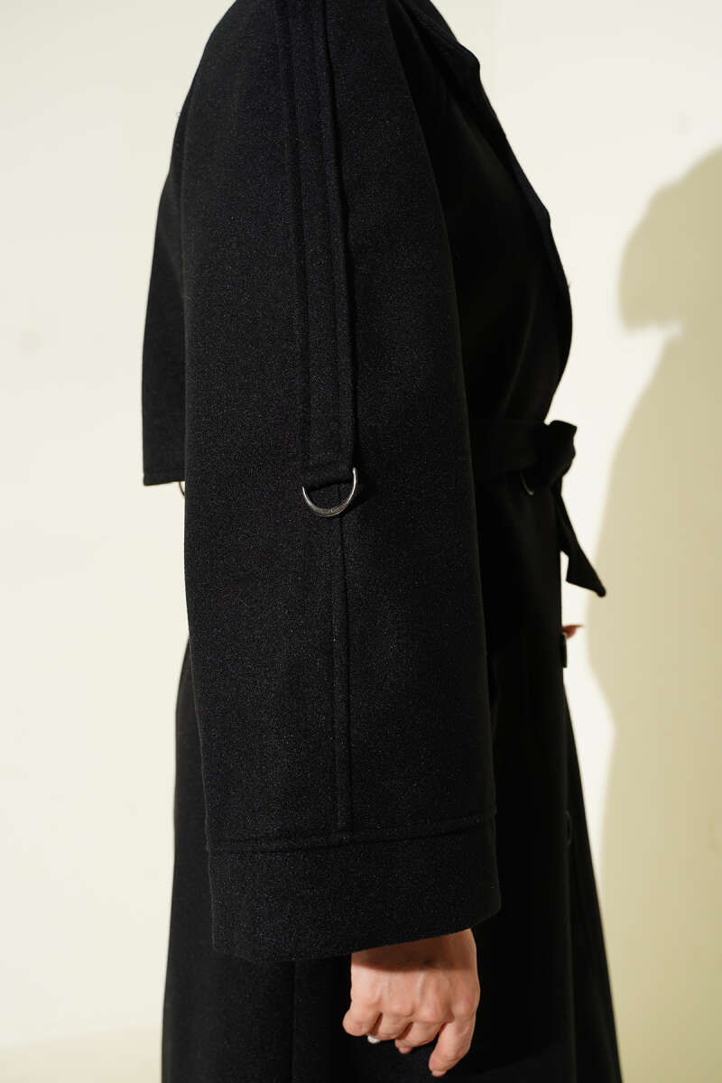 Kuşaklı Gold Düğmeli Kaşe Kaban Siyah