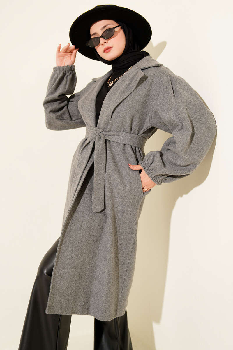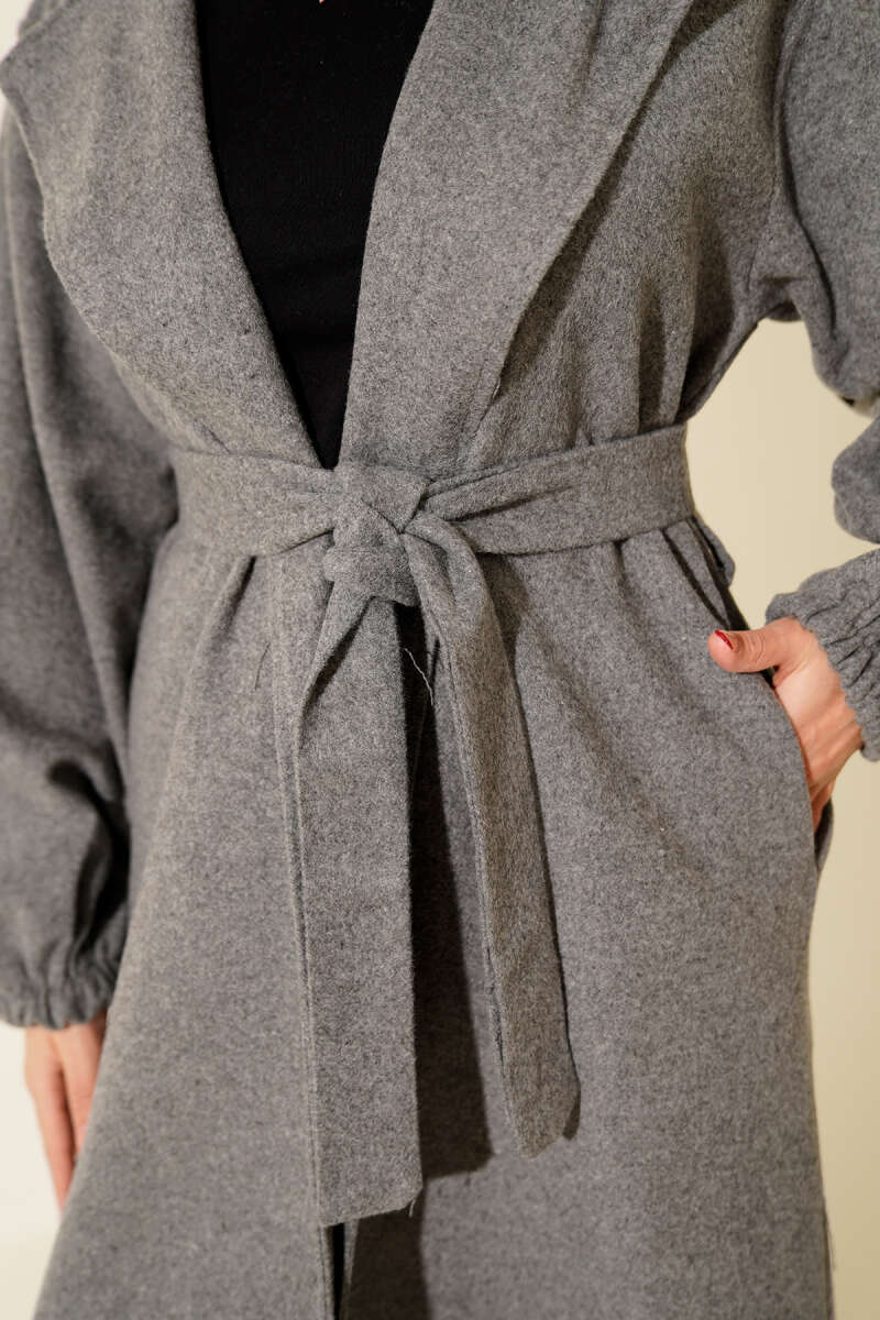 Kruvaze Yaka Belden Kuşaklı Kaban Gri